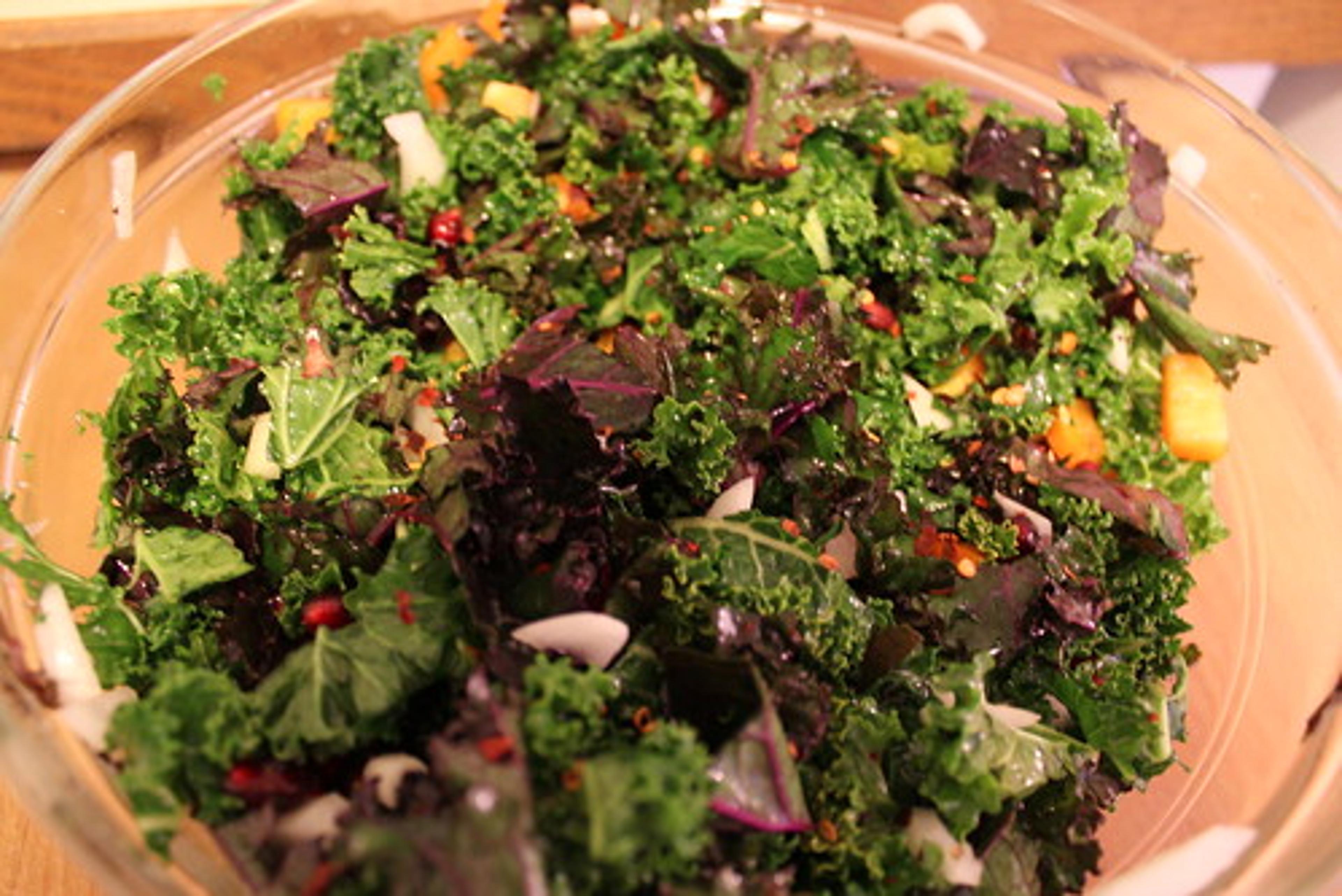 Aarti Sequeira from the Food Network (in her pre-prime time days) does a very funny yet informative demonstration video on kale salad preparation and massaging in the video below: