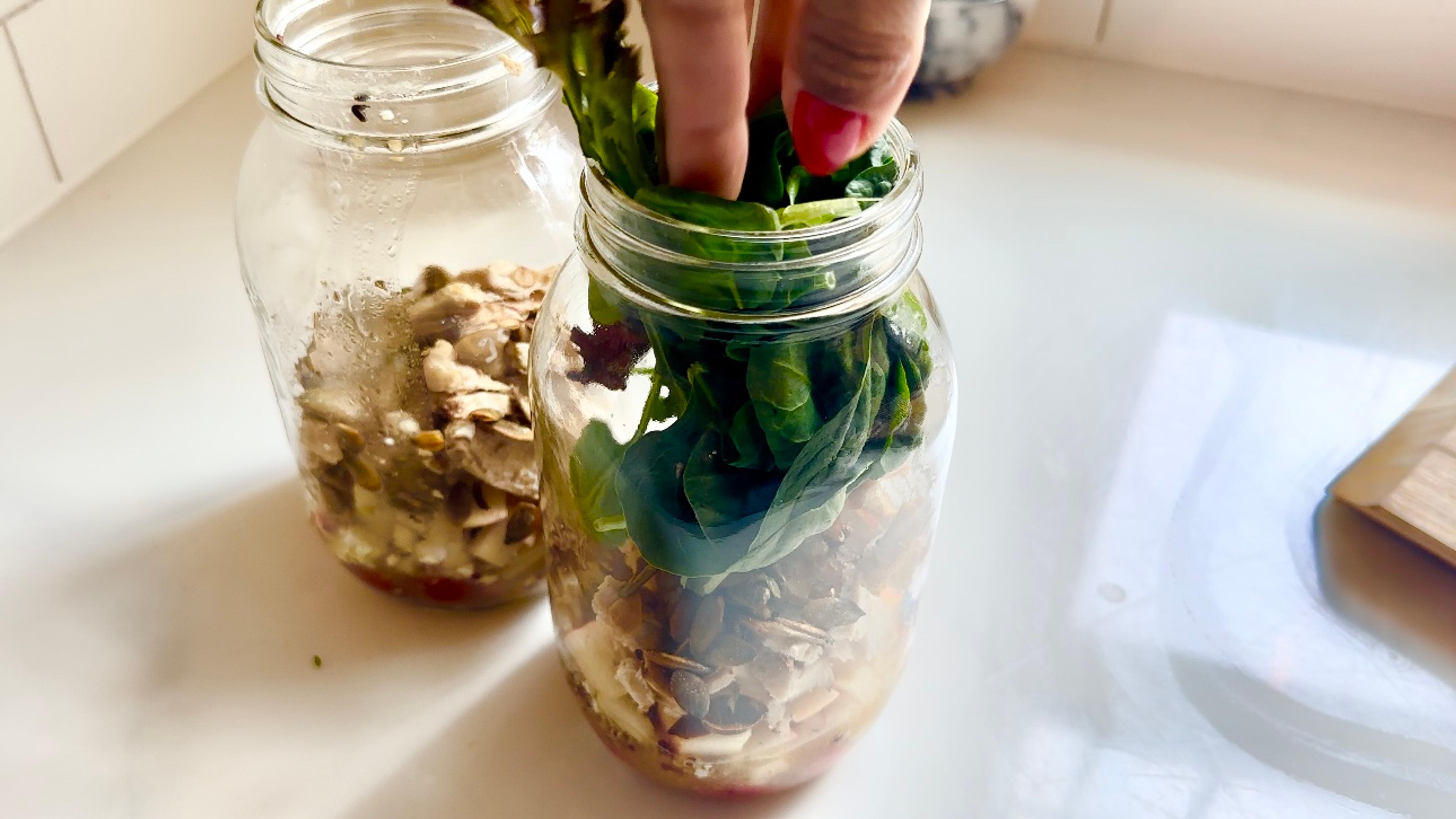 Try to keep the jar in an upright position before serving to avoid the dressing coming in contact with the salad greens to maintain freshness. When ready to serve, simply leave the lid on and shake.