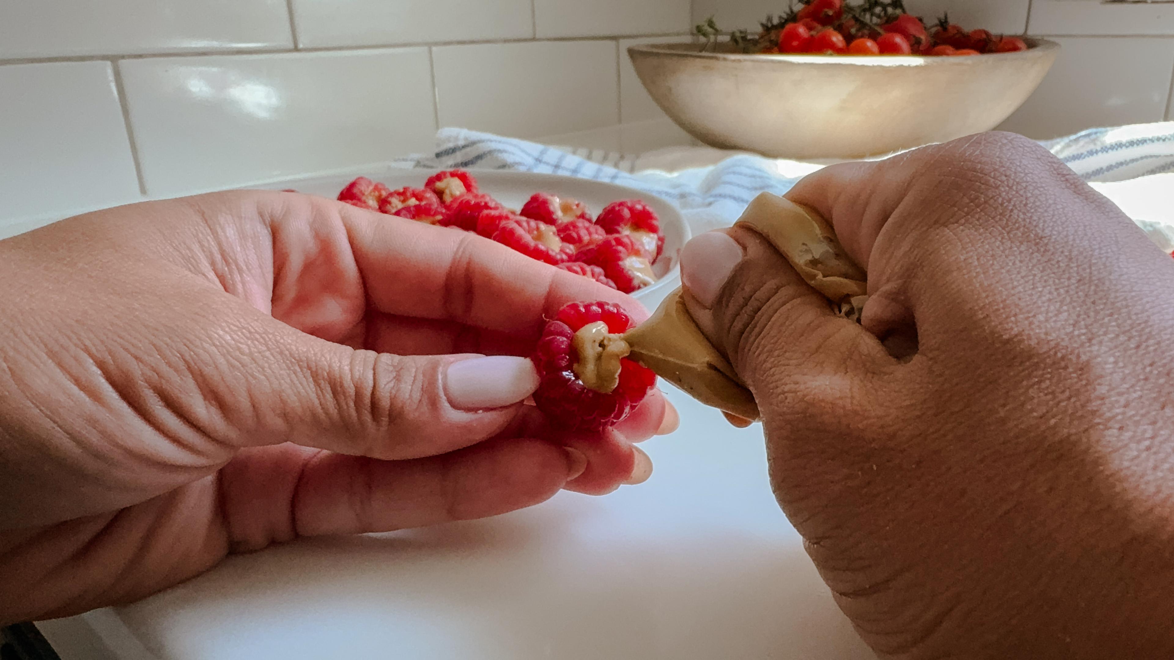 Add almond butter to a small zip plastic bag. Cut off a small corner and fill raspberries.