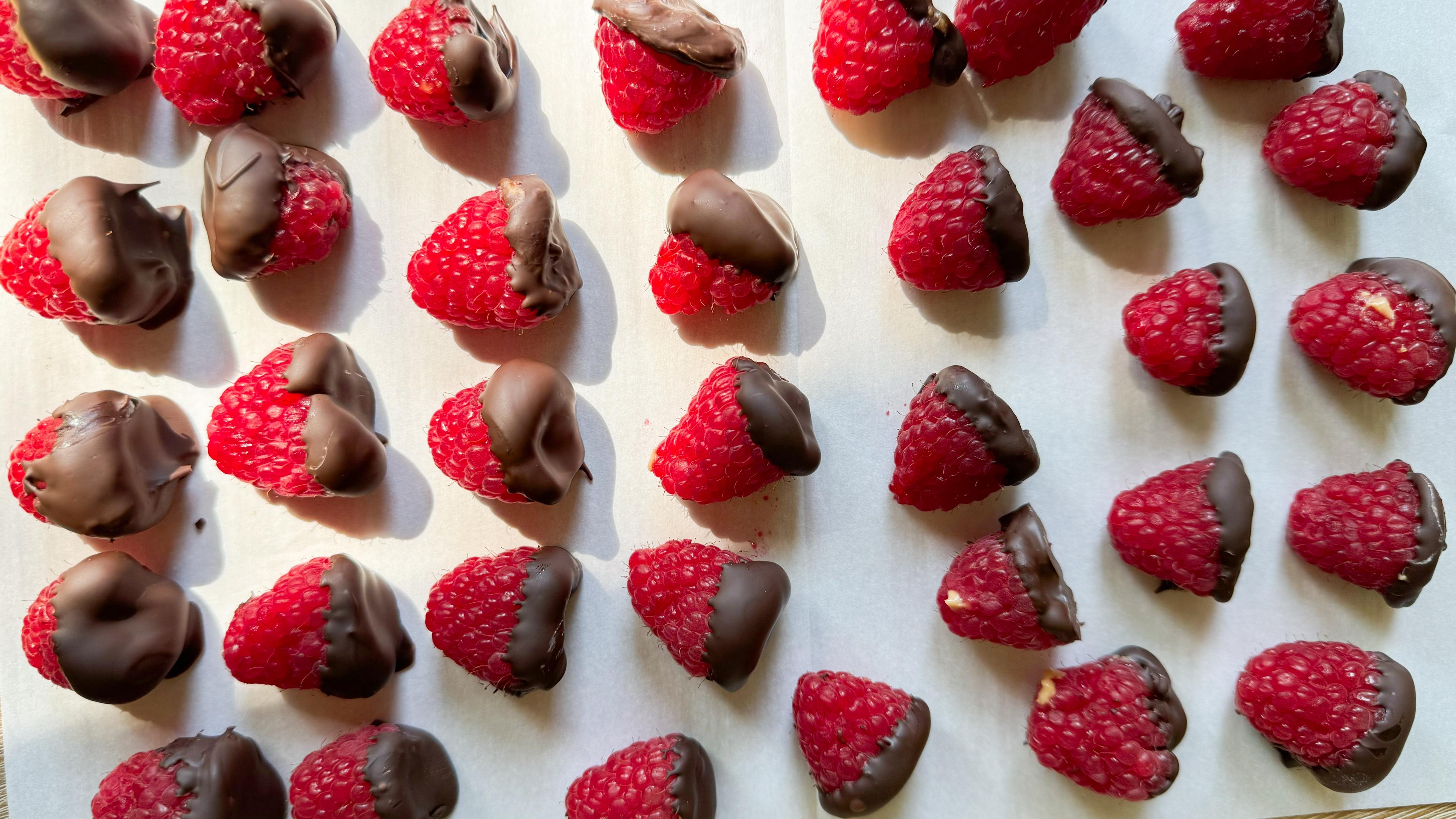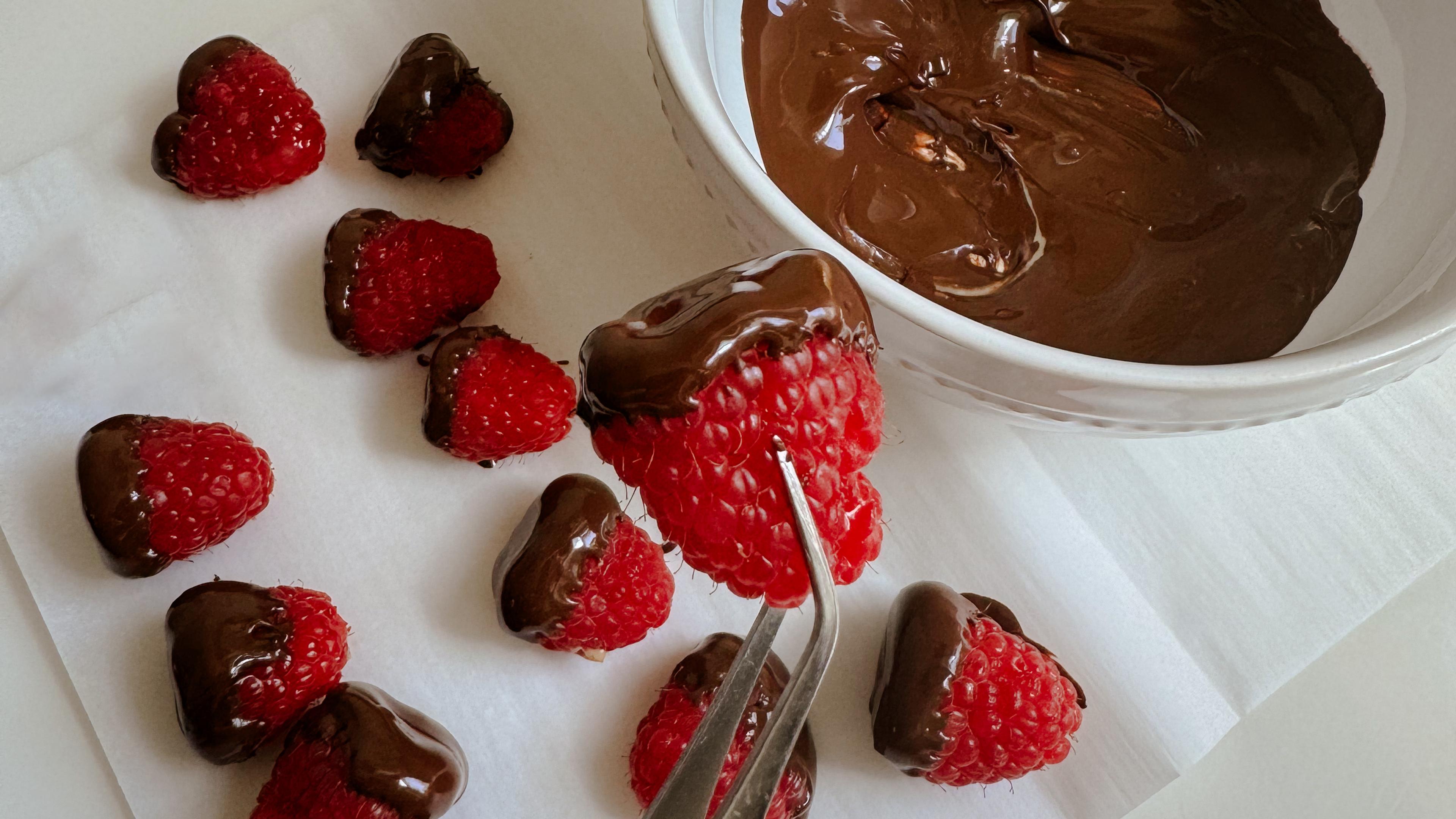 When chocolate is thoroughly melted, dip the raspberries in the chocolate and place on parchment paper until chocolate has hardened. Then add the bites to a storage container and freeze until solid, about 3-4 hours.
