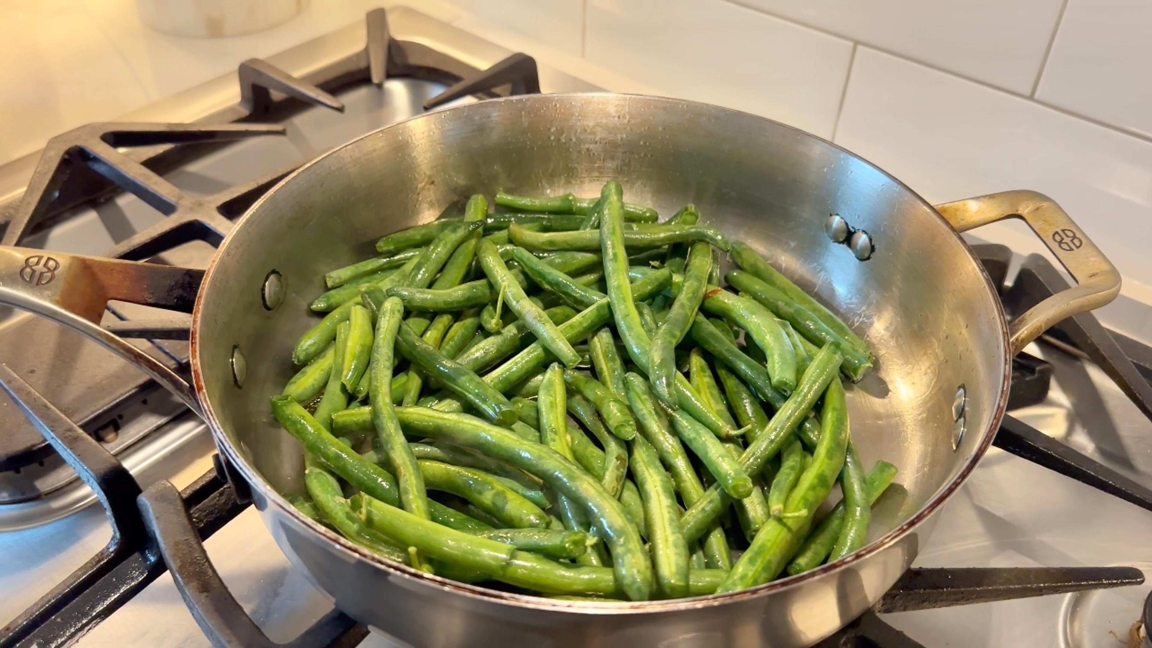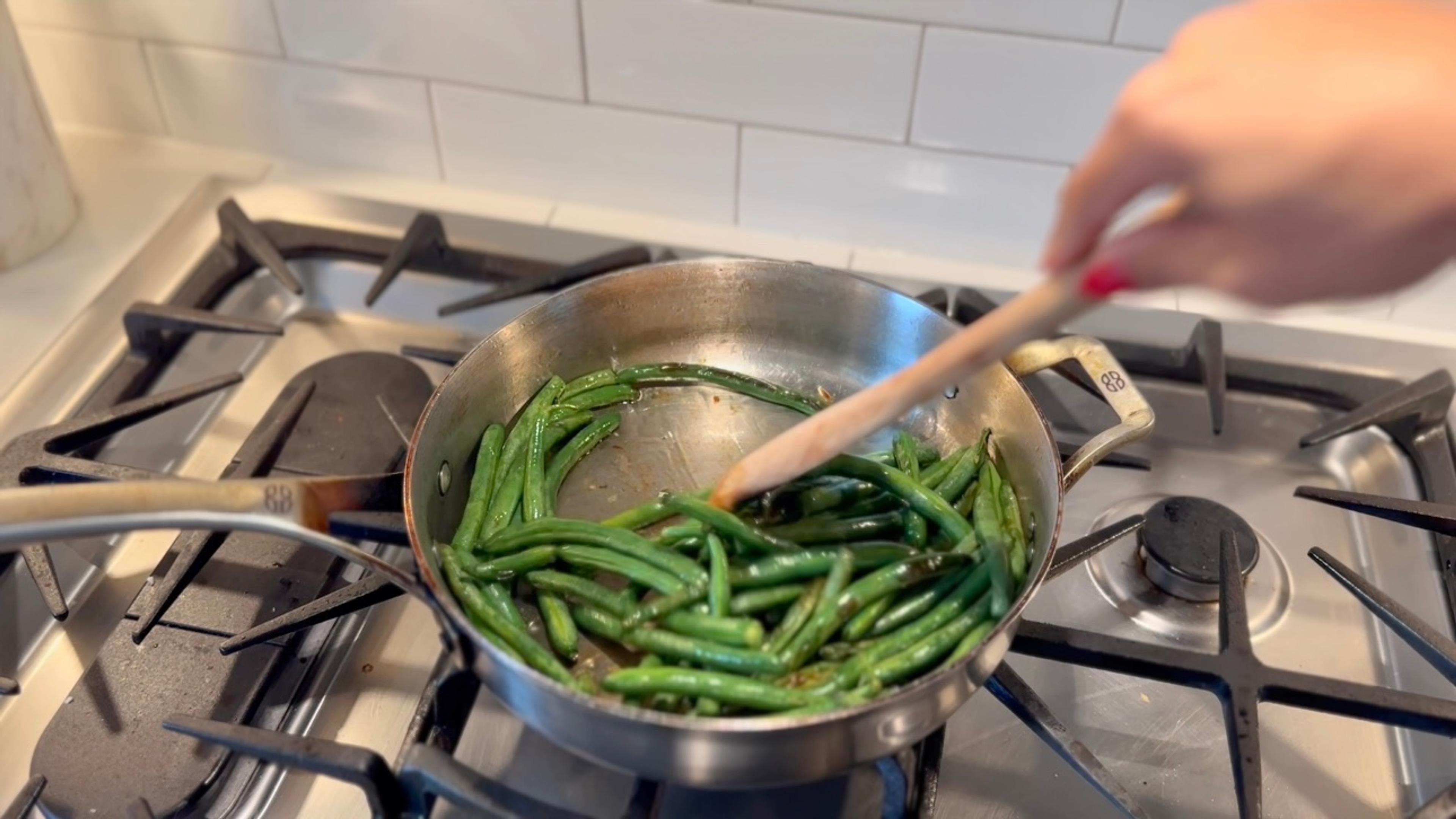 In a large pan over medium heat, heat 2 Tbsp. olive oil. Once oil is hot, add green beans and sear for about 5-7 minutes, stirring occasionally.