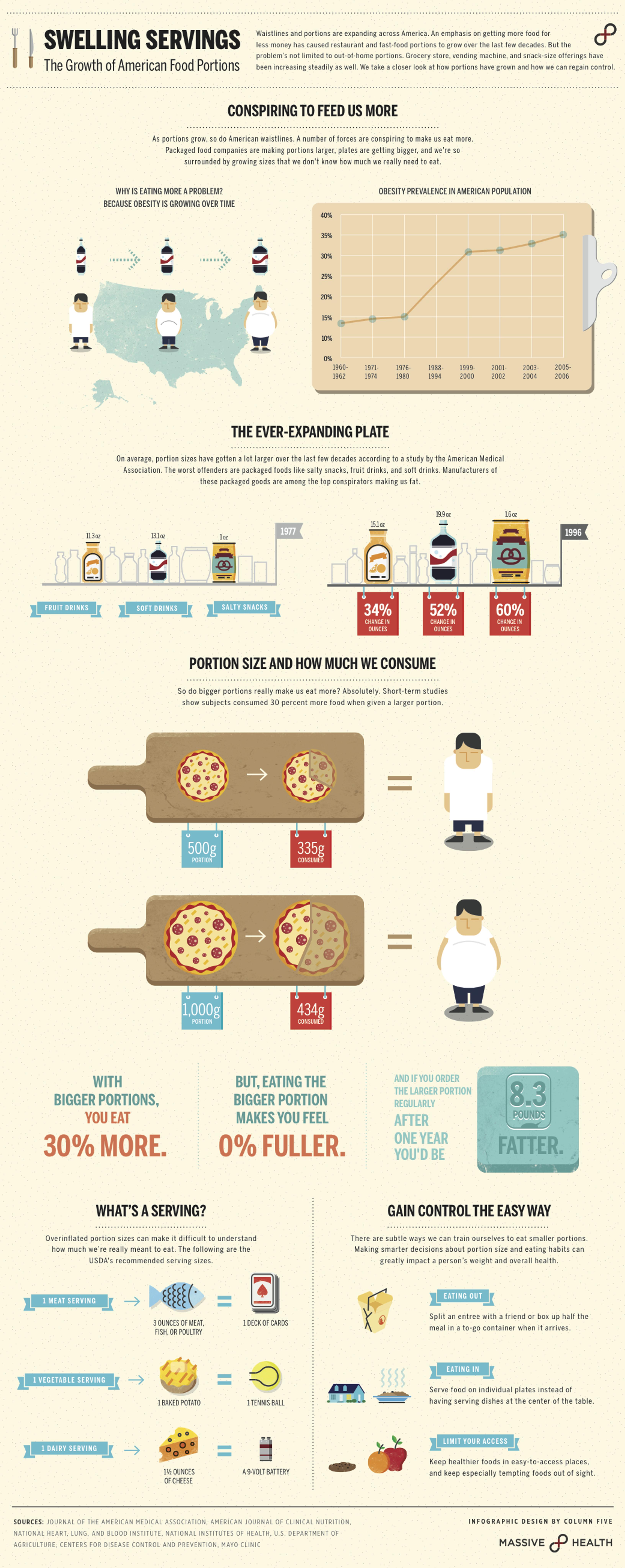 I found this interesting infographic, below, by Massive Health that explains the issue of portion control and suggests some steps to help you cut back and be more realistic about how much you are eating. (View a larger version here.)