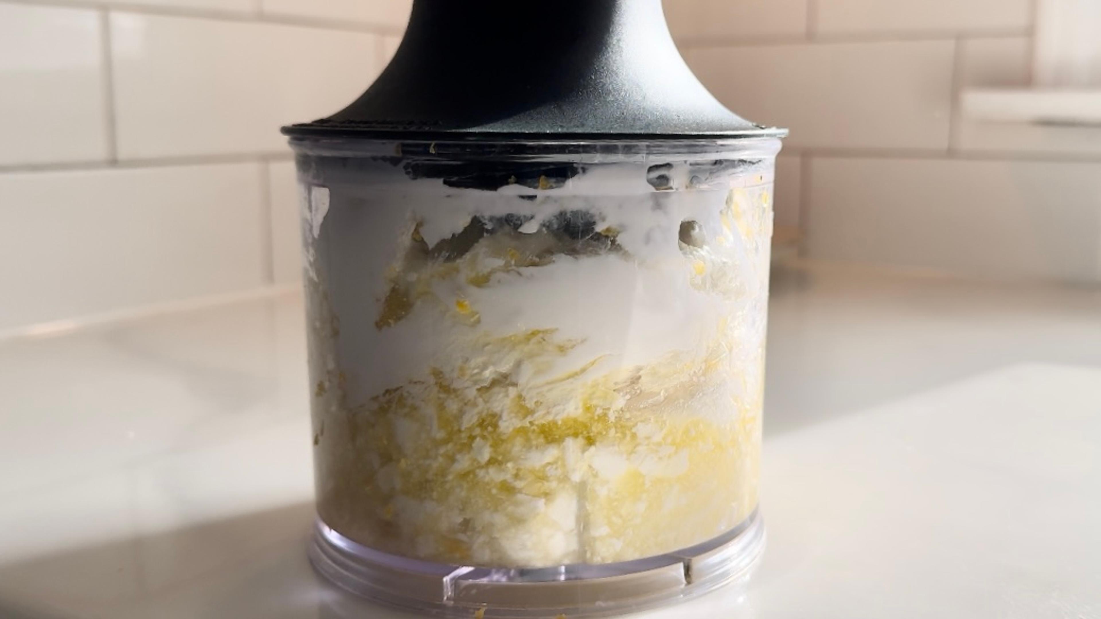 Add feta crumbles, Greek yogurt, lemon zest to a food processor. Pulse until combined. Slowly stream remaining olive oil into mixture and blend until creamy and smooth.