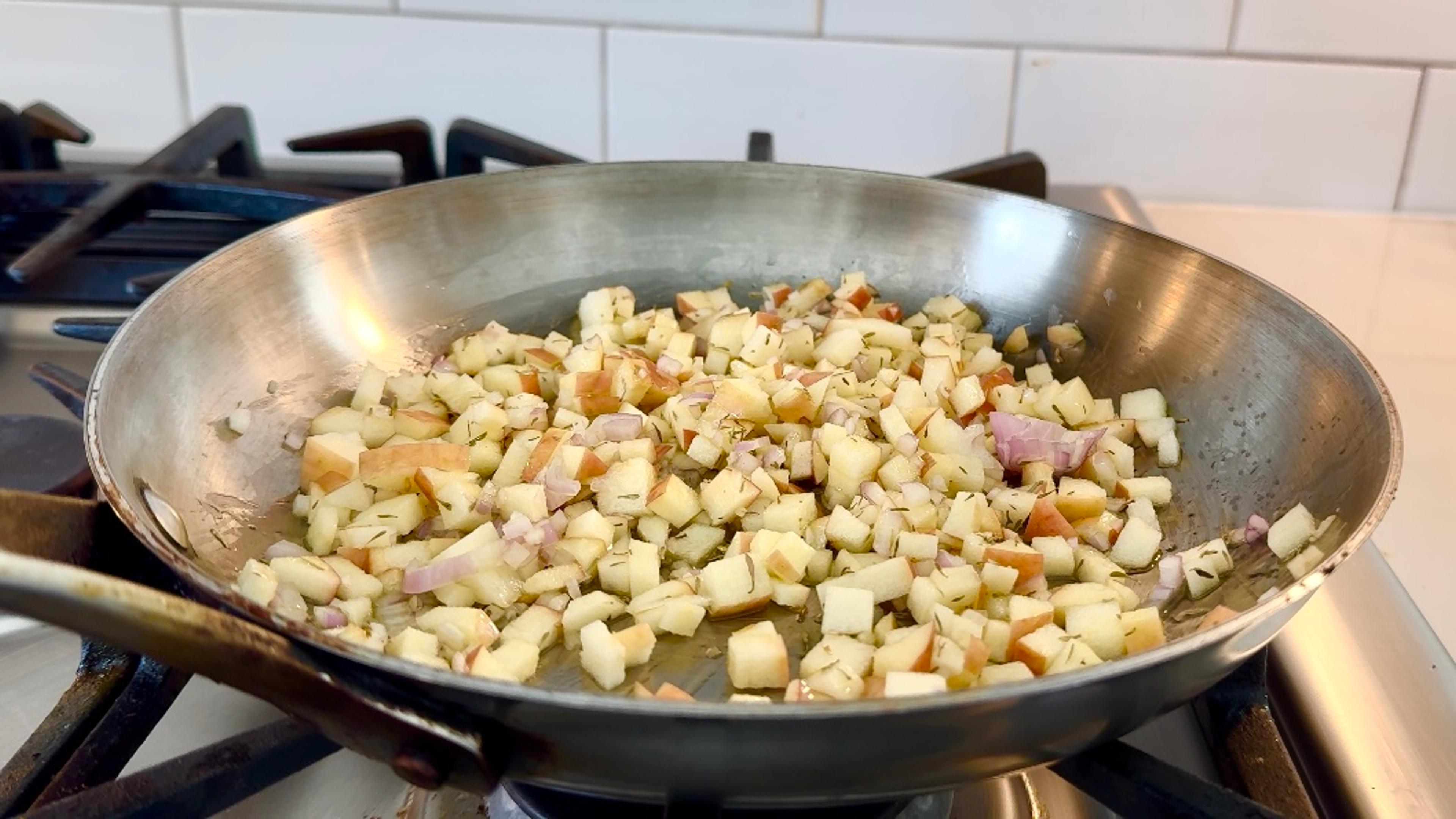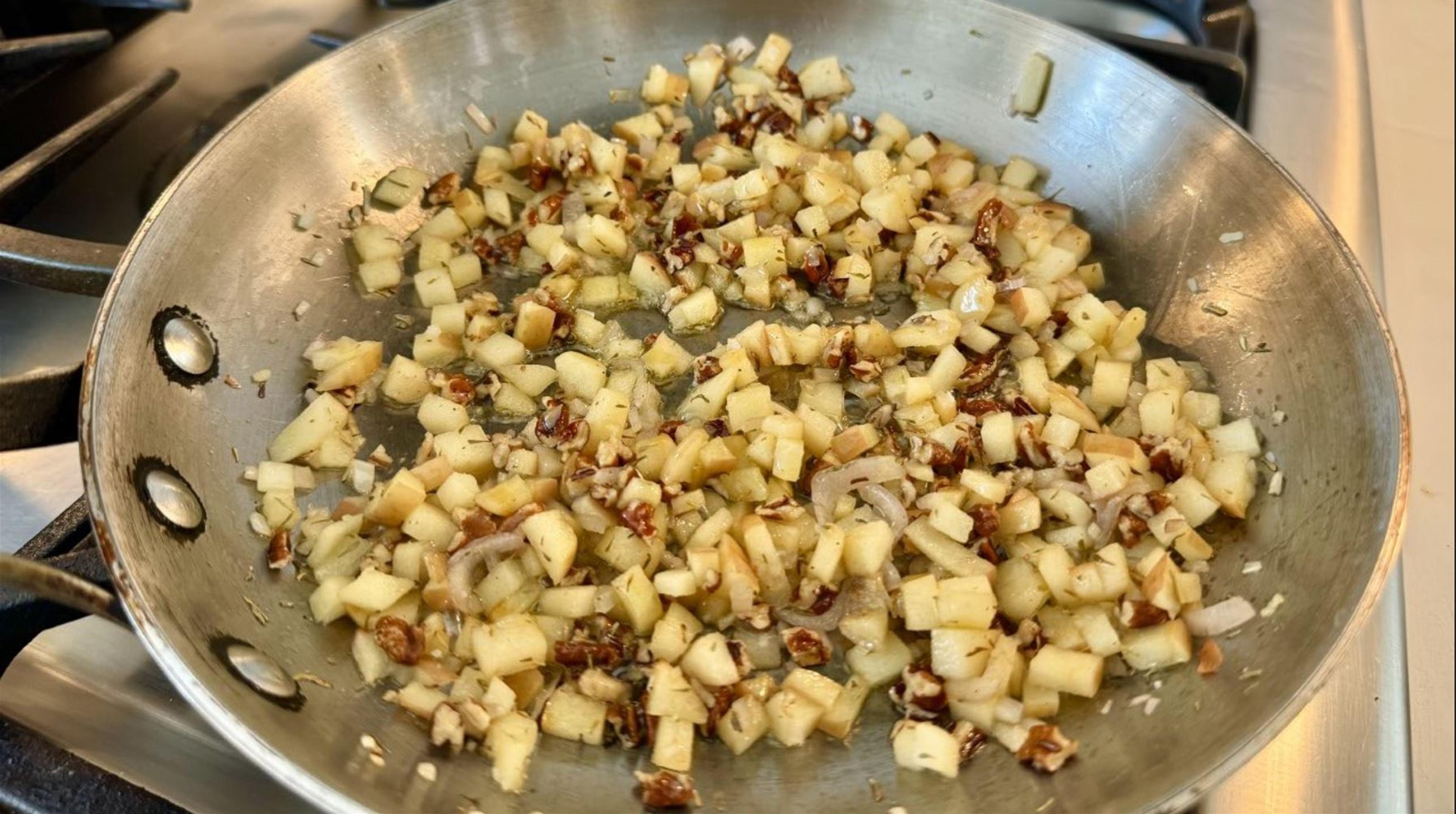 Add pecans. Continue cooking for 5 minutes until apples are lightly caramelized. Season with salt to taste. Turn off heat and set mixture aside in a bowl to cool.