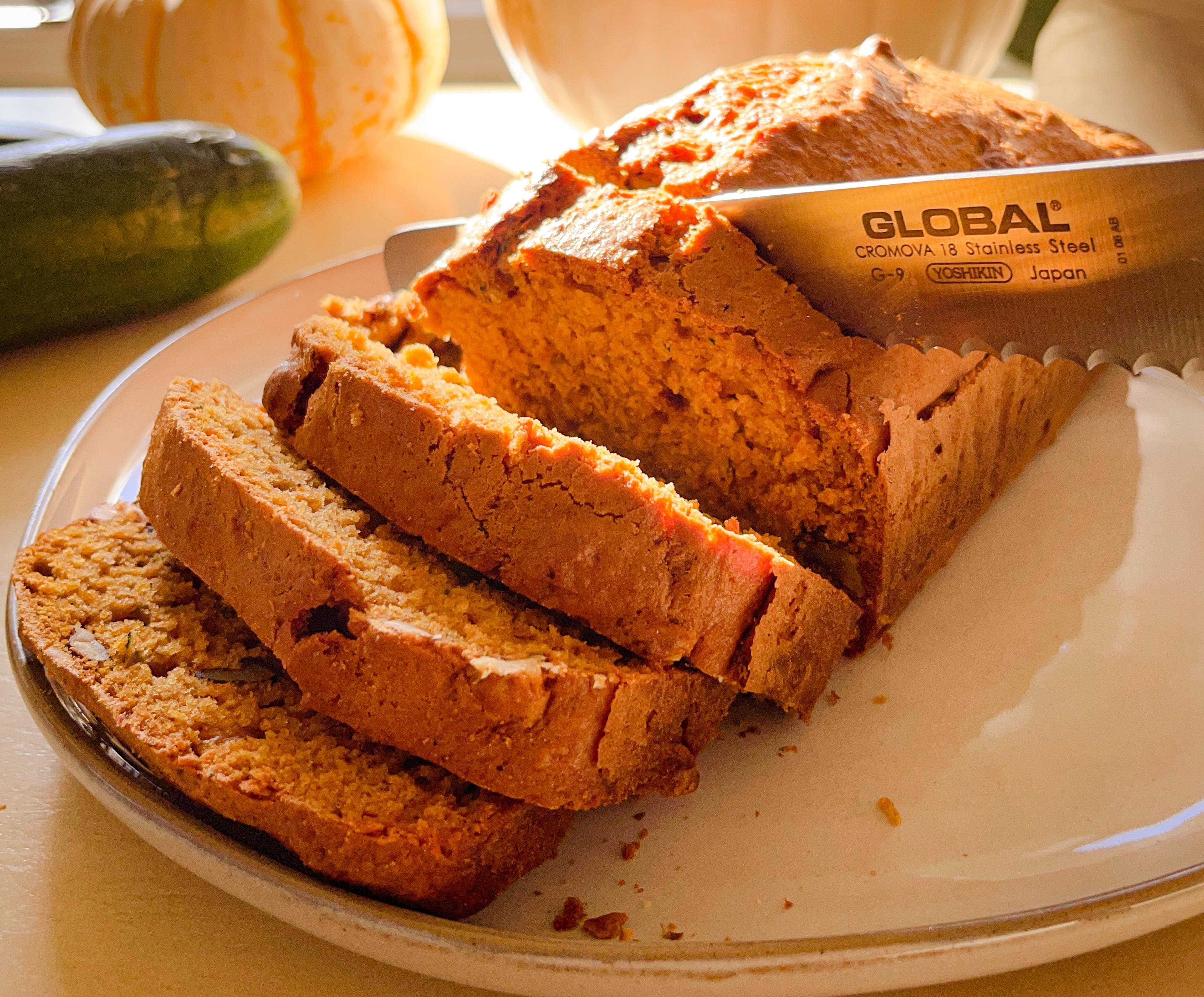 This delicious, spiced quick bread uses two vegetables - pumpkins and zucchinis. The recipe is based on a Taste of Home version, but with half of the butter substituted with applesauce to boost the nutrition and moisture.