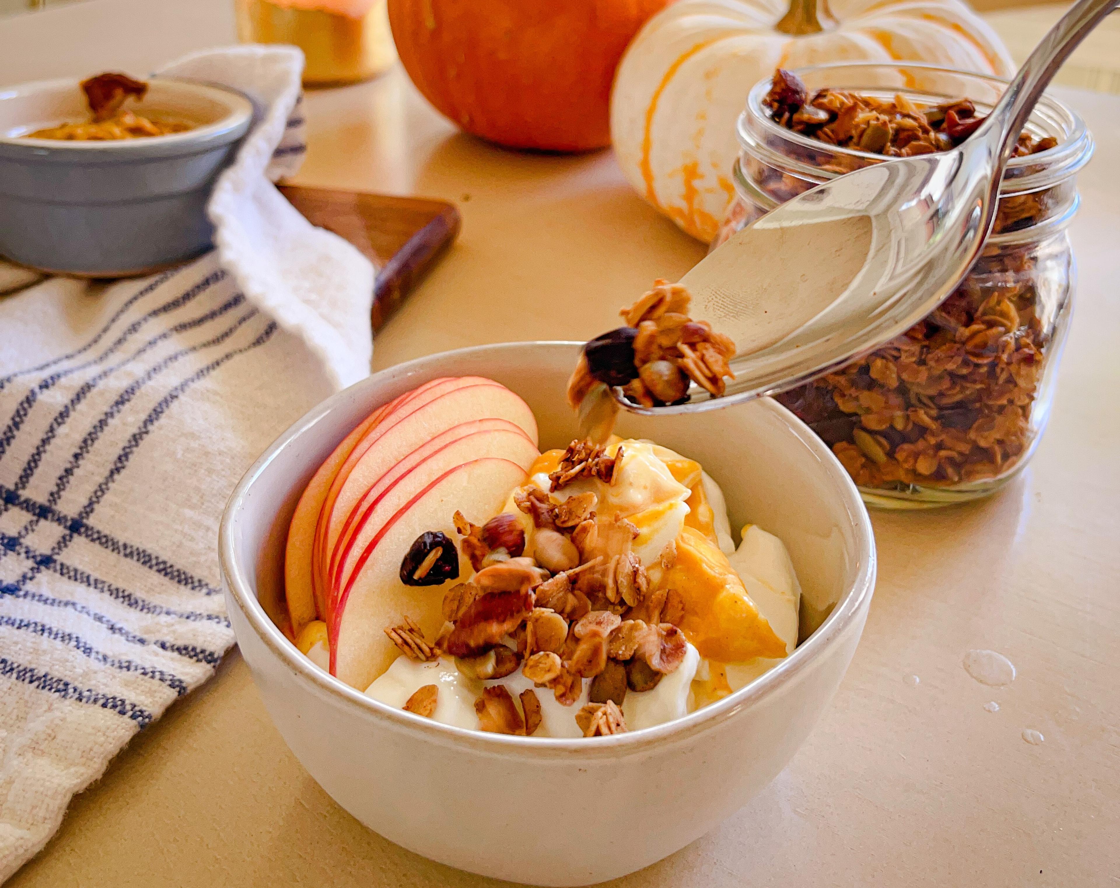 This recipe uses a wholesome mix of pumpkin seeds, pecans and dried cranberries to make a delicious, healthy and homemade granola. It can be eaten on its own as a snack or as a topping for a yogurt parfait or smoothie bowl.