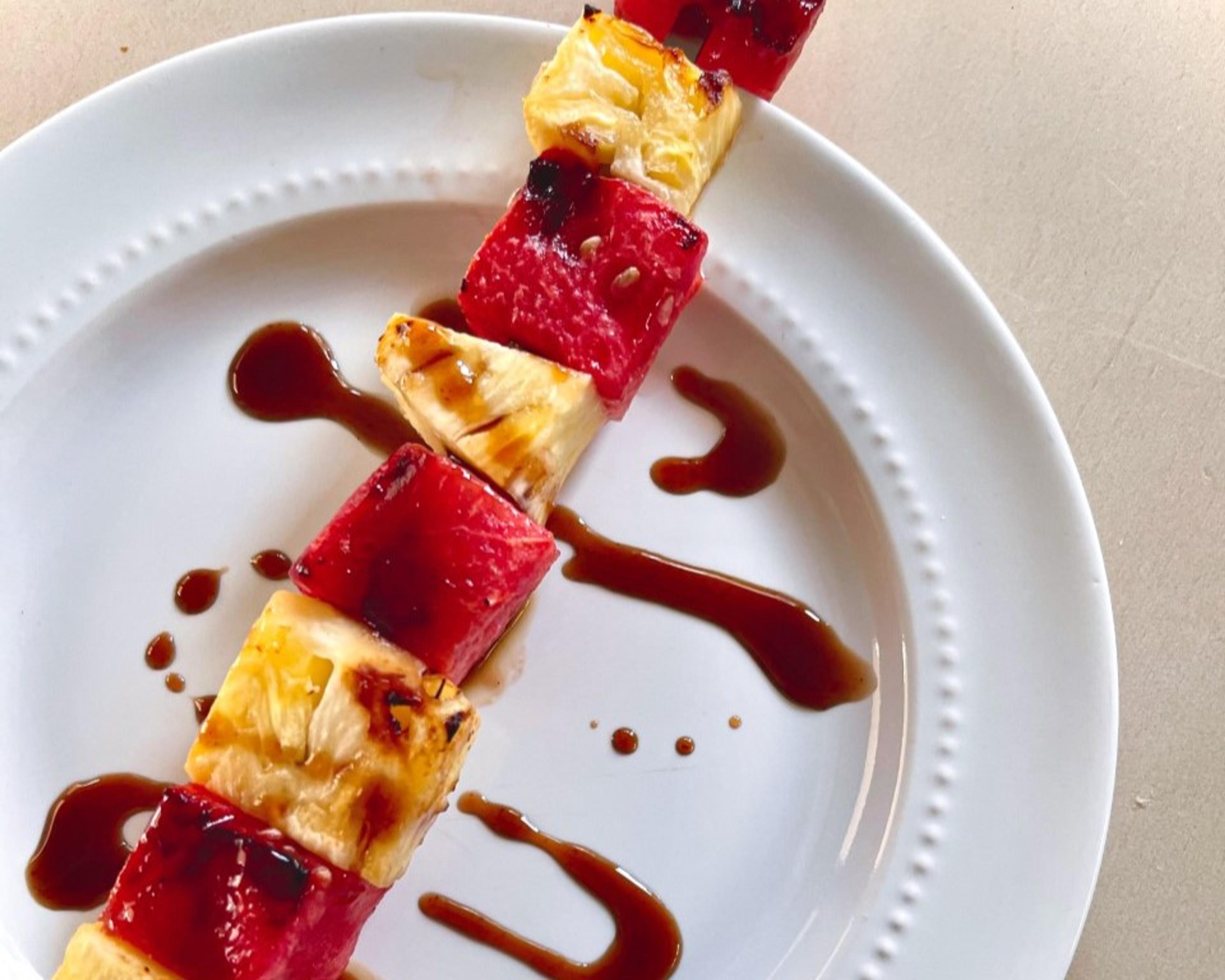 This easy and visually appealing dessert uses cubes of watermelon and pineapple. After several minutes on the grill, top it off with a balsamic reduction and a scoop of vanilla ice cream for a taste of summer.