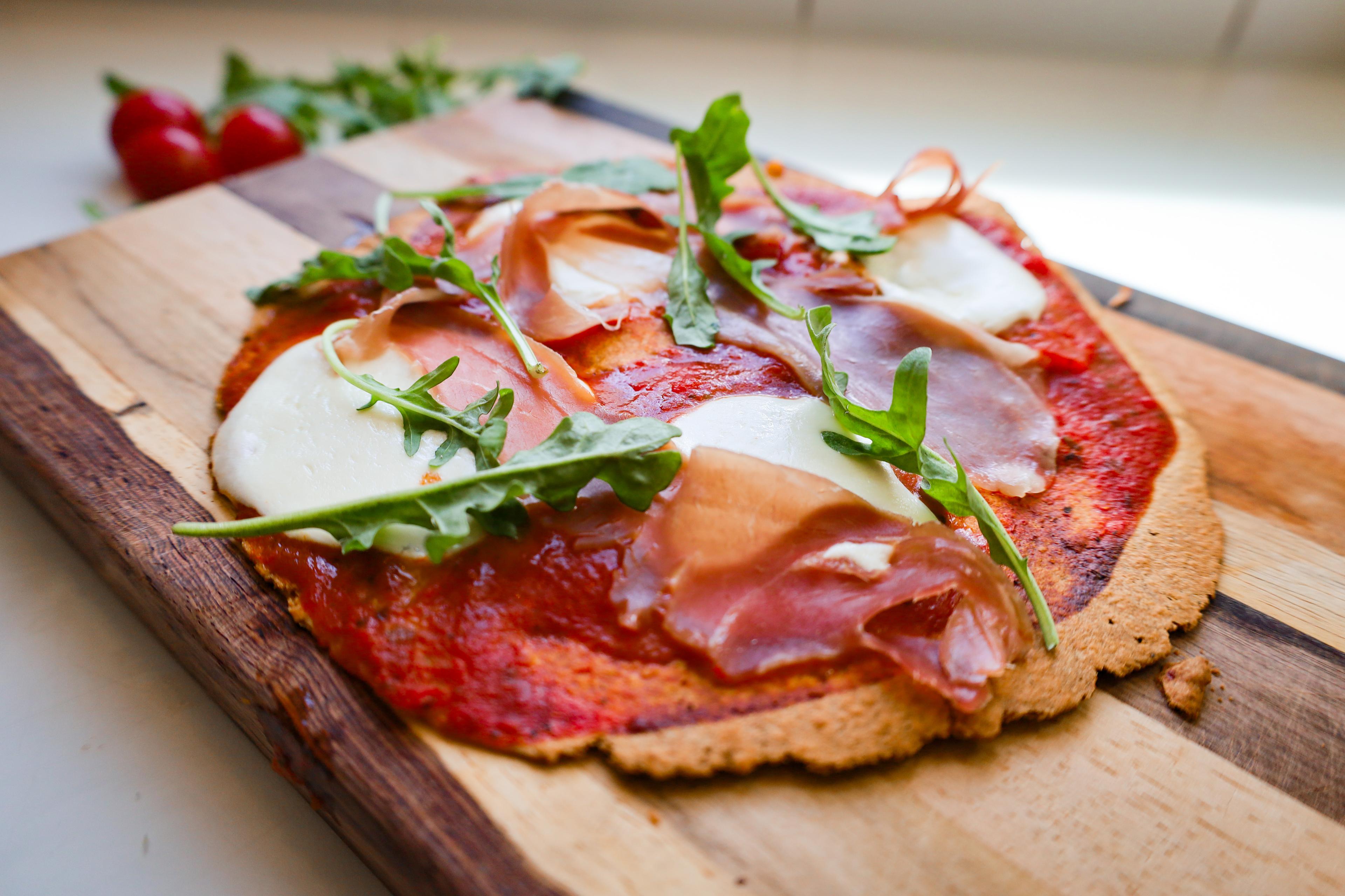 This pizza uses familiar Italian flavors – sauce, prosciutto, sliced mozzarella and arugula top this delicious and easy meal.