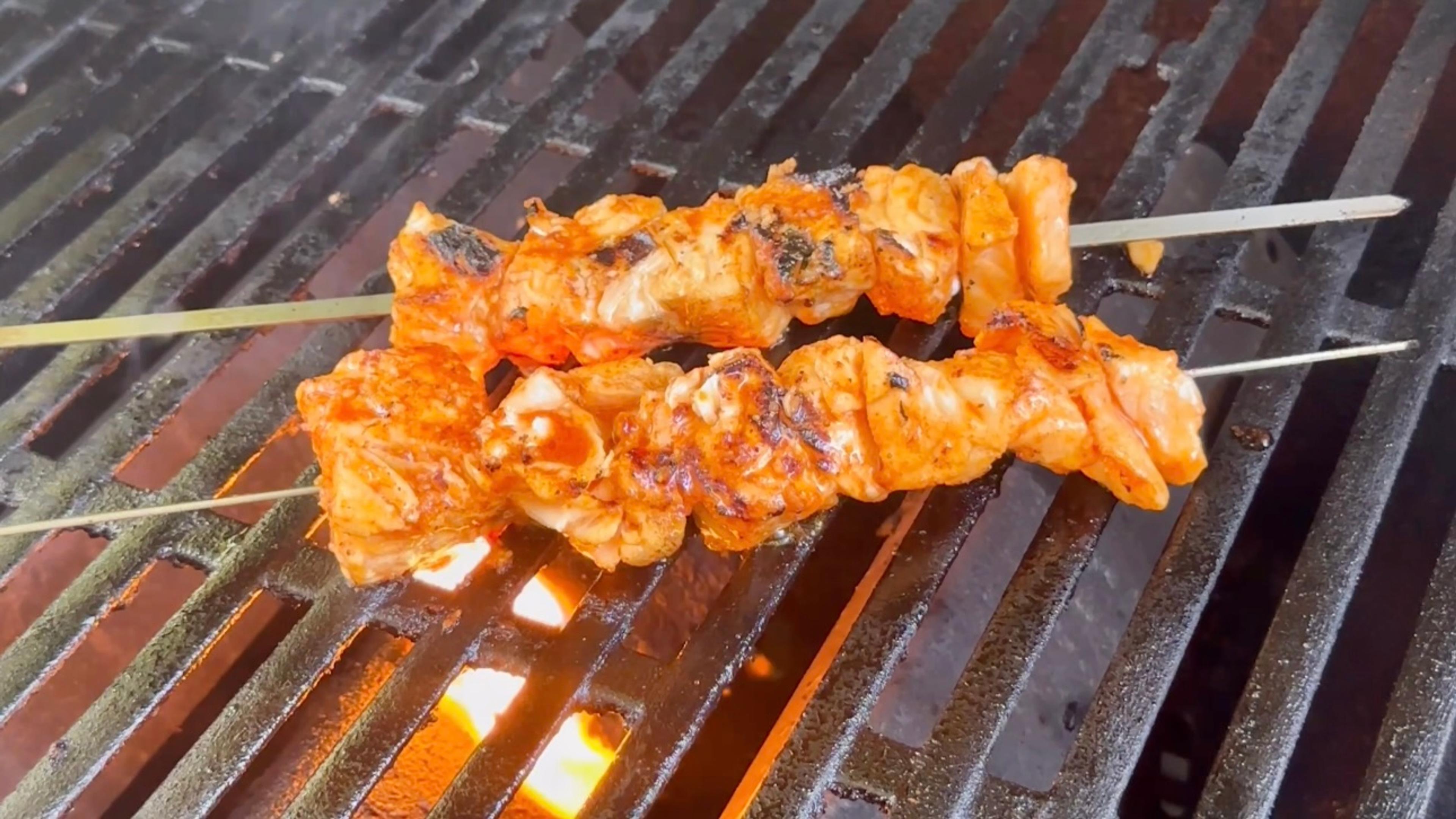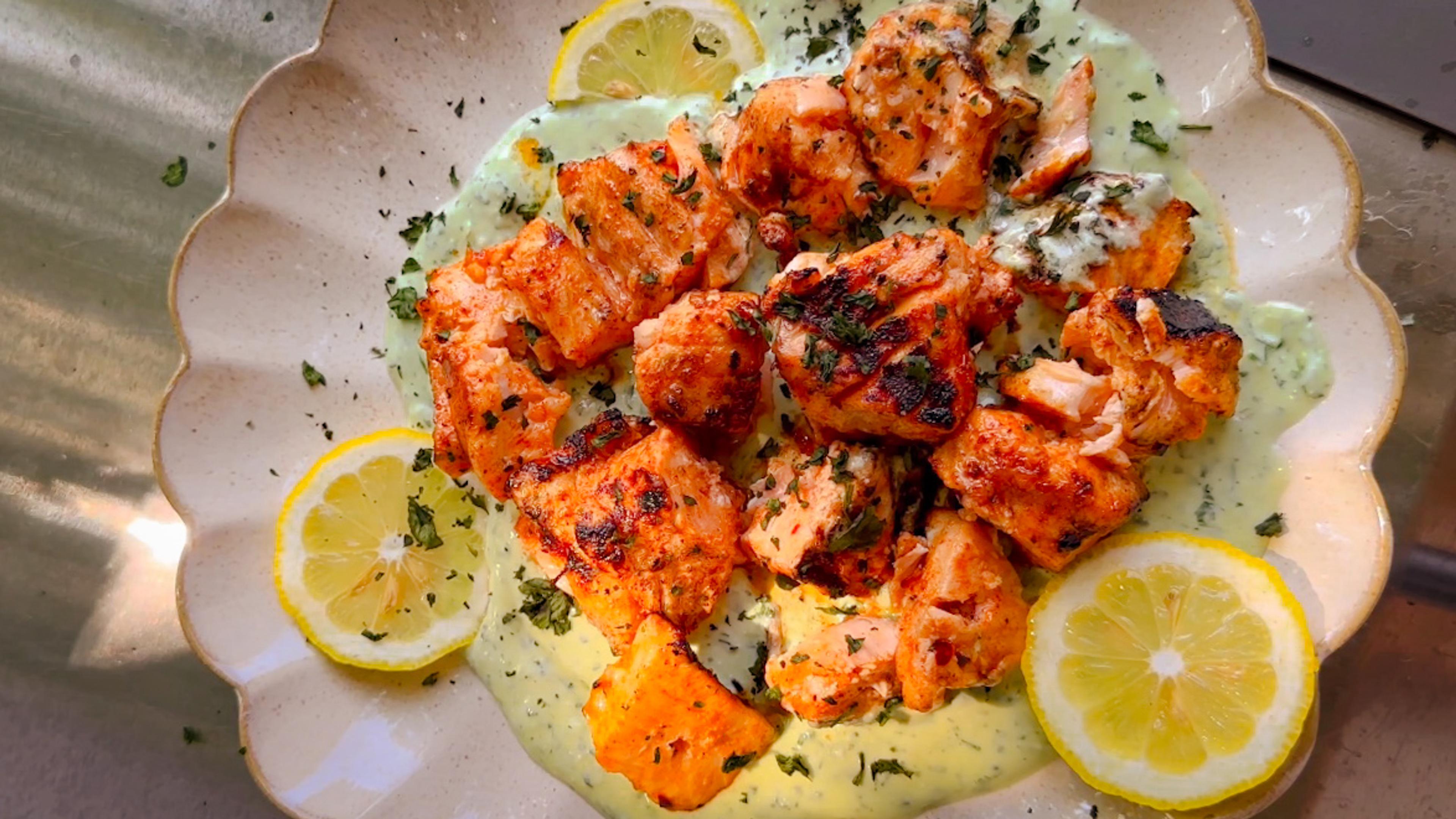 While the feta is chilling, grill the salmon. Place the salmon pieces on skewers. Spray the grill grates with oil. Add salmon skewers and grill on two sides for about 3-4 minutes each or until it has reached desired internal temperature. The salmon will be tender and not dry around 130 degrees F.