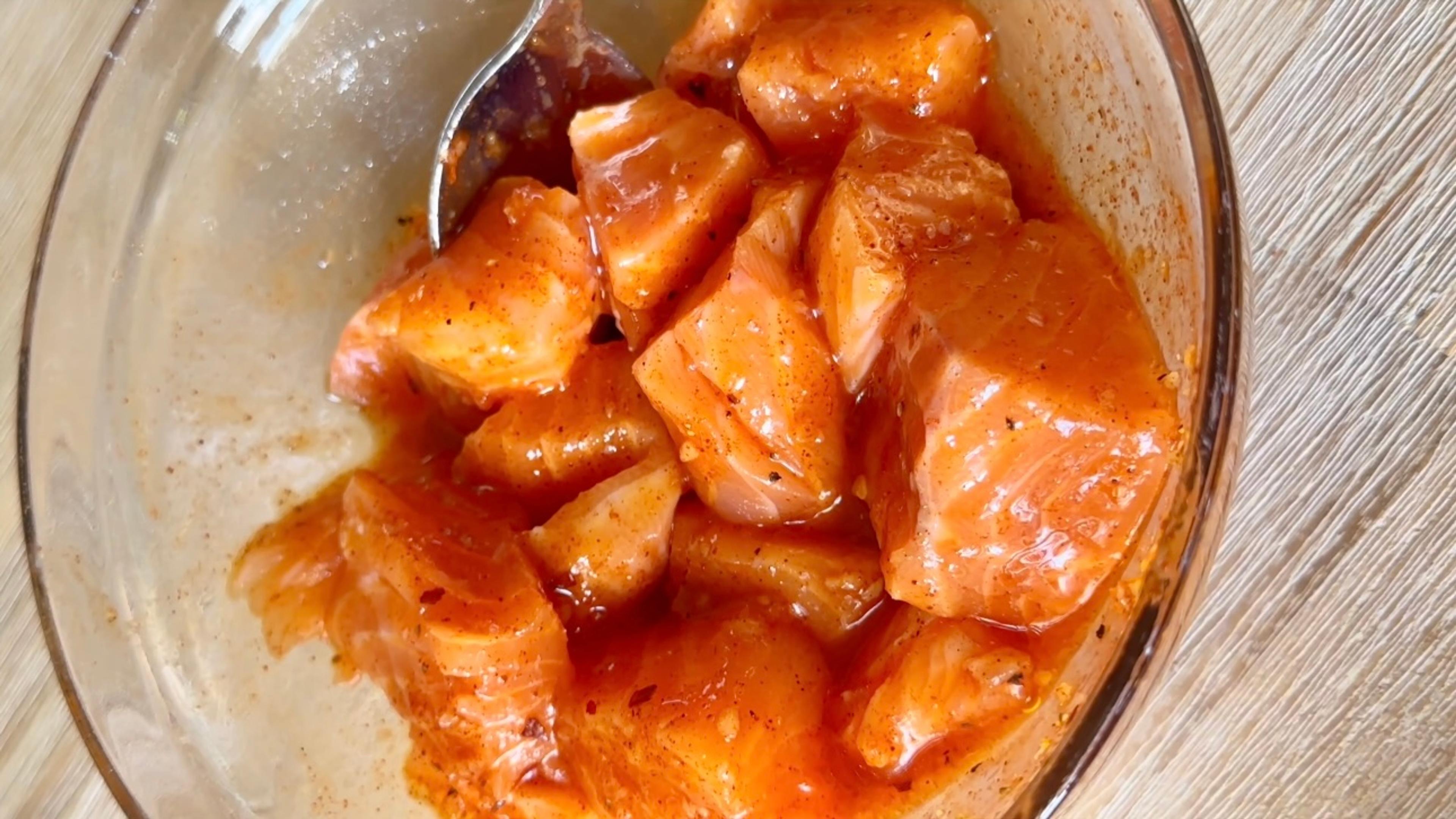 Marinate the cubed salmon. In a bowl, combine olive oil, lemon juice, paprika, honey, garlic, red pepper flakes and salt. Mix until well-combined and add salmon, making sure bits are touching the marinade.
