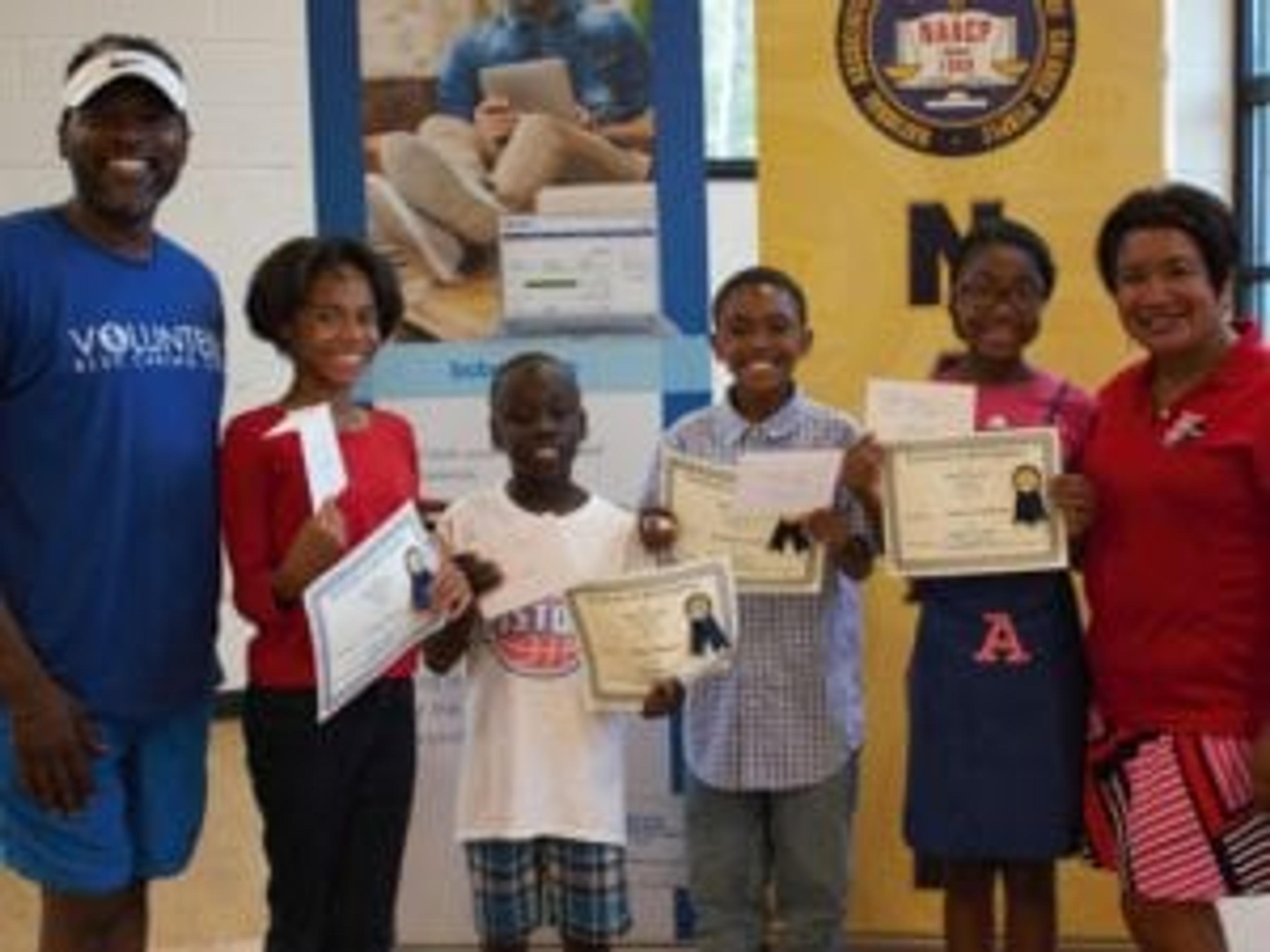 Cle Jackson, senior community liaison for Blue Cross Blue Shield of Michigan with Taylor Pierce, Justin Hilliard, Brandon Lee, Jr., Anaka Armstrong and WZZM TV personality Jennifer Pascua.