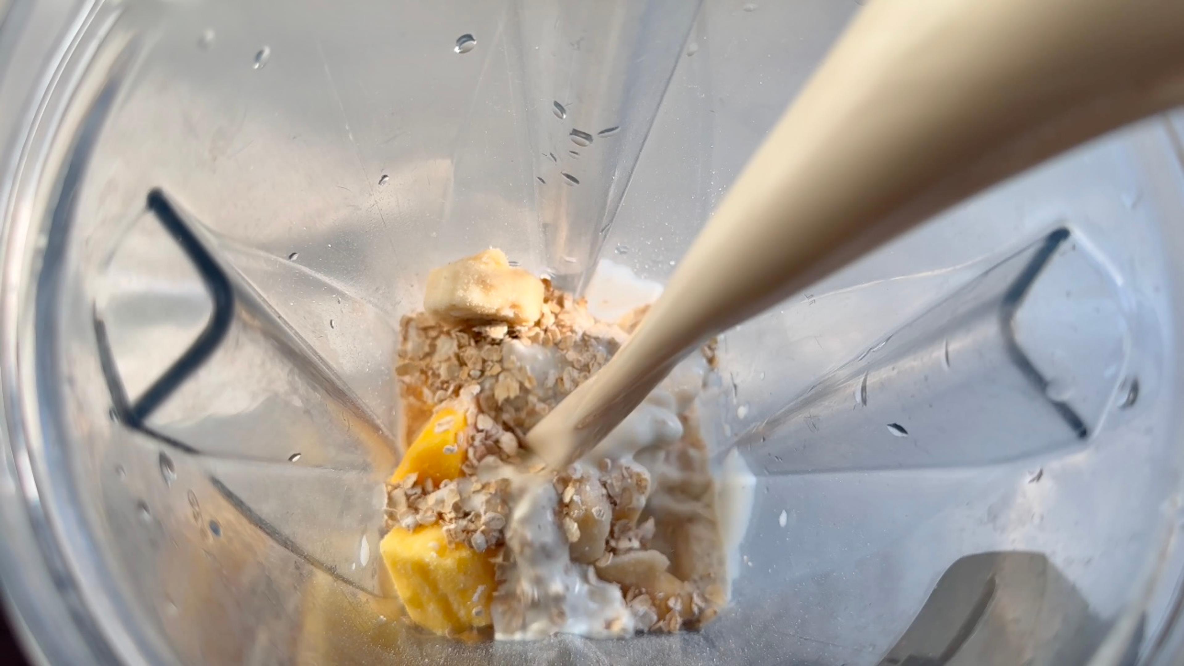 This smoothie is naturally sweet and creamy from mango and banana. The oats add a subtle nutty flavor and contribute to a more filling and nourishing smoothie. The toasted coconuts add a nice visual element and perfectly complements the mango flavor.
