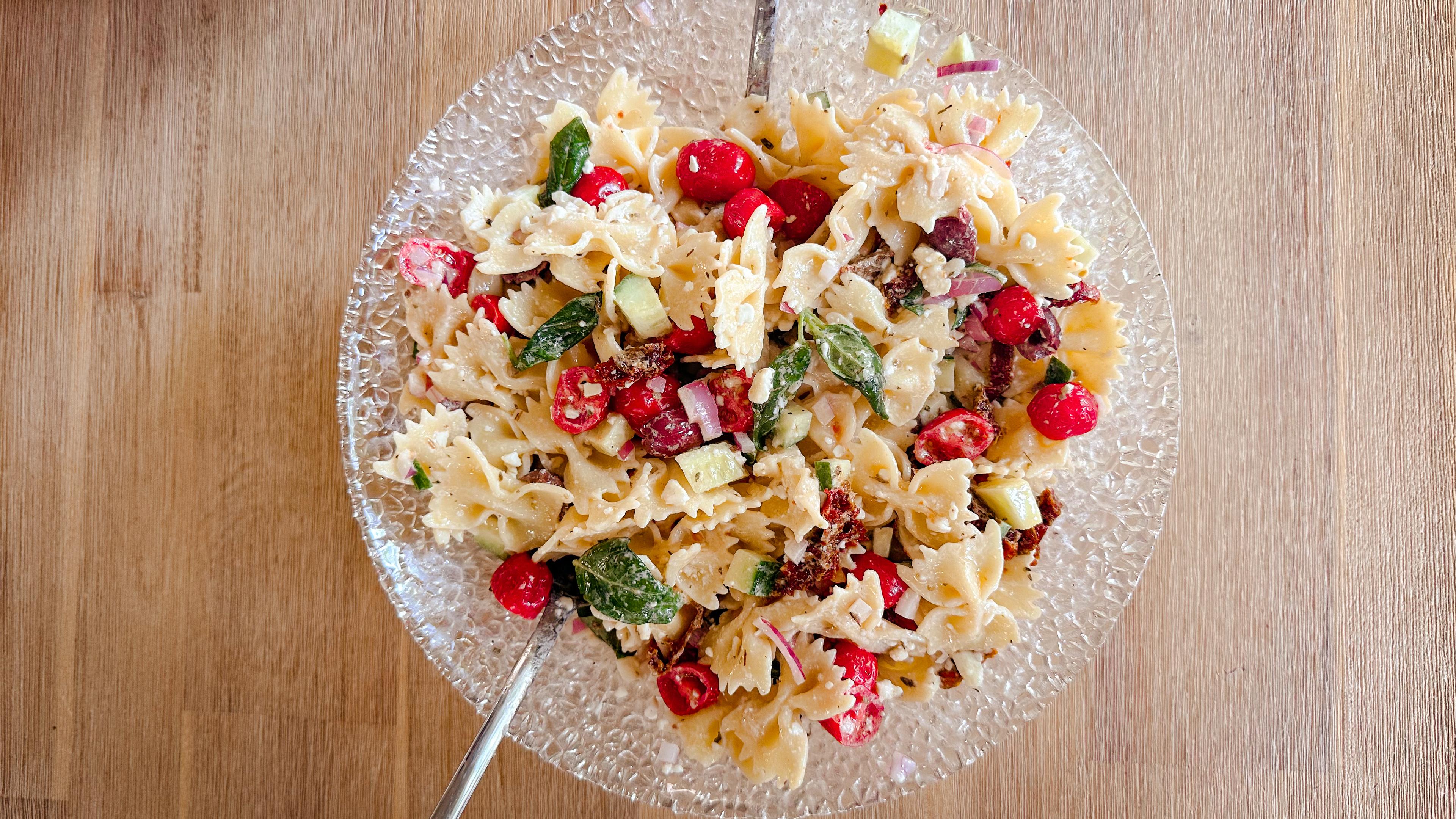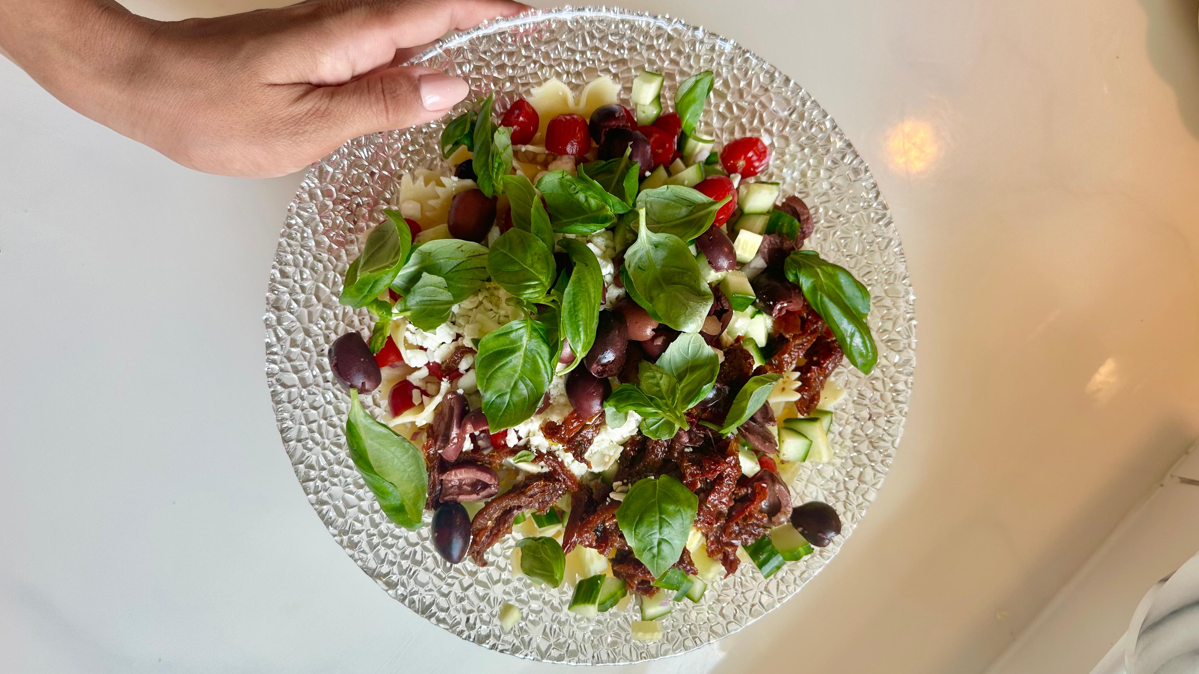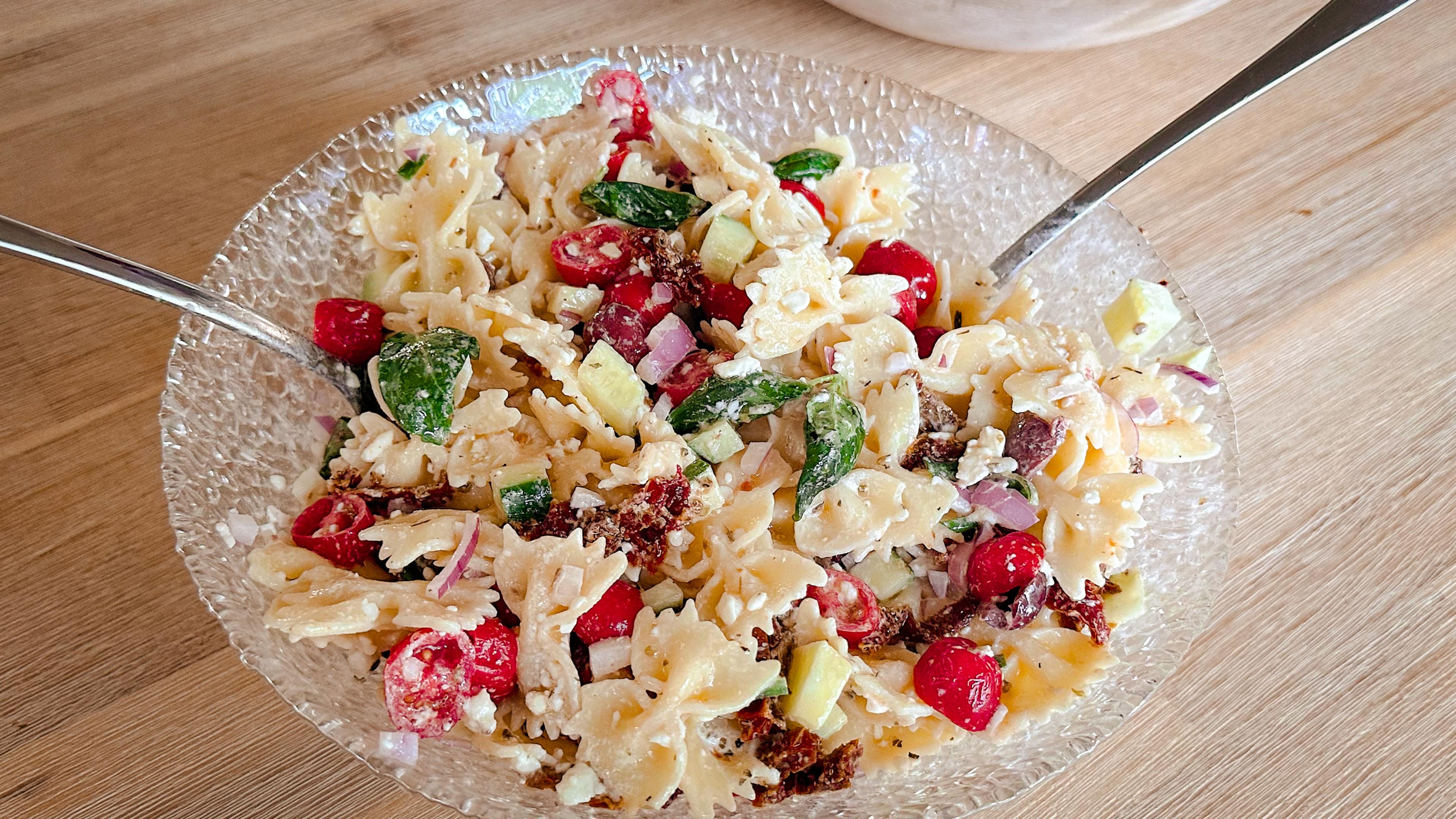 In a large bowl, combine cooked pasta with tomatoes, cucumber, olives, onion, sundried tomatoes, feta and basil.