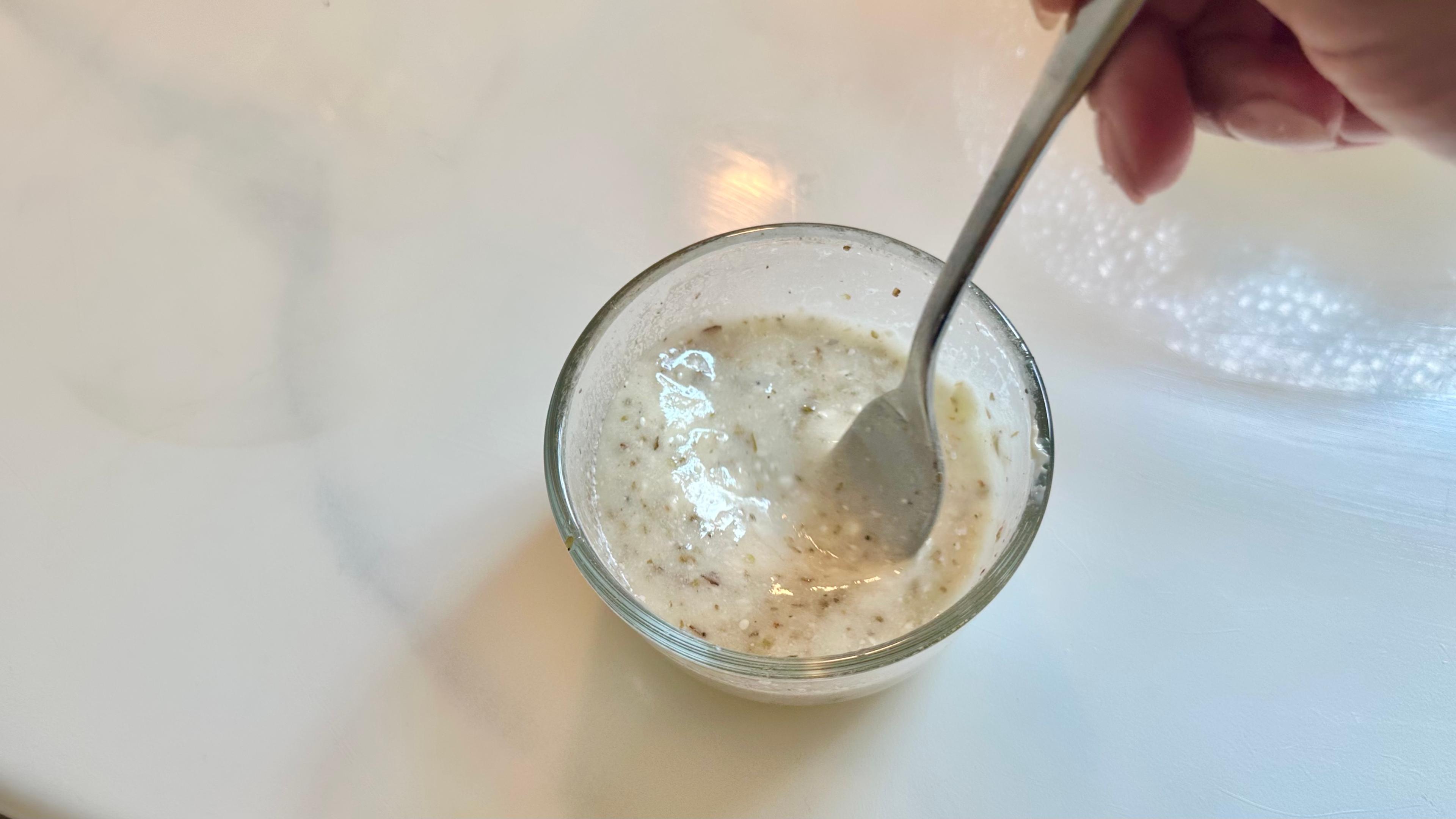 In a separate small bowl, whisk together olive oil, mayonnaise, lemon juice, oregano, salt and pepper.