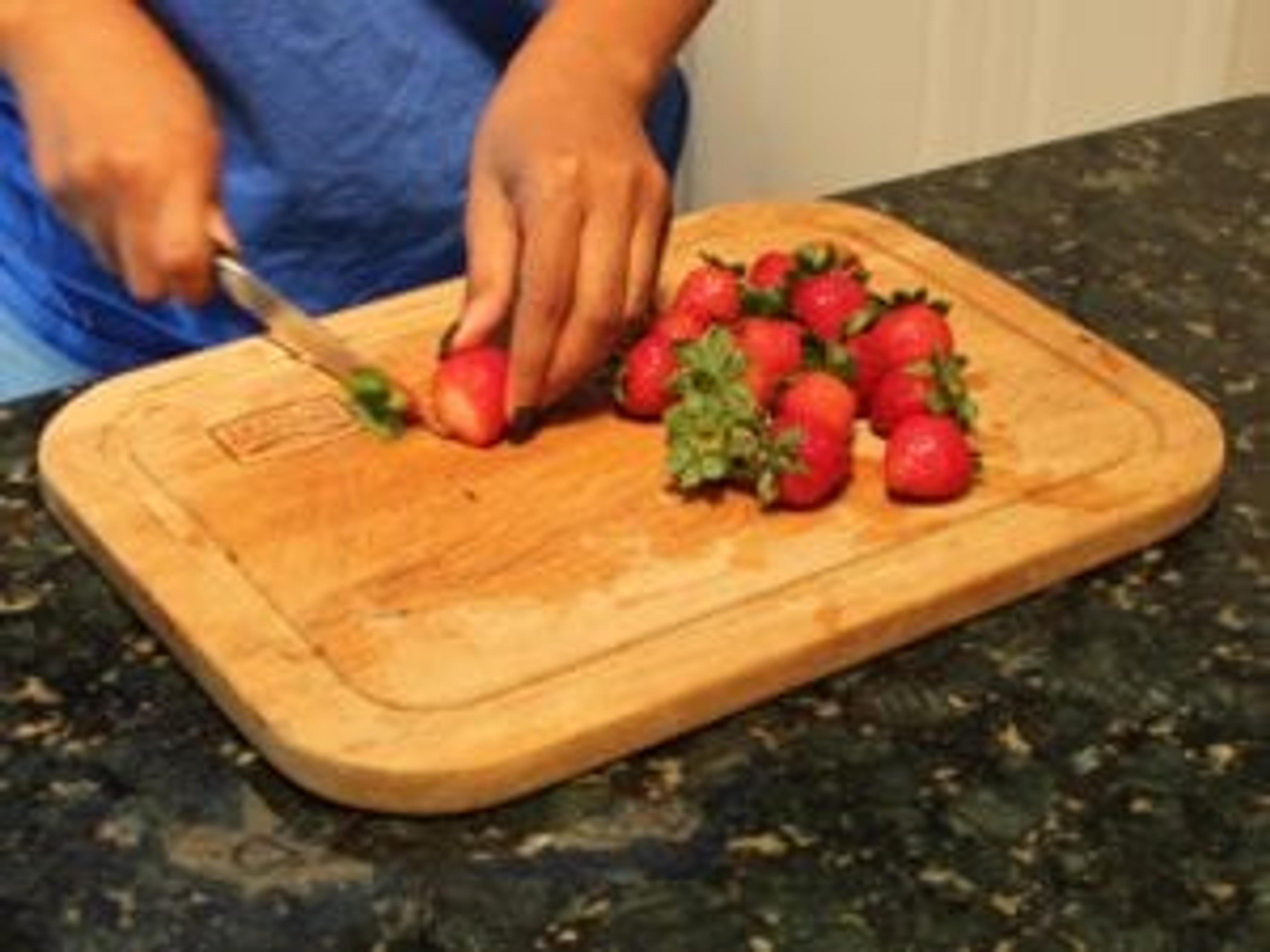 Prepare your Michigan strawberries by cutting off the stems and slicing them into quarters.