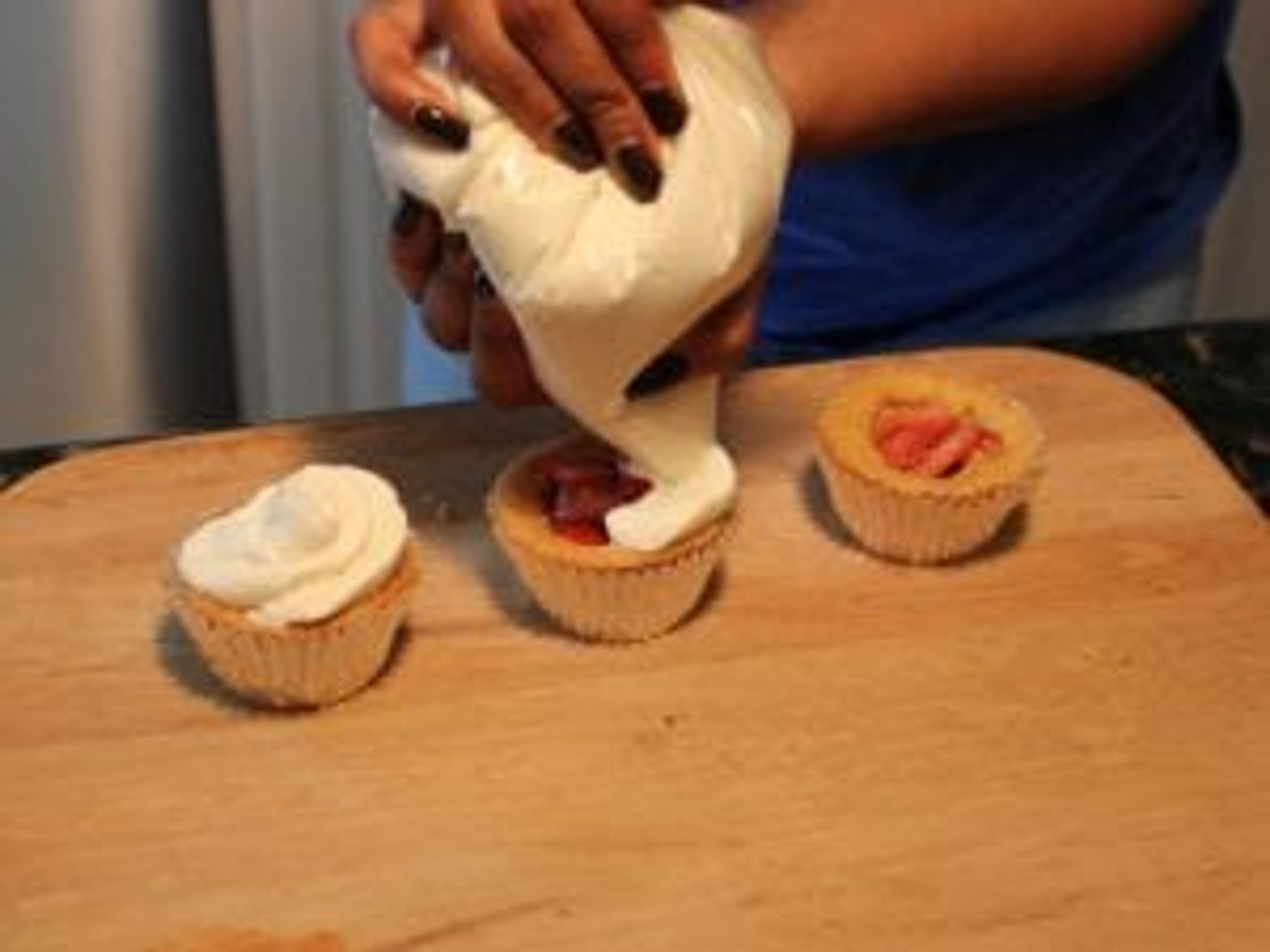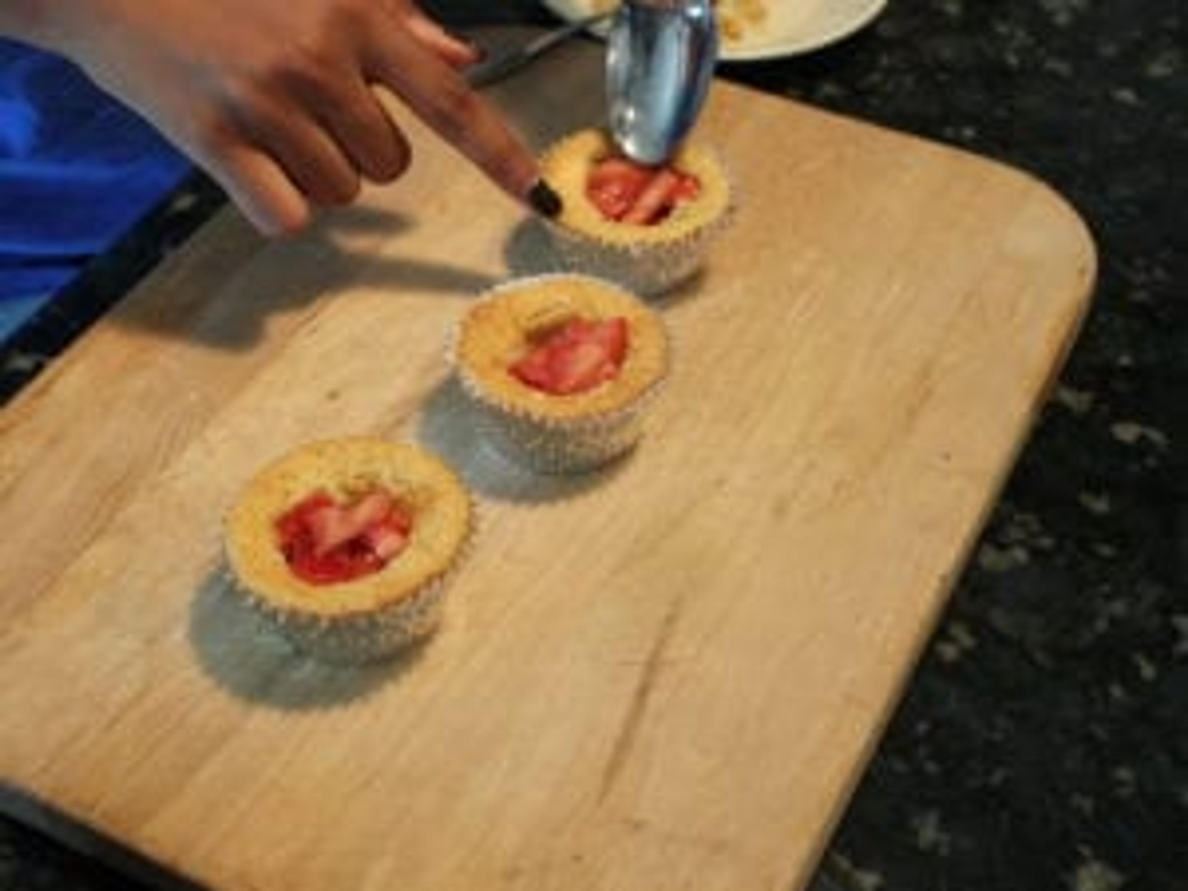 Once cooled, scoop out the middle of each cupcake and fill with the strawberry orange mixture.