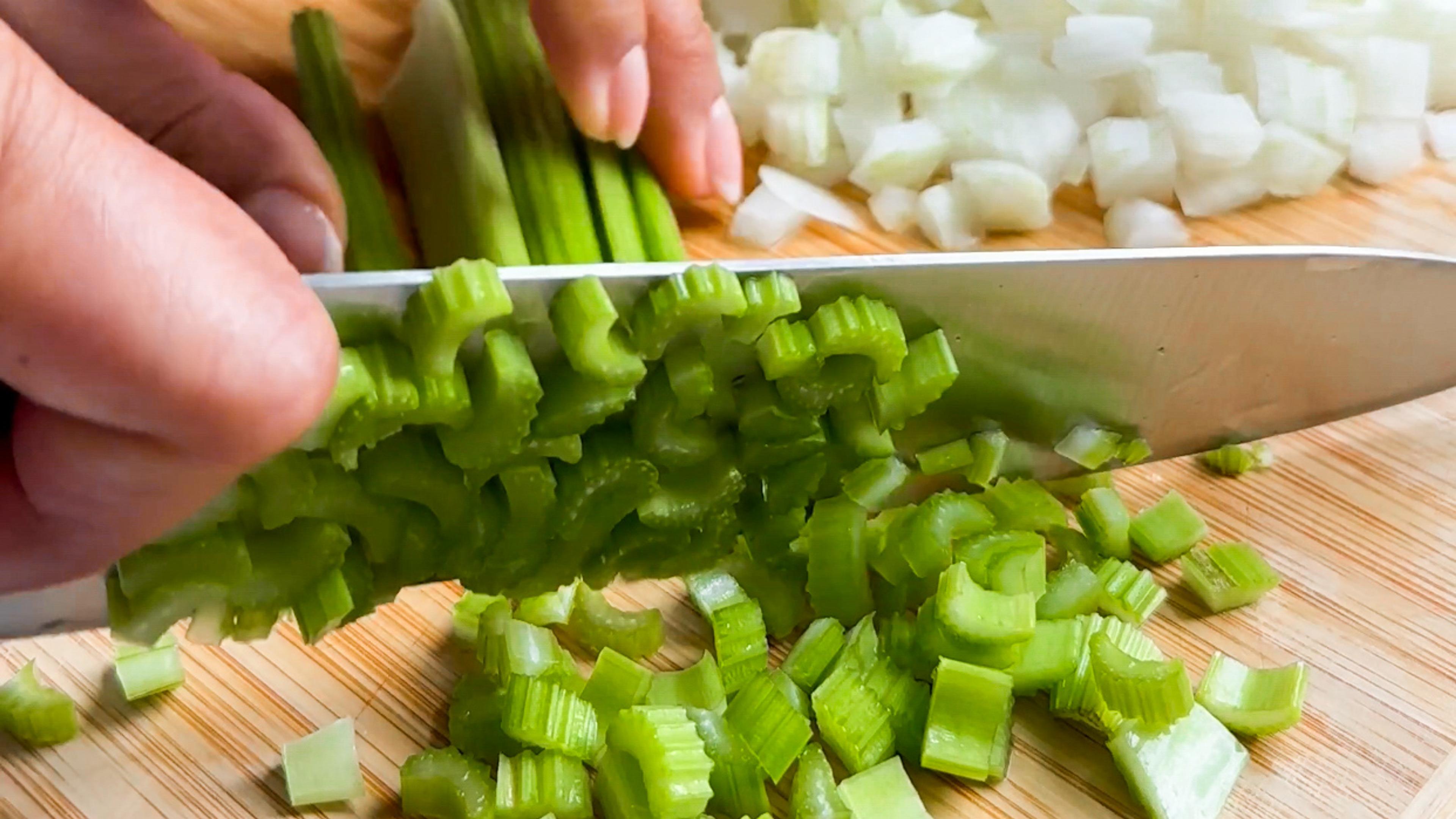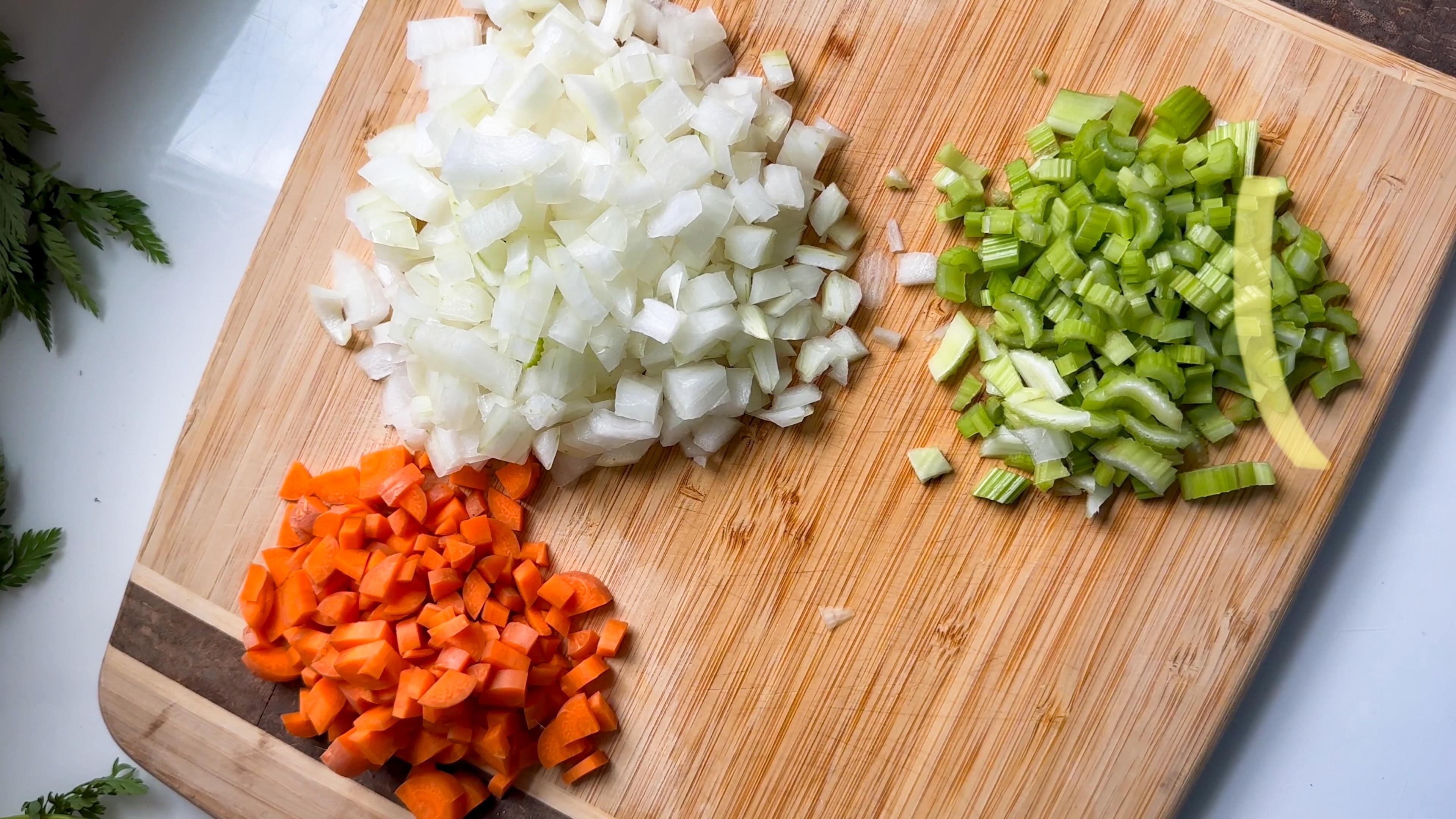Mirepoix may sound fancy, but it’s really just a simple flavor base for dishes like soups and sauces made from onions, celery and carrots. A mirepoix starts with finely dicing your veggies, the ratio being two parts onion to one part carrot and one part celery.