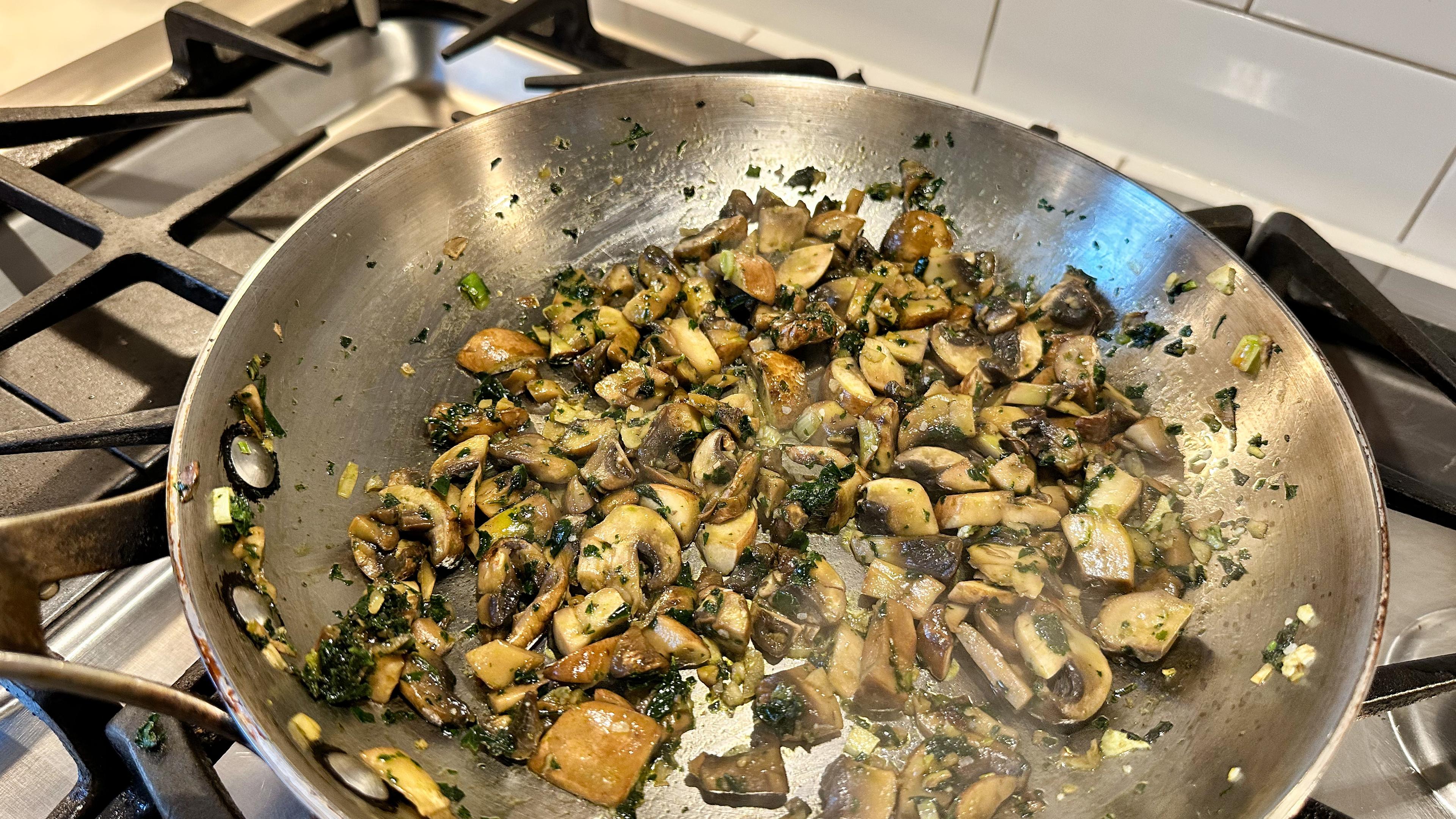 Once the garlic is golden, add diced mushrooms and parsley and bring up to medium heat. Sautee until fork tender. Add salt and pepper to taste.