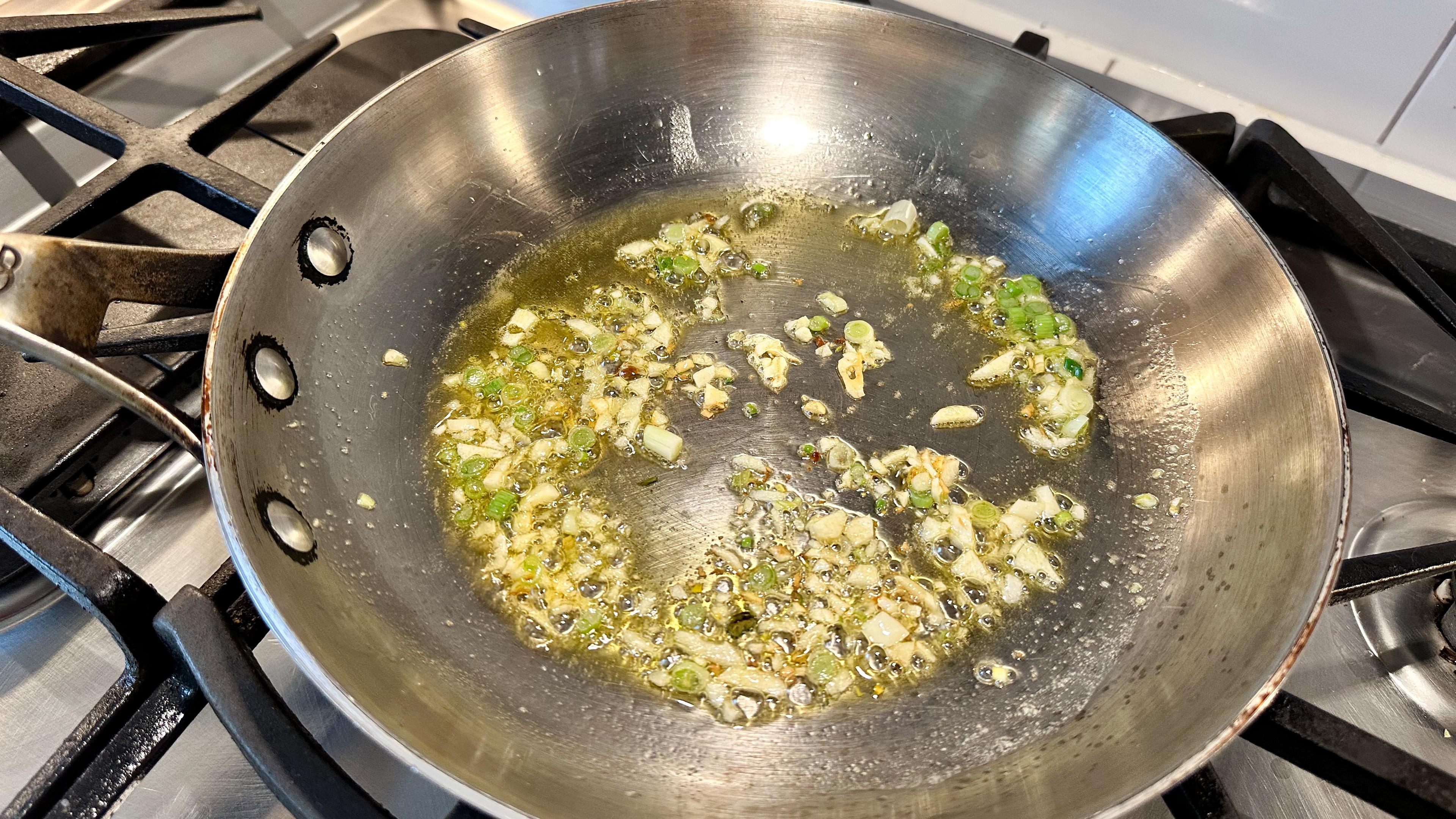 In a large pan over medium-low heat, add olive oil. Once warm, add garlic and green onion whites and cook until fragrant, stirring frequently, about 3 minutes.