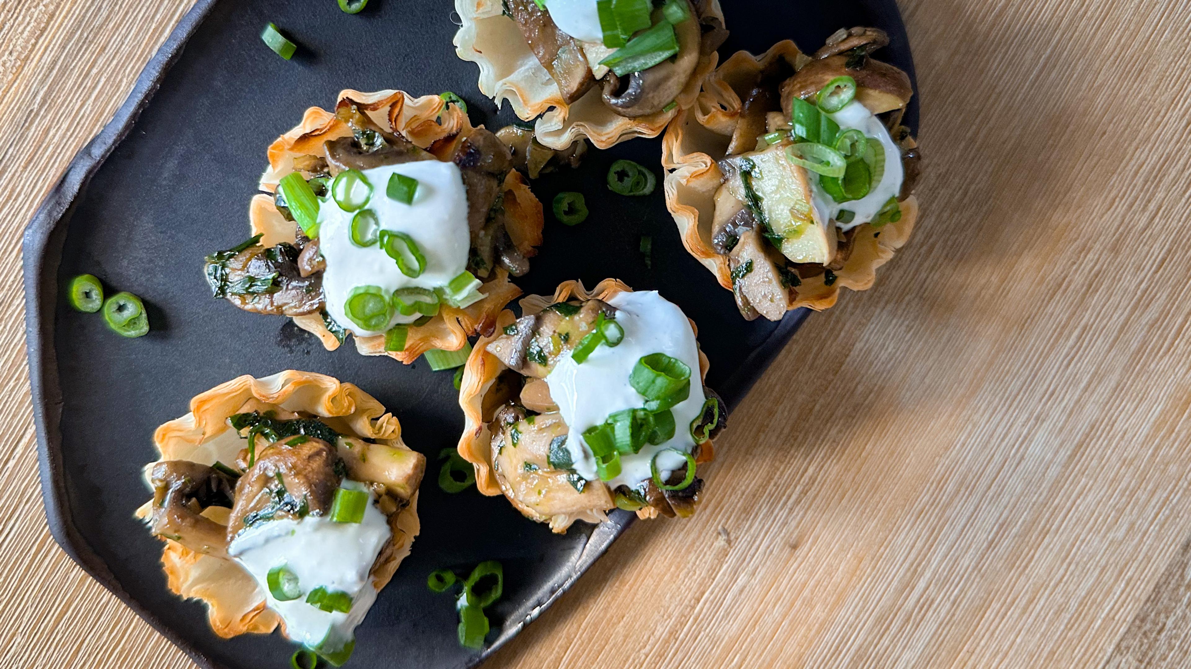 Add sauteed mushrooms to the phyllo shells. Add a little of the creamy horseradish and sprinkle with the green onion greens.