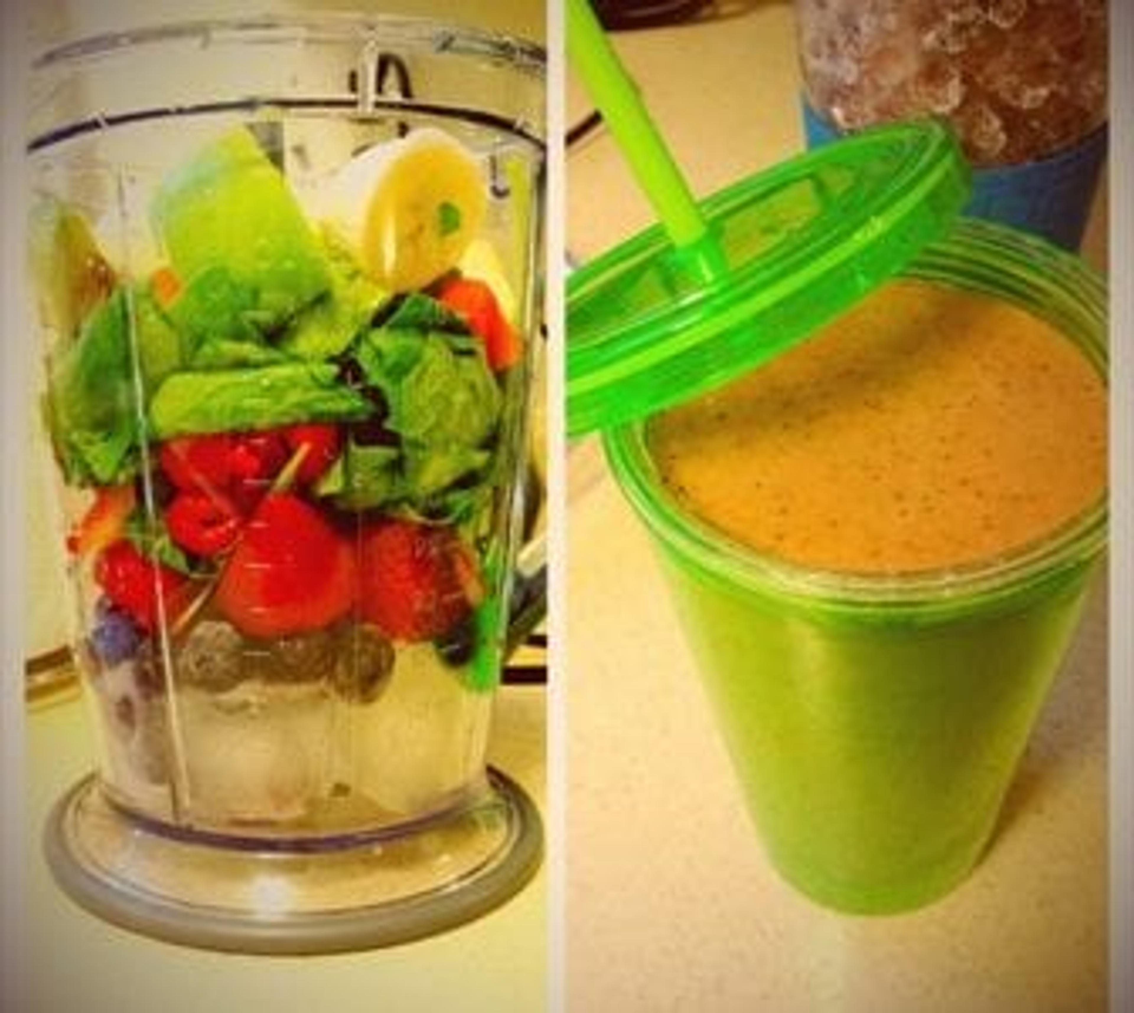 My first step to becoming a healthier me is to start my day off with a smoothie full of fruits and vegetables. I have been replacing my first coffee of the day with a smoothie for two weeks now and have noticed that I feel less groggy by the afternoon. I have been playing with different recipes and have come up with fruit and veggie combination that seems to work really well. My morning power smoothie includes: