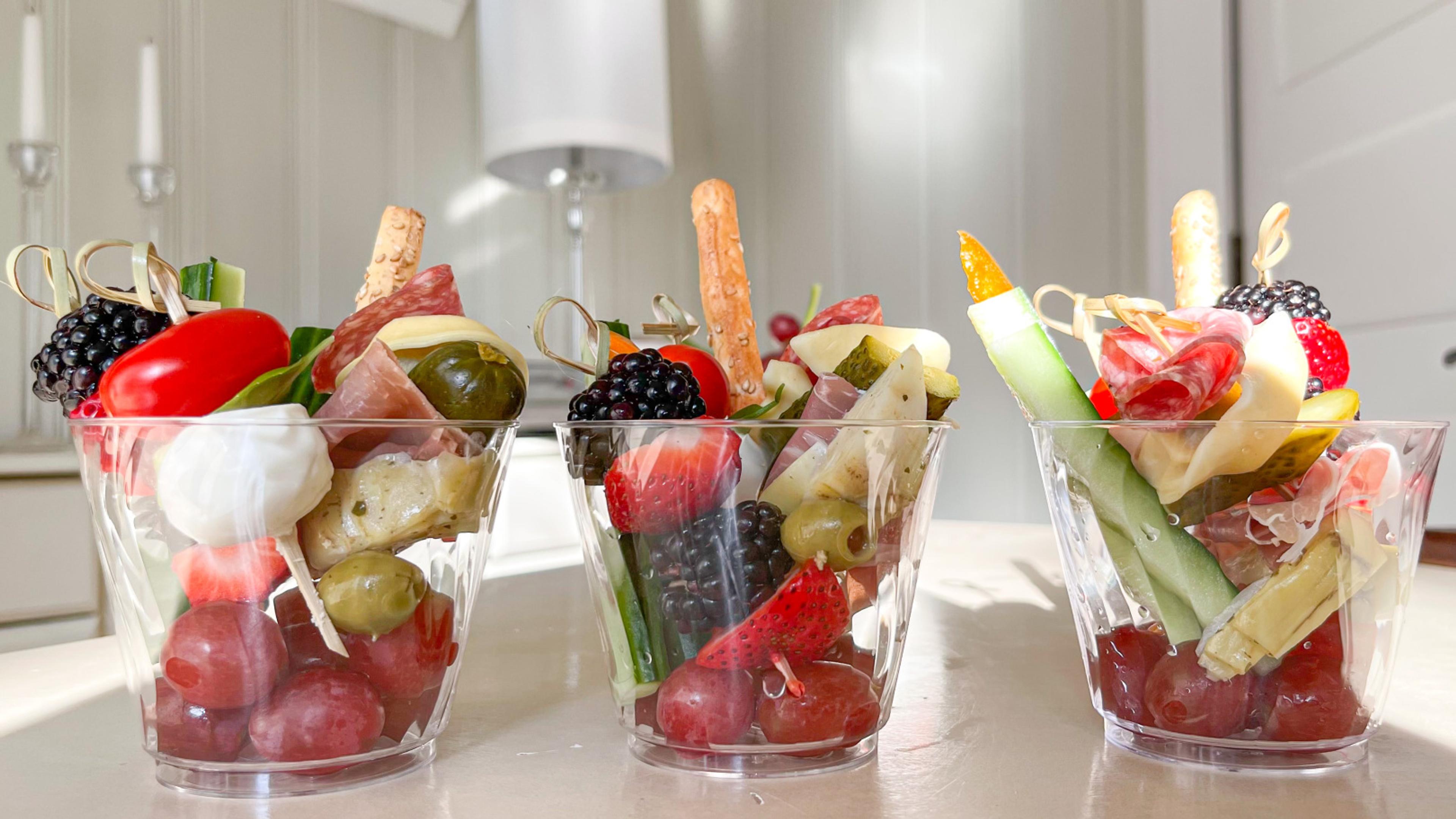 Shanthi’s recipe for “jarcuterie” is an individual-serving take on the popular charcuterie board. It’s a portable fan favorite around the tailgate. Making it is as simple as loading a mason jar, plastic cup or short glass with a mix of healthy and indulgent ingredients. For an attractive product, consider using food items in different heights and a variety of colors. You can even show your team spirit with a ribbon of your team colors around the rim.
