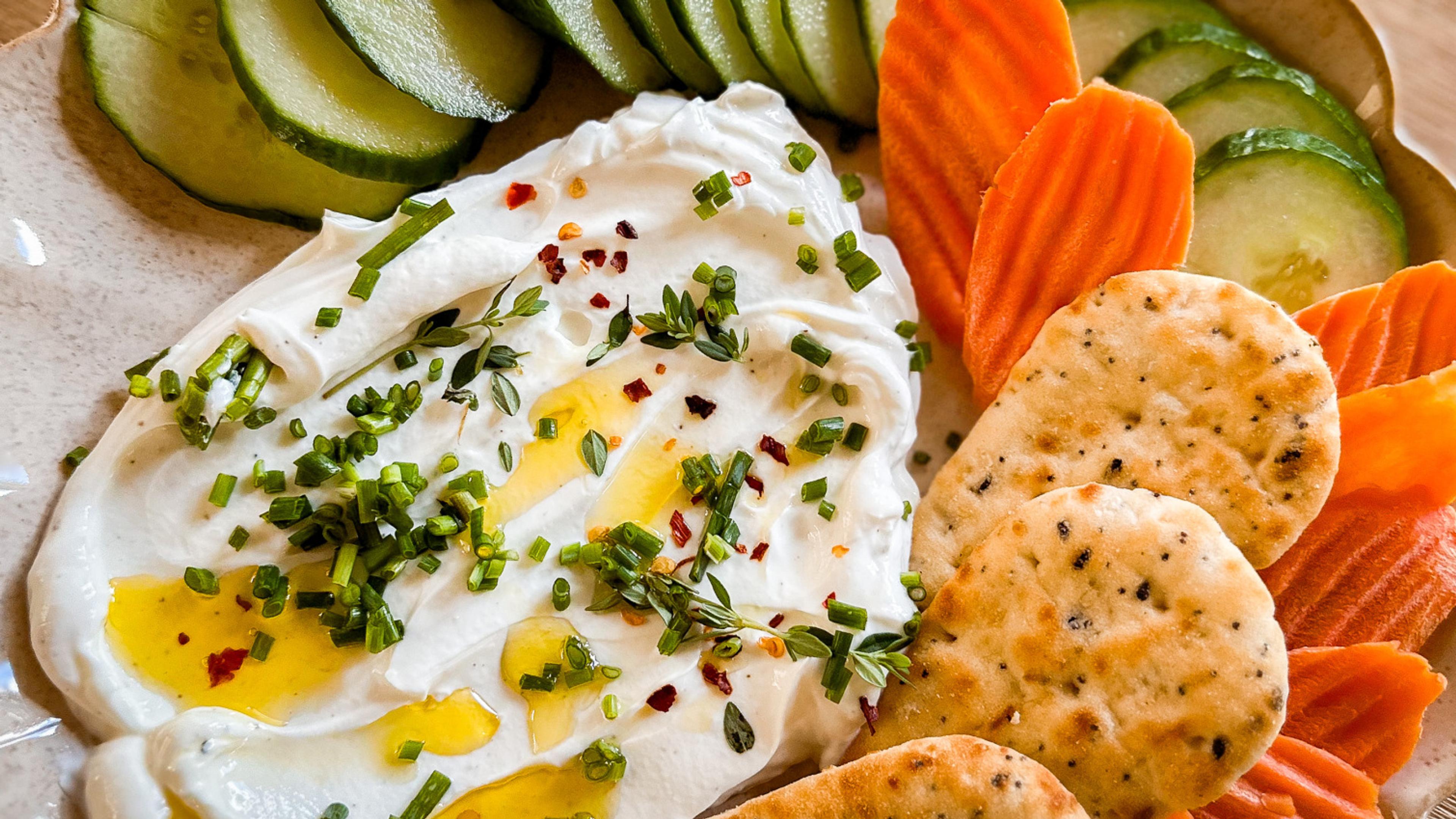 This sizzling garlic and spring herb yogurt dip is a great protein- and nutrient-packed snack or party appetizer. Delicious and easy to make, the dip comes together in less than 10 minutes and can be served with your favorite dippers, like fresh-cut veggies, crackers and toasted bread.