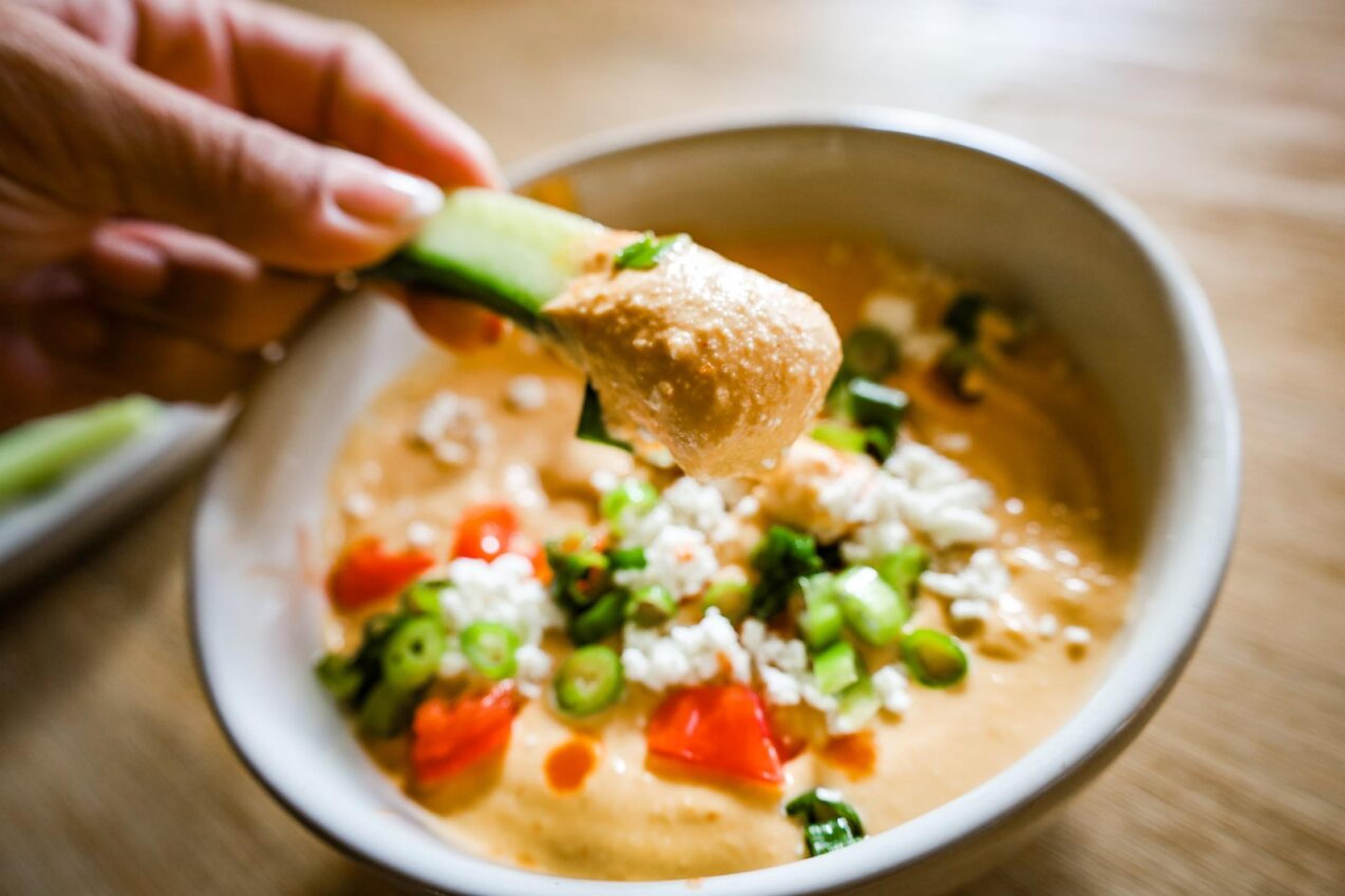 Buffalo chicken dip is a beloved party and tailgating staple. A recipe full of cream cheese and other cheeses isn’t exactly heart-healthy. This recipe incorporates buffalo flavors into hummus with more healthy fats, like olive oil and tahini.