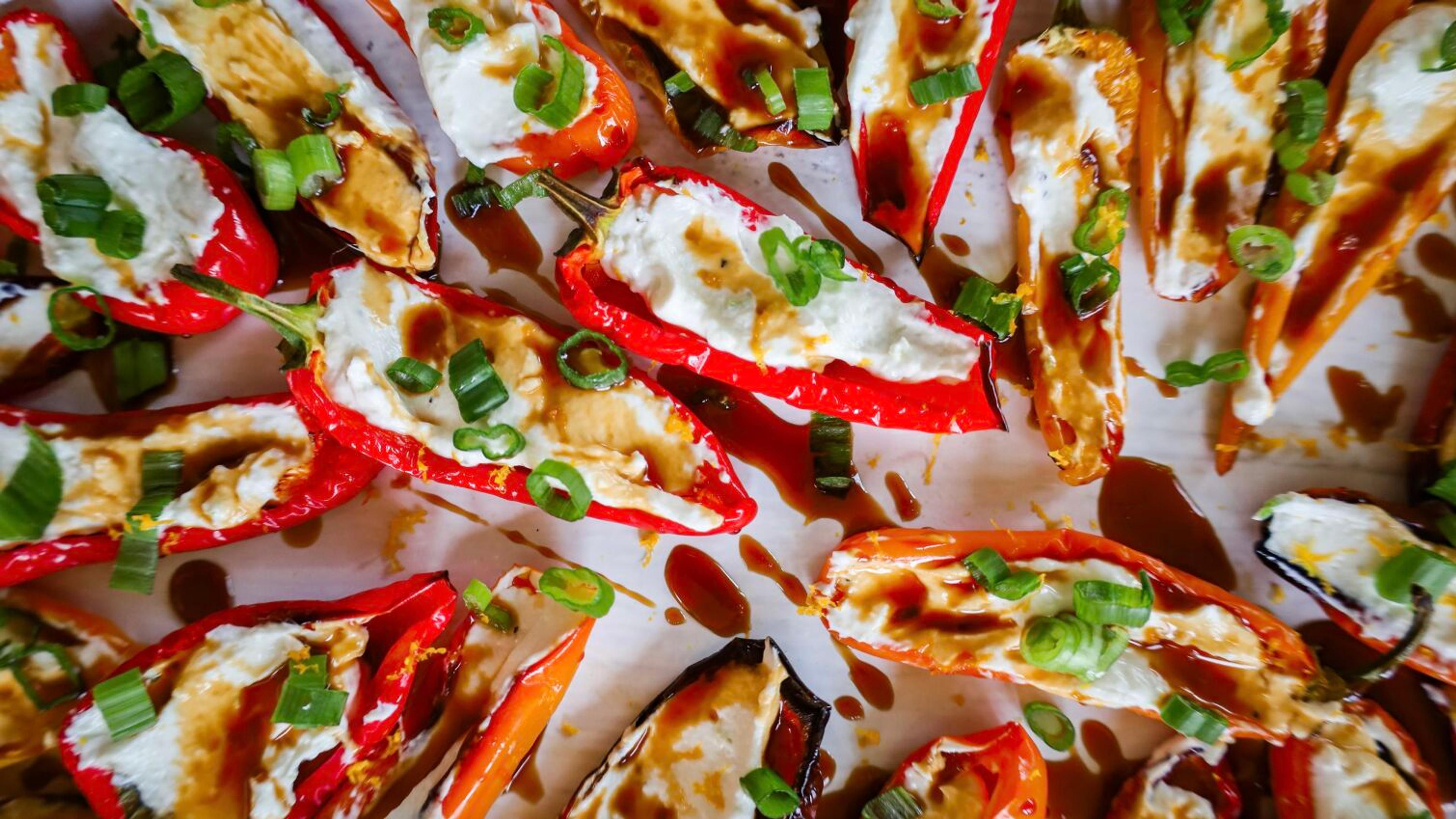 These bite-sized peppers are the perfect party appetizer. They’re vibrant in color, thanks to the mini bell peppers, and rich in protein from their goat cheese and Greek yogurt filling. Searing garlic and green onion in olive oil adds a depth of flavor to the dish.