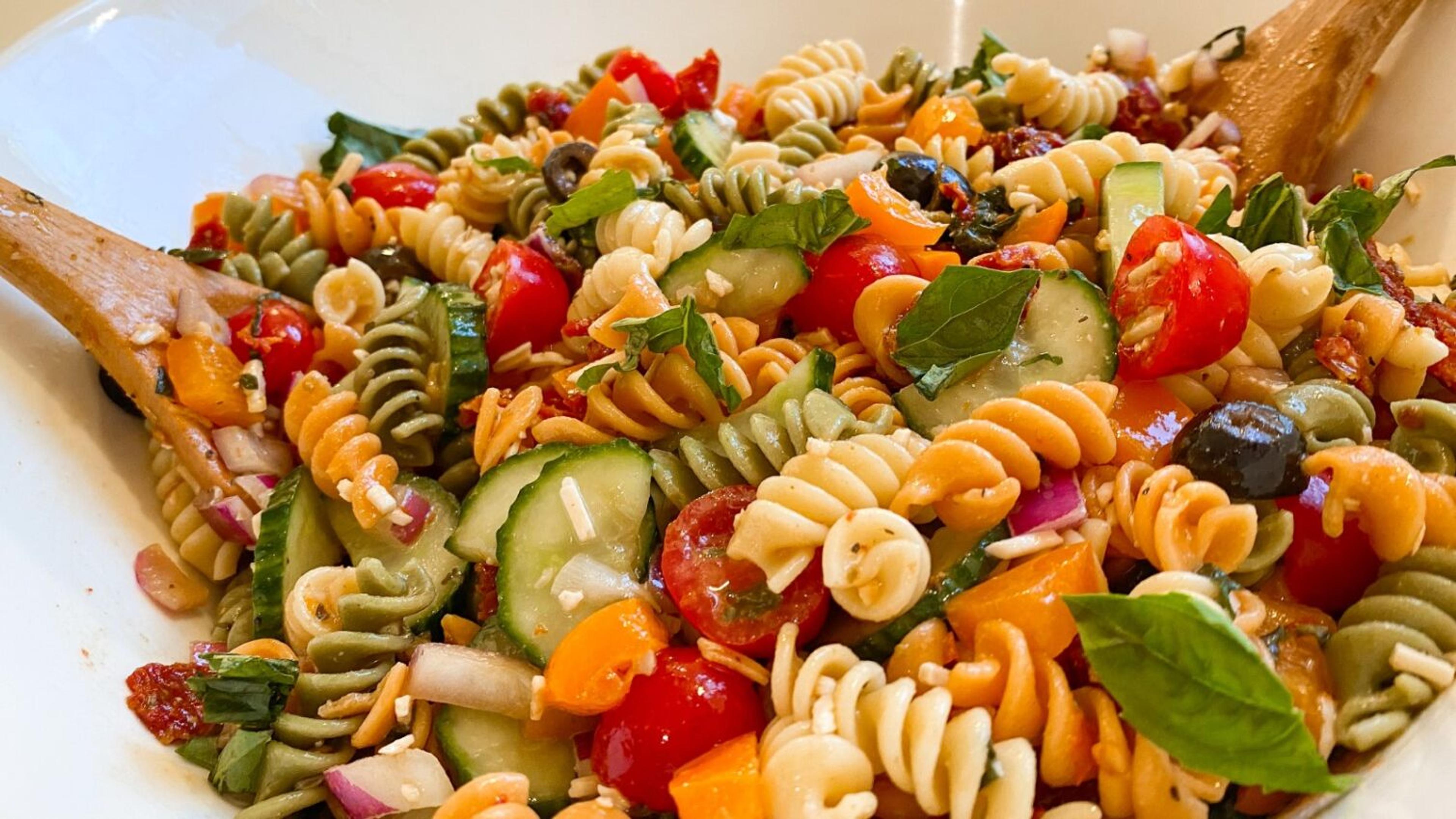 This pasta salad recipe packs in nutrients from a variety of vegetables and adds a nice crunch from bell peppers and cucumbers. With a vinaigrette-based rather than mayonnaise-based dressing, this pasta salad fares better at warm outdoor events from a food-safety aspect.
