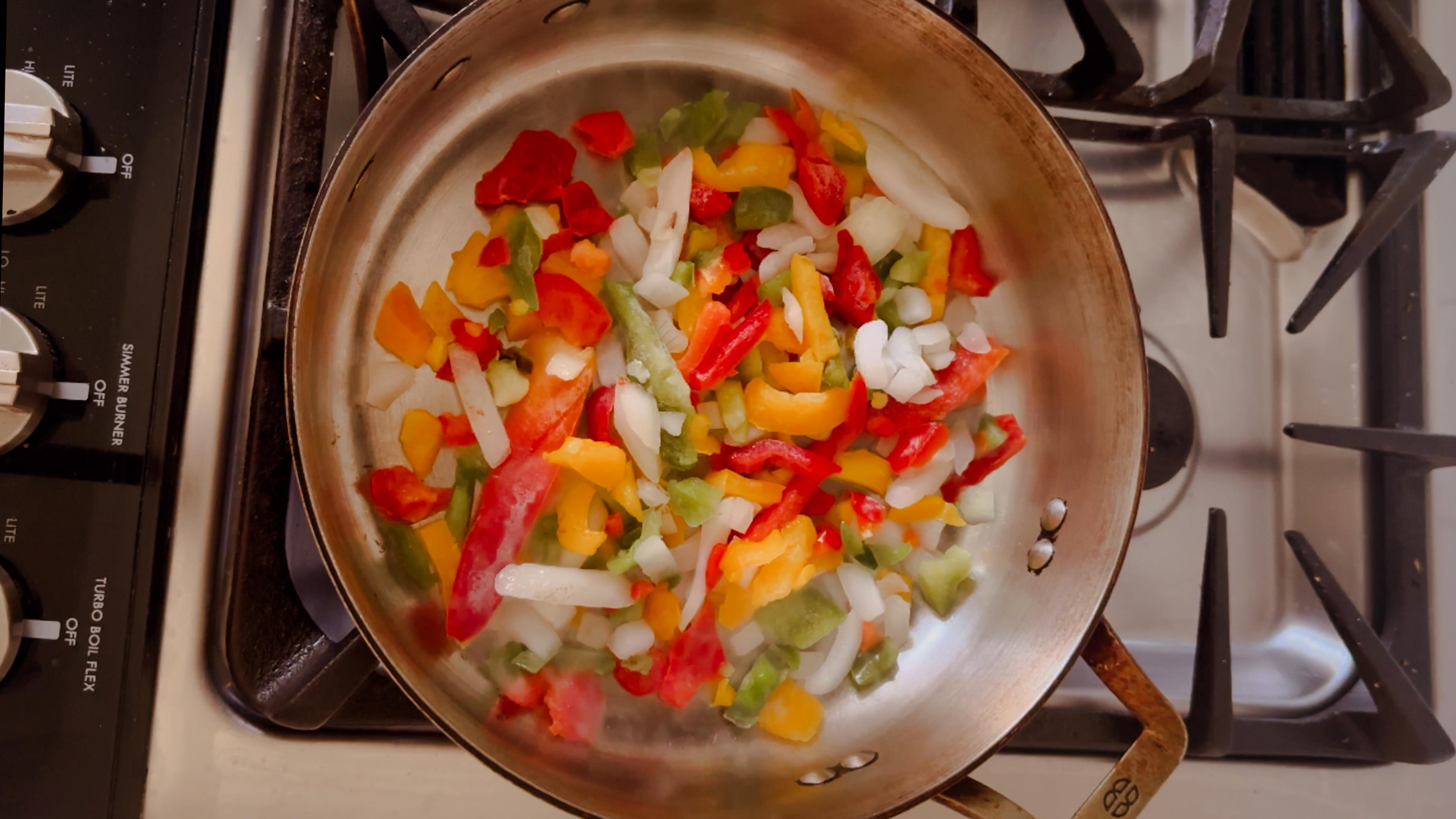Heat a large pan over medium high heat. Once hot, add the pepper and onion blend. Sear for 3-4 minutes, stirring constantly to get the moisture out.