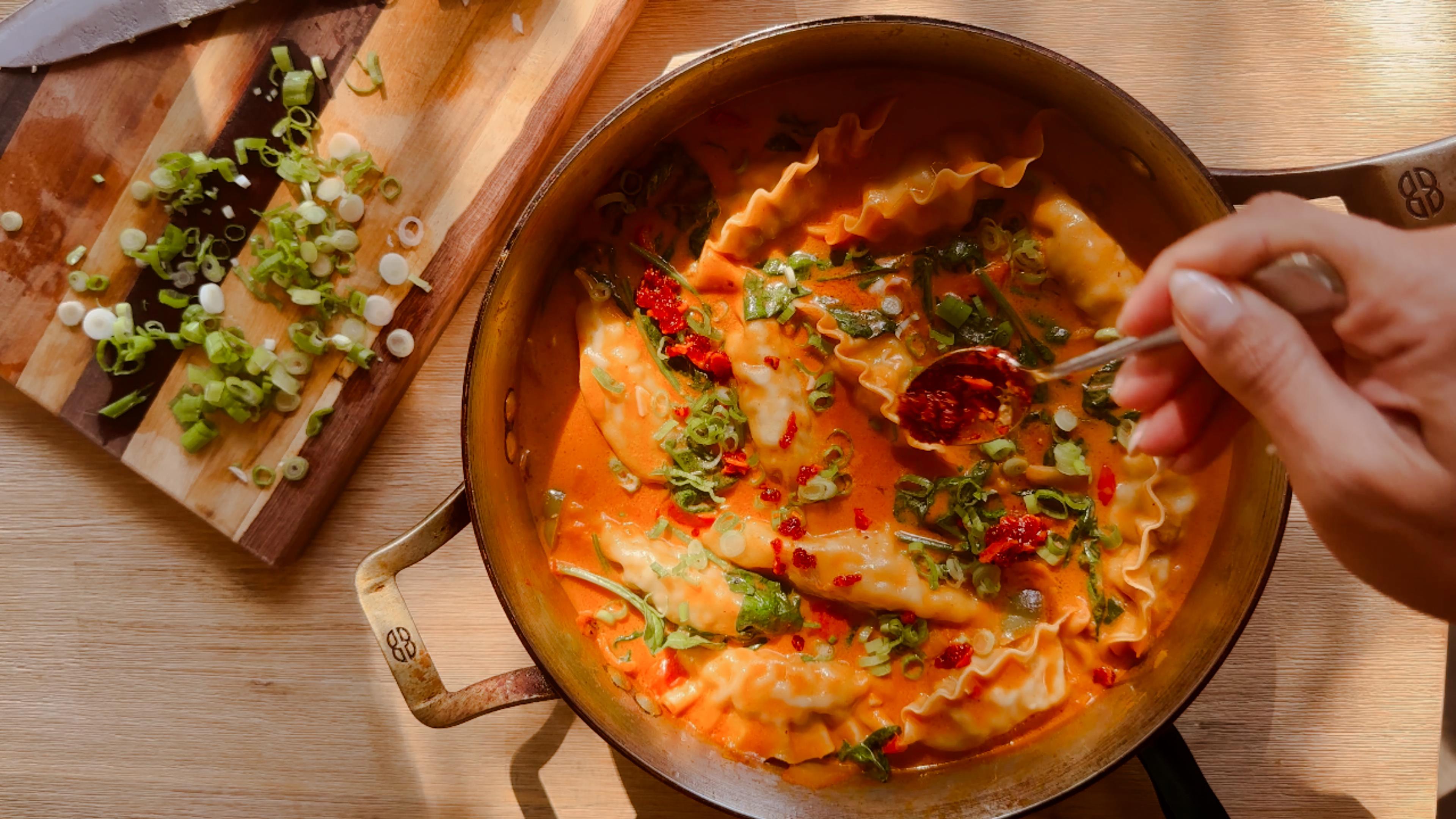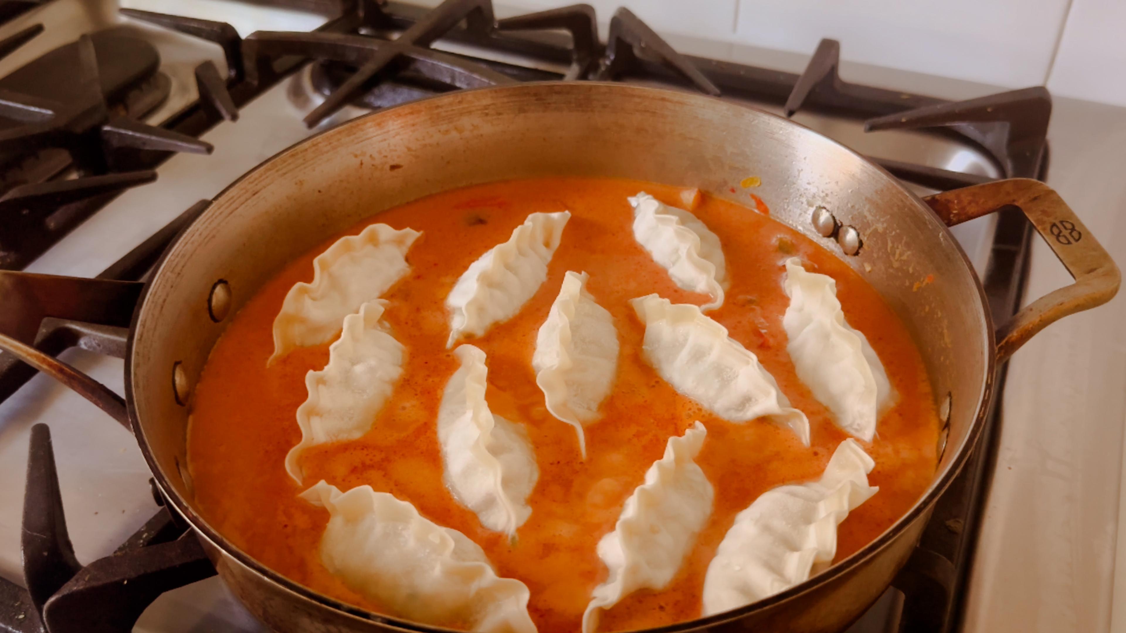 One-pot Coconut Curry Gyoza with Frozen Veggies