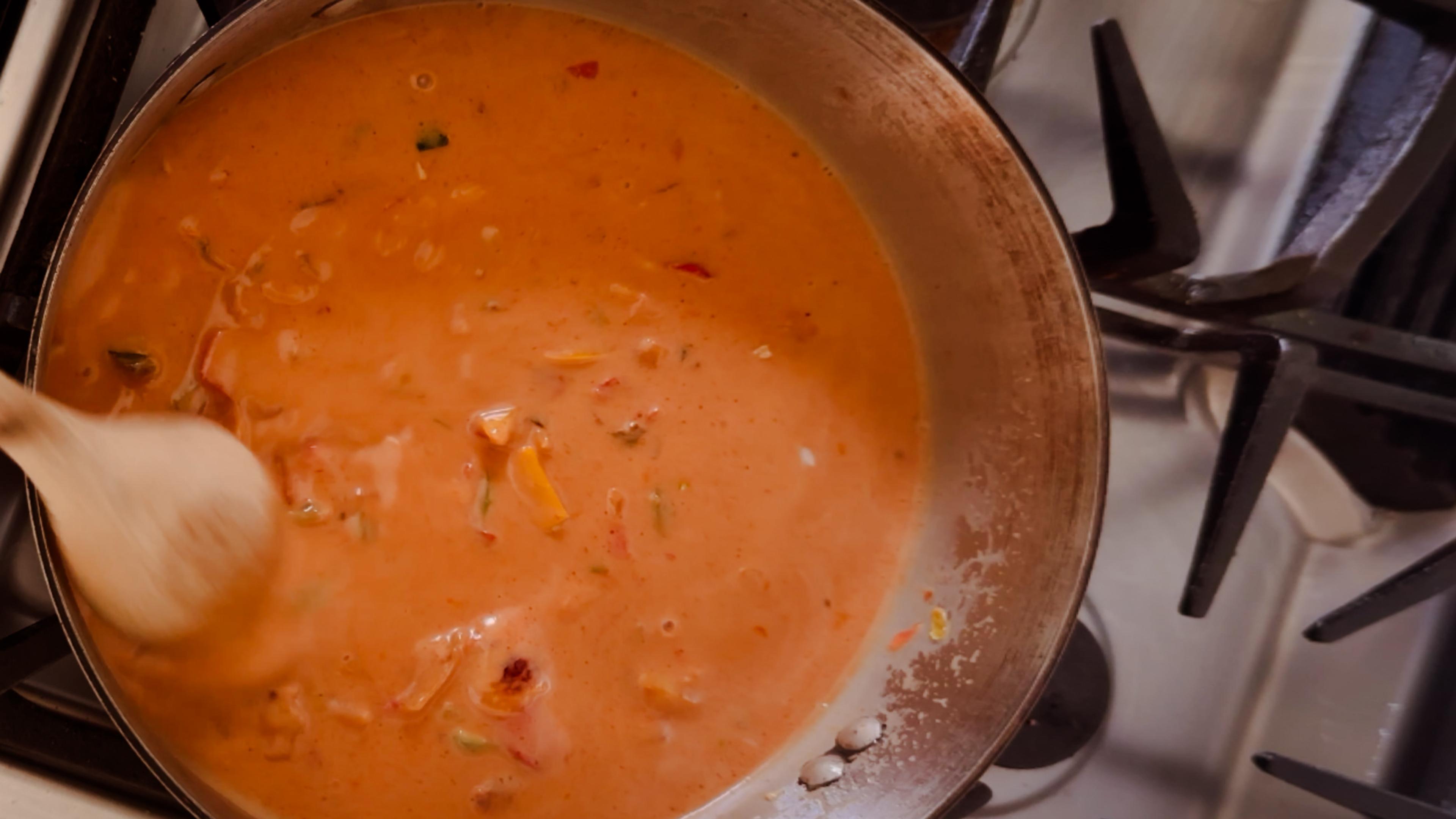 Turn the temperature down to medium-low and add olive oil and garlic. After 2-3 minutes once garlic is fragrant, add Thai curry paste, coconut milk and soy sauce.