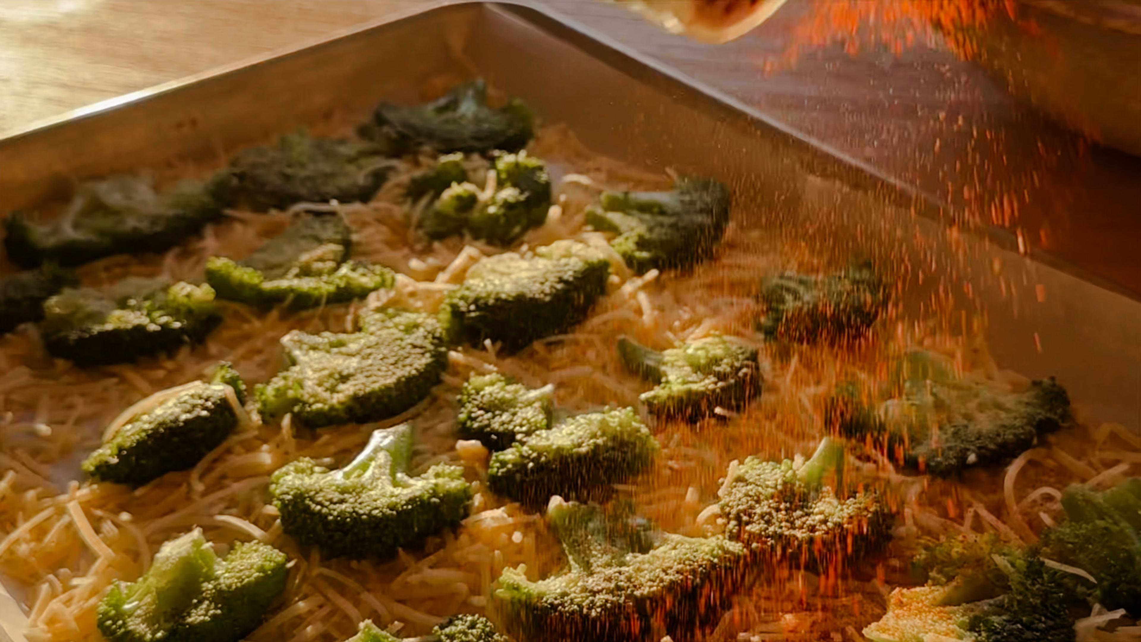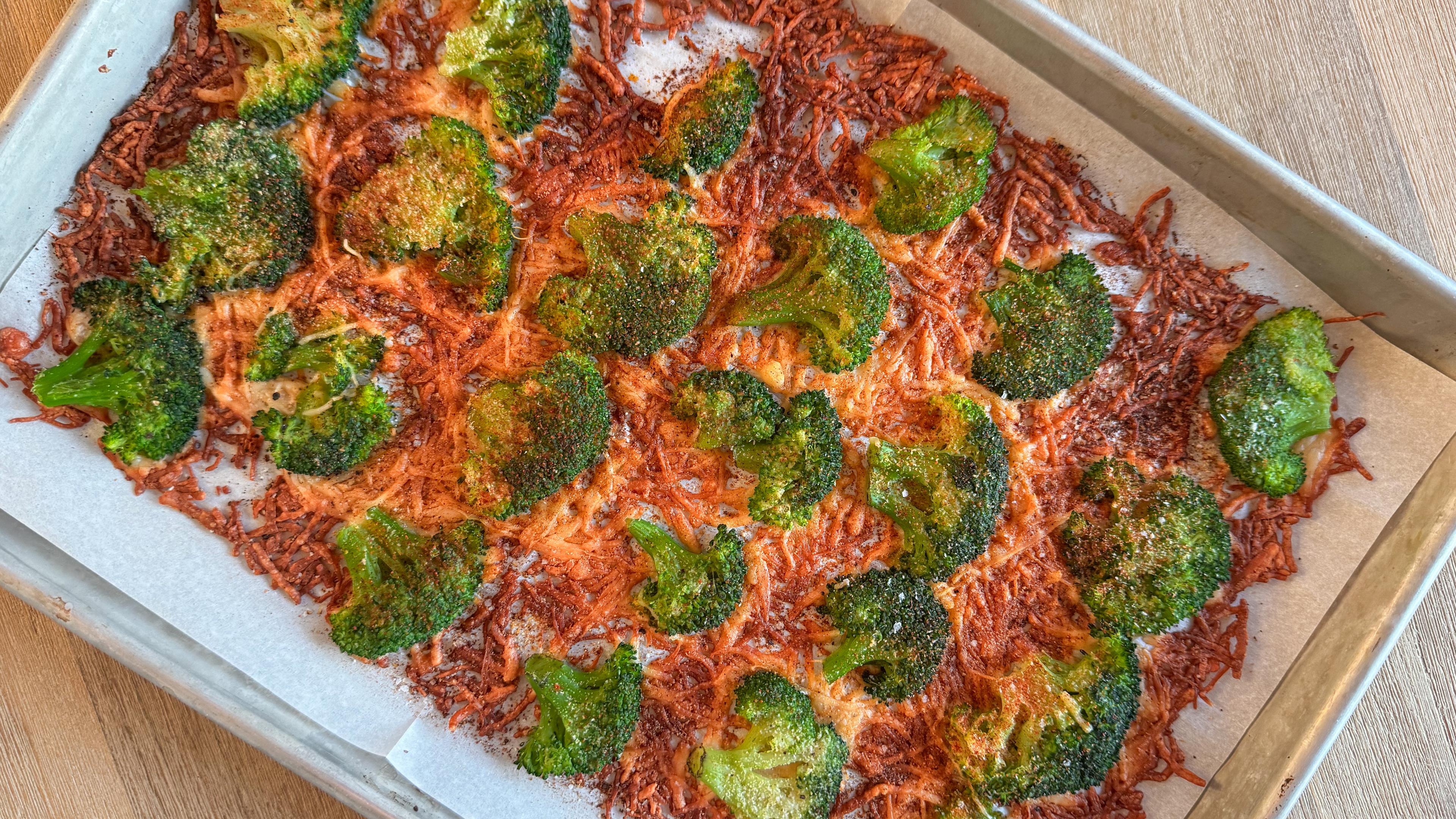 Sprinkle the baking sheet evenly with cheese in a thin layer. Add broccoli on top, spacing them out so there is room to smash.