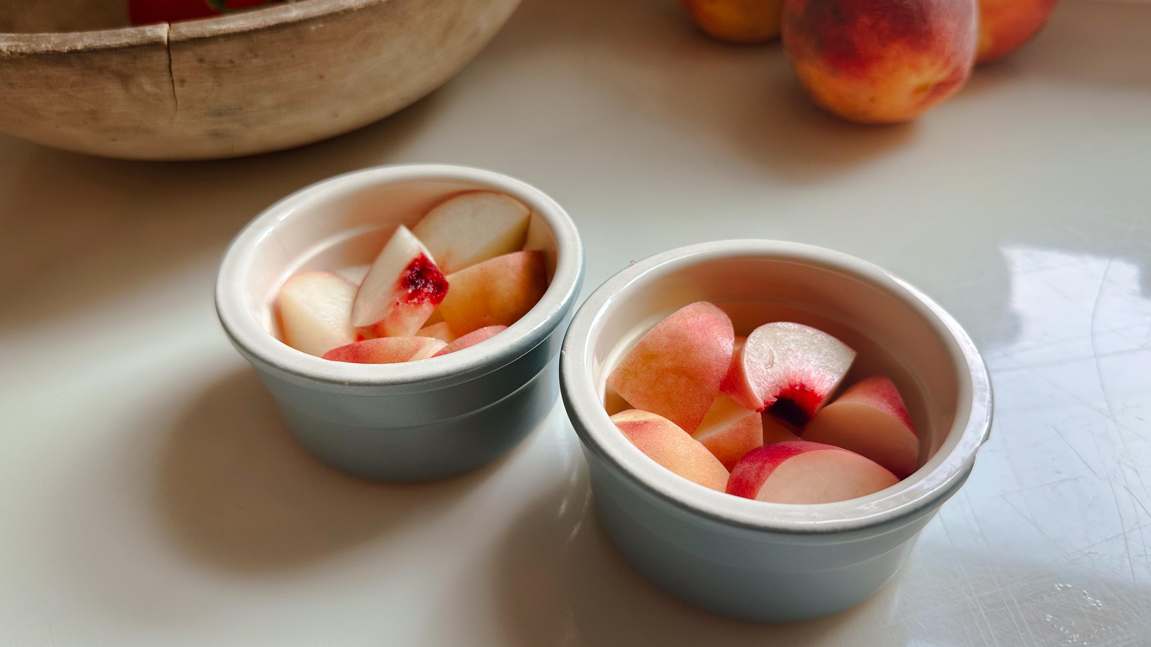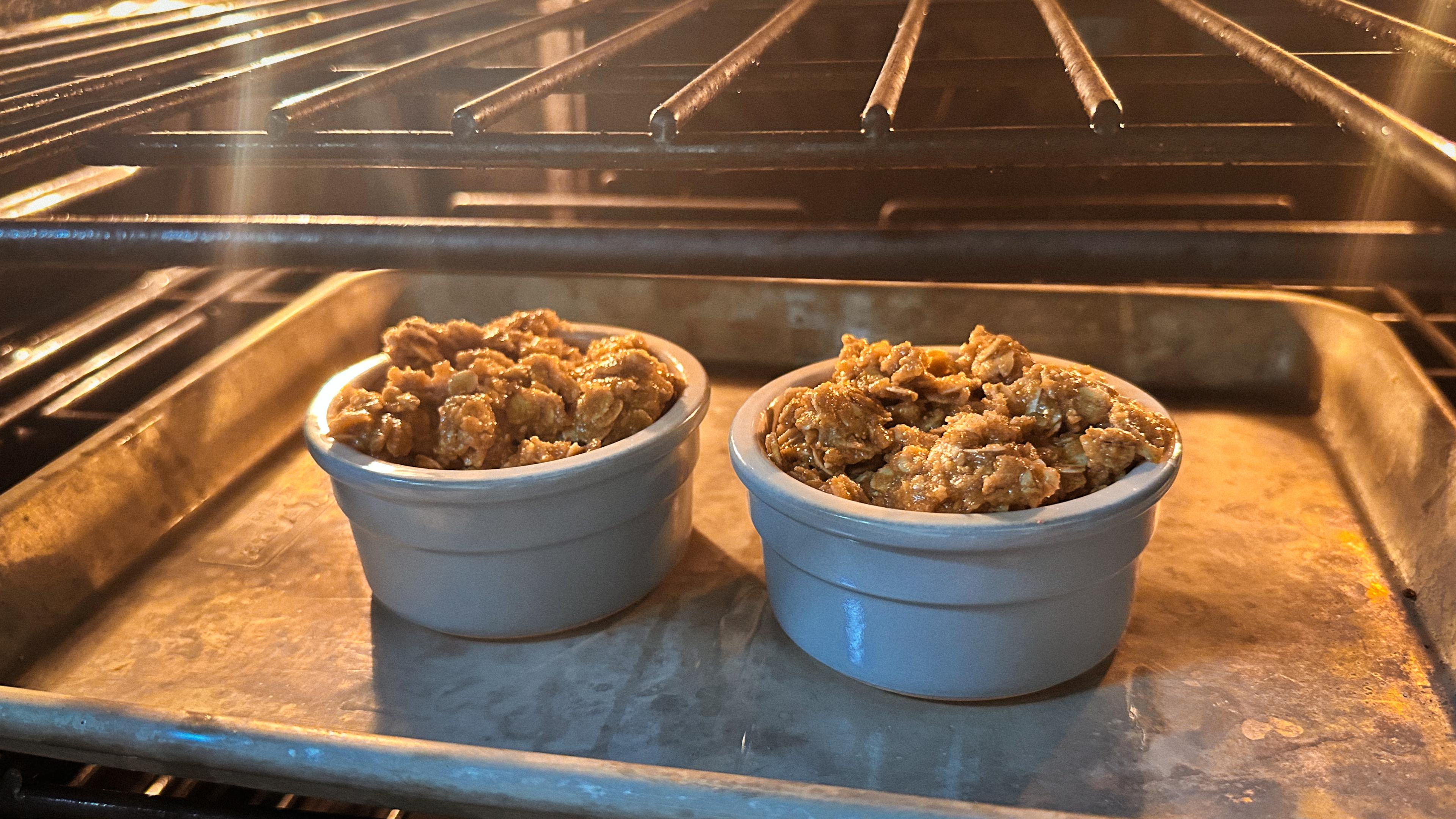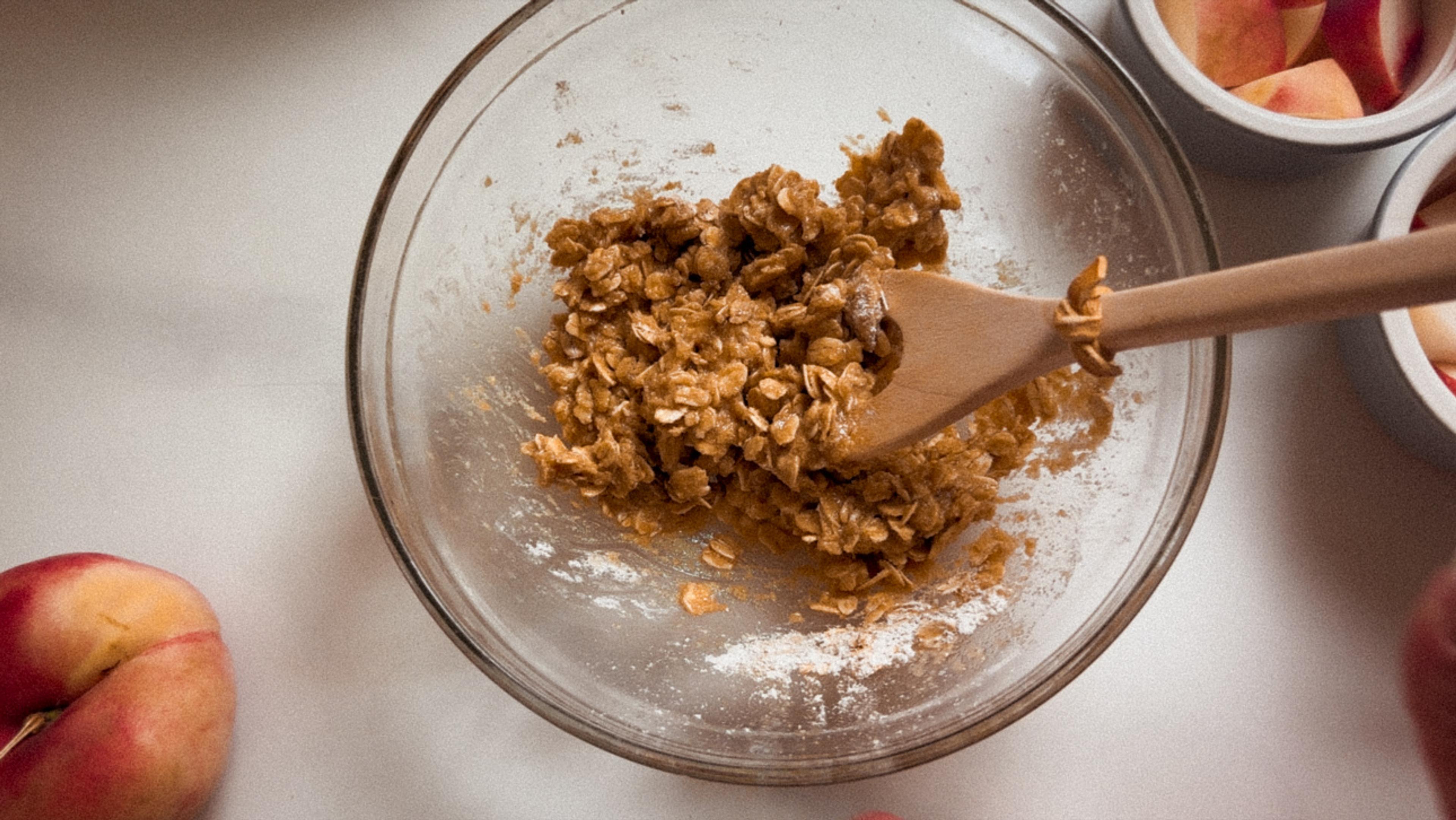 Peaches are the perfect fruit to pair with a with a crumble and cobbler. This seasonal recipe is a lighter take on a classic dessert with less sugar and butter, while packing in fiber from whole wheat oat flour and oats. Serving these in ramekins keeps portions in check.