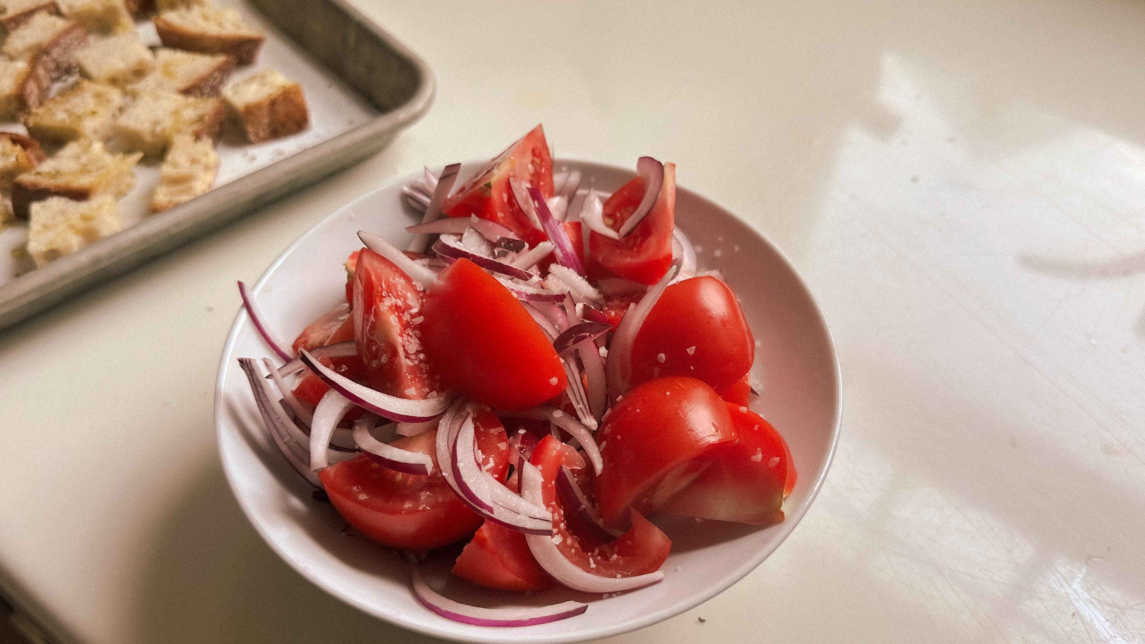 While bread is baking, sprinkle some salt over tomatoes and onions.