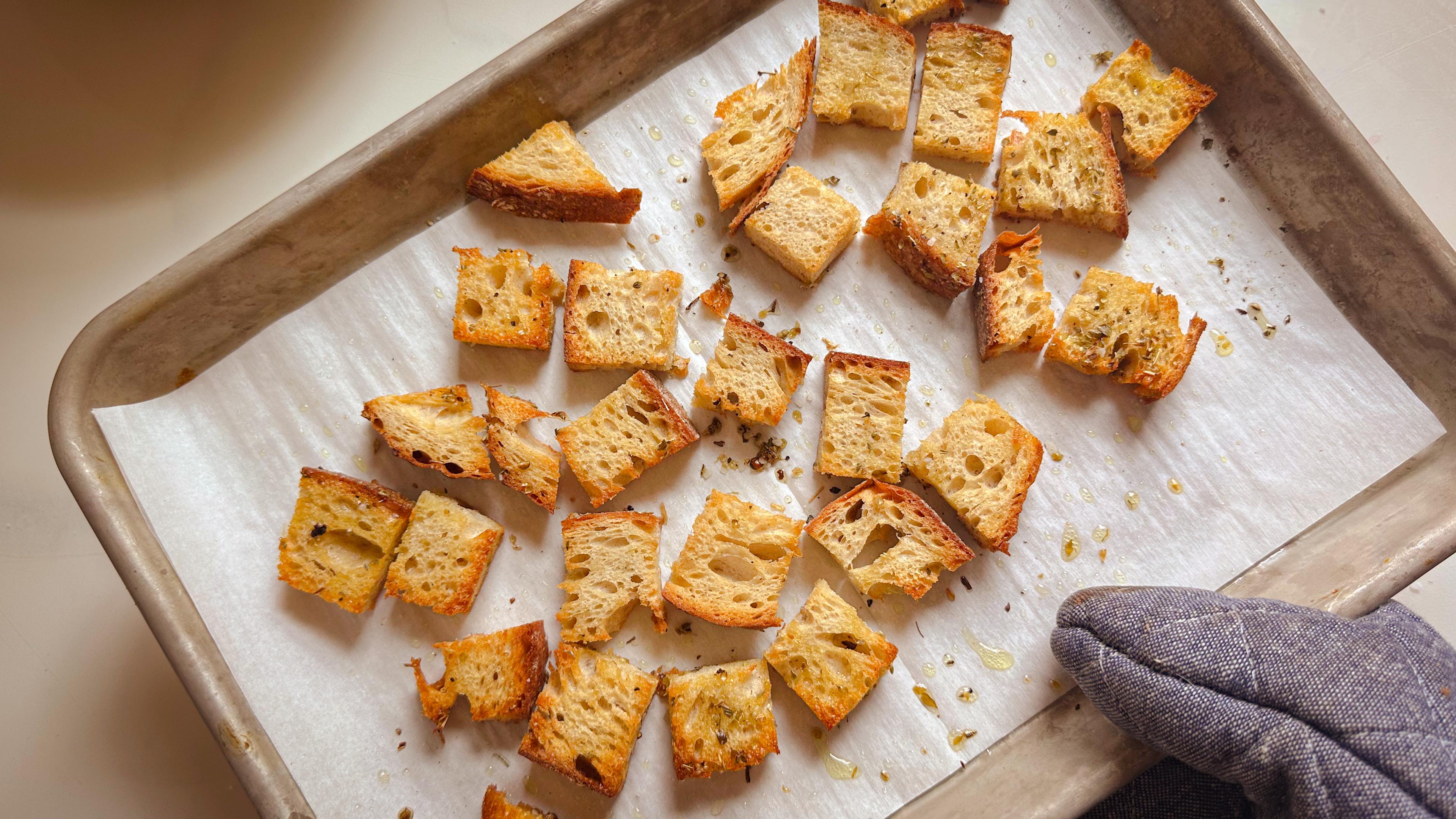 In a bowl, toss cubed sourdough with 2 tablespoons of olive oil along with oregano, salt and pepper. Place tossed bread on a lined baking sheet and bake for 10-15 minutes until crisp and golden.