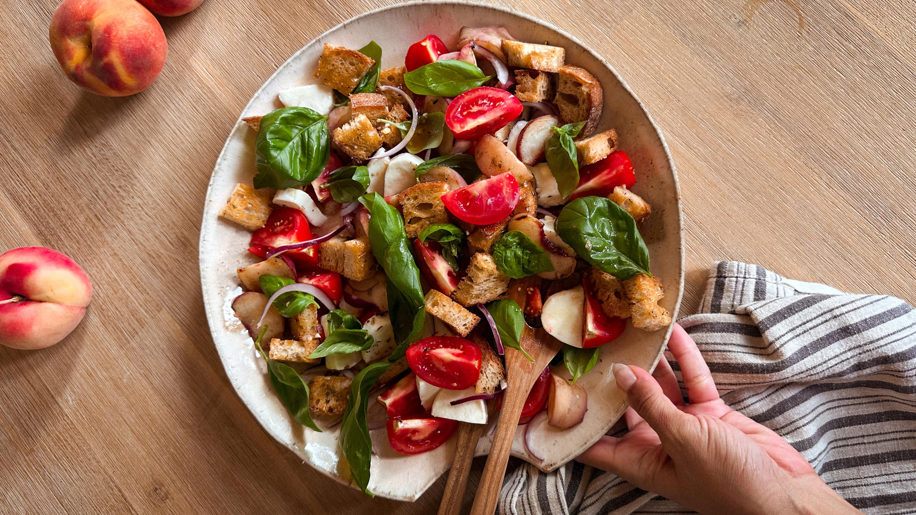 In a large bowl, combine tomatoes, onion, mozzarella, toasted bread, grilled peach slices and basil. Toss with dressing and serve immediately so the bread doesn’t get soggy.
