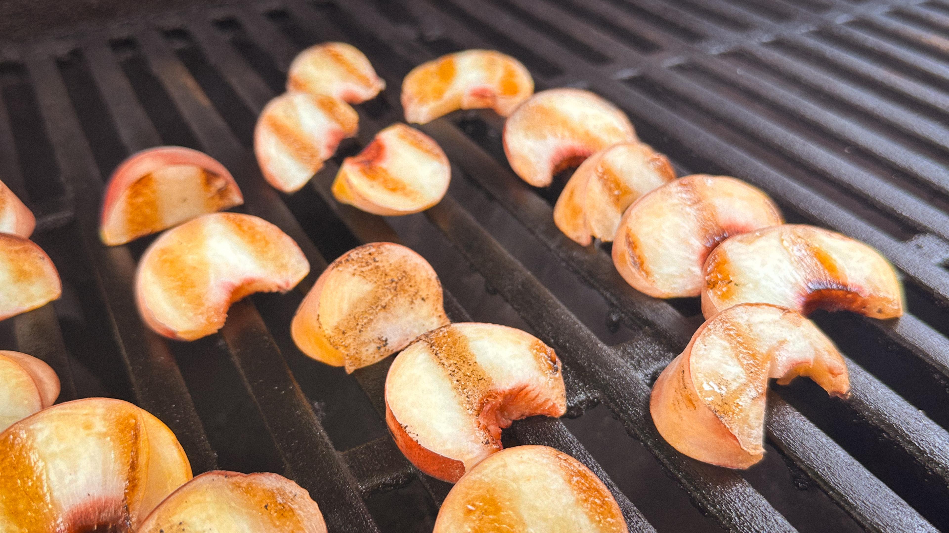 Once grill is hot, grill peaches for 2 minutes on each side until lightly charred.