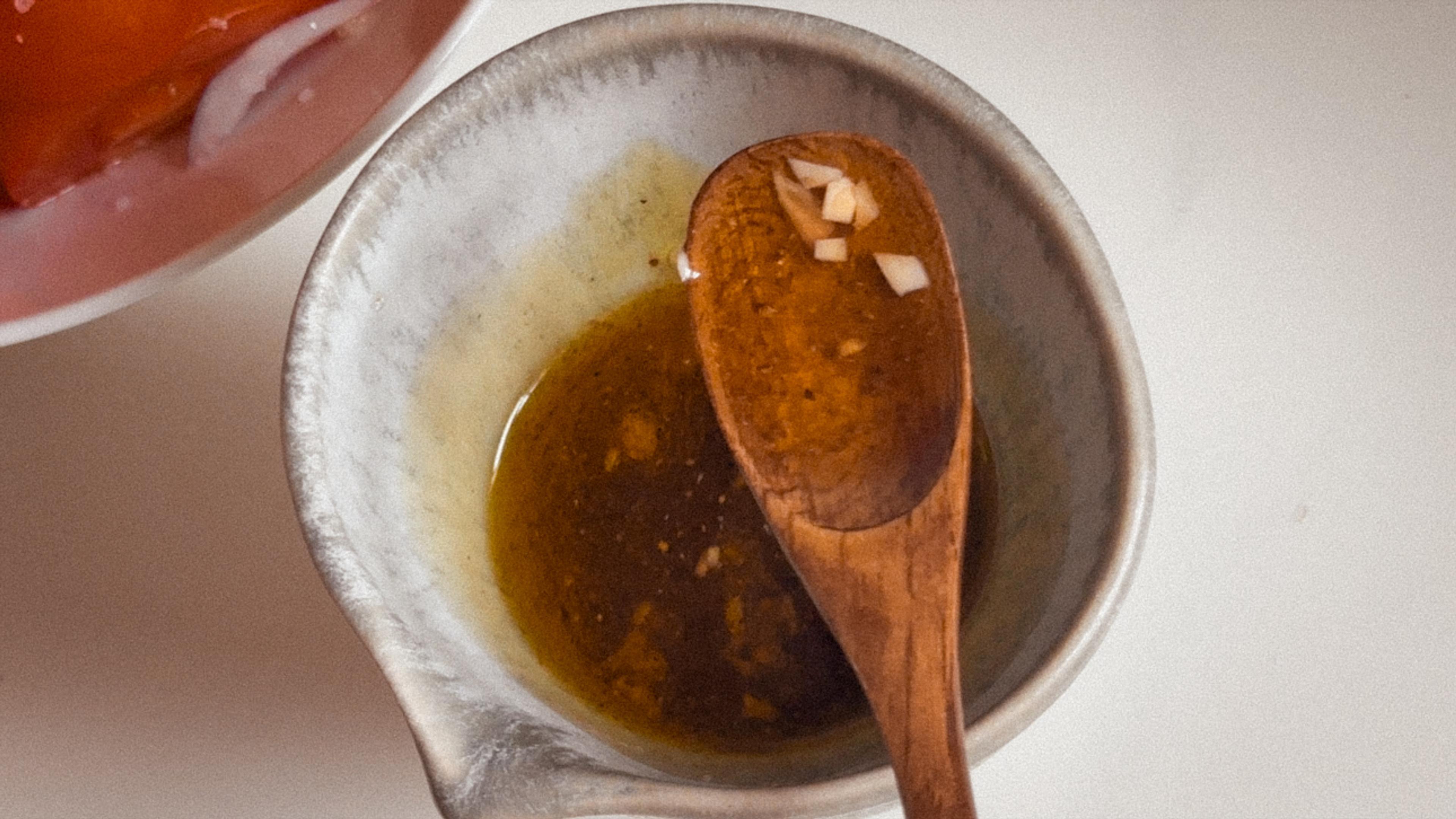 Make the dressing by combining 4 tablespoons of olive oil, 1 tablespoon of red wine vinegar, minced garlic along with salt and pepper to taste.