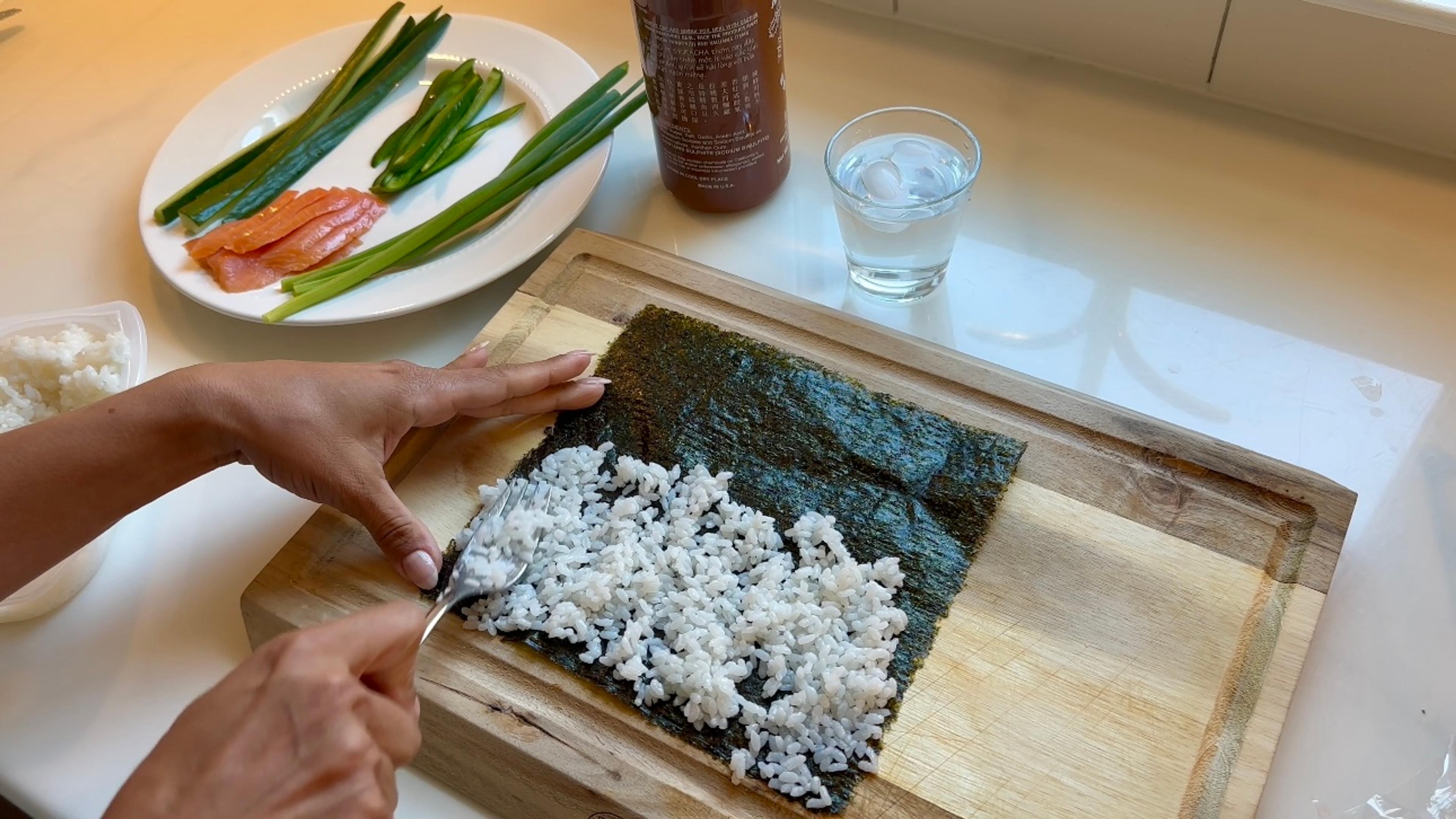 Dip fingers in water, then add ~1/3 cup sticky rice on a nori sheet. Spread on about half of the nori sheet.
