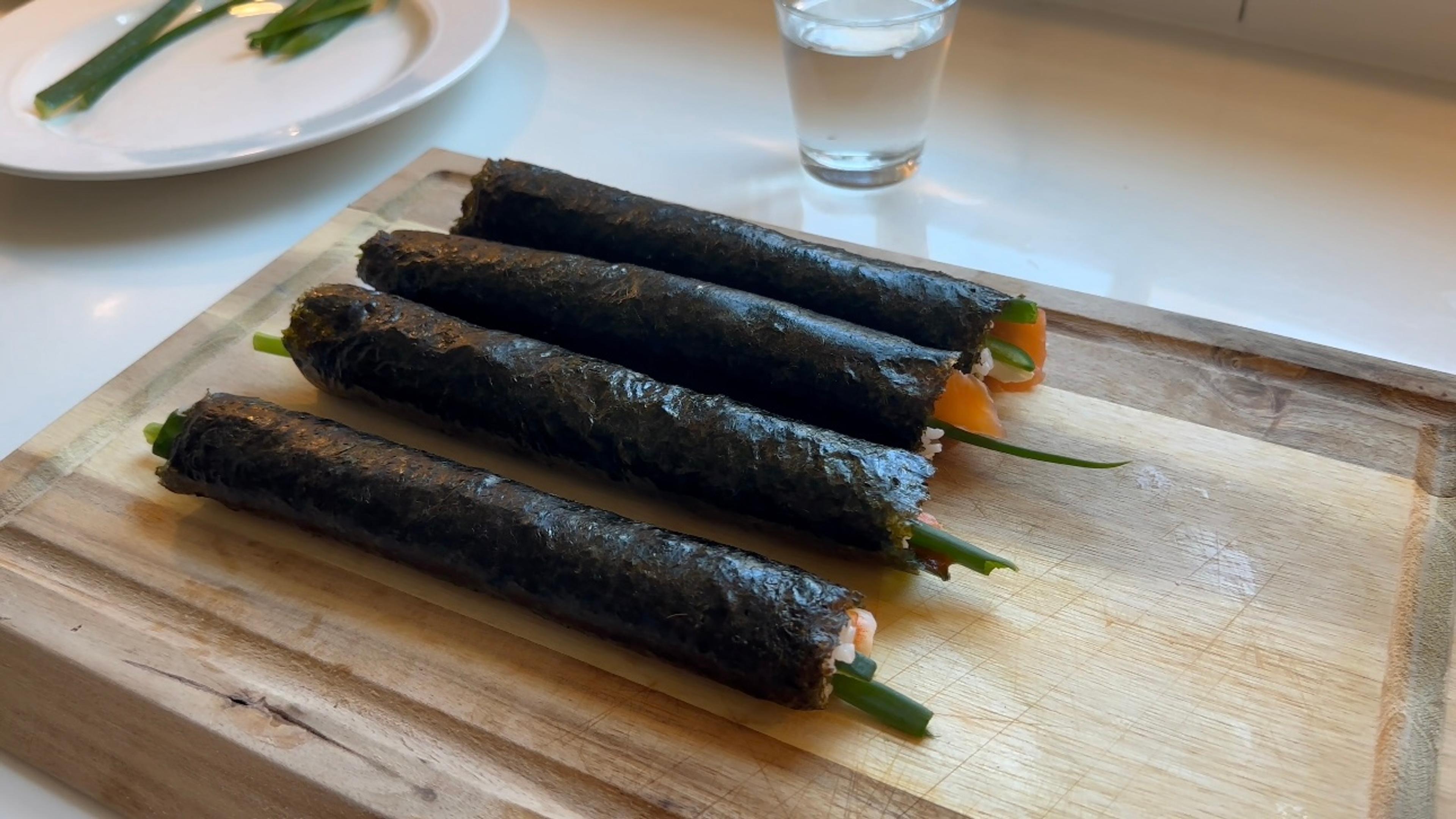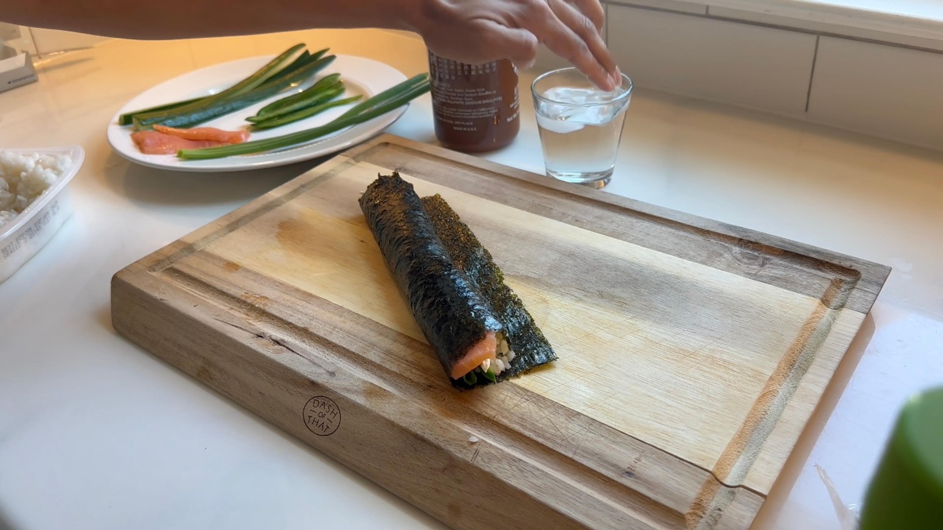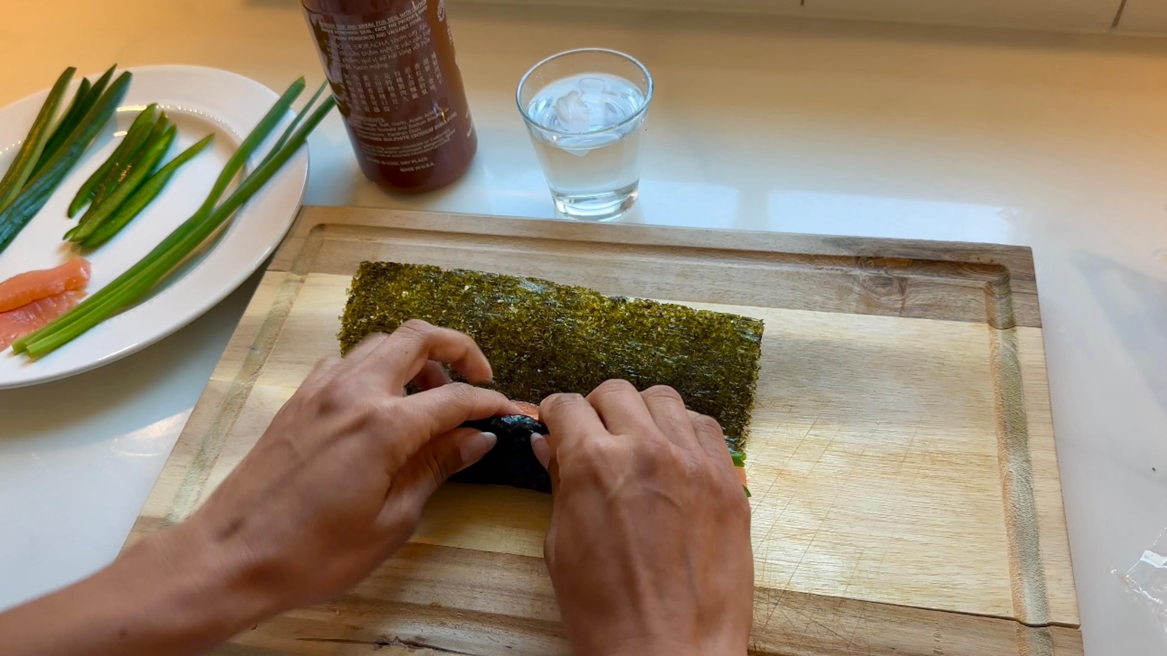Tightly start rolling the nori until there’s about an inch left exposed. Dip your fingers in water and run along the edge of the nori, then finish rolling. This will help the roll seal.