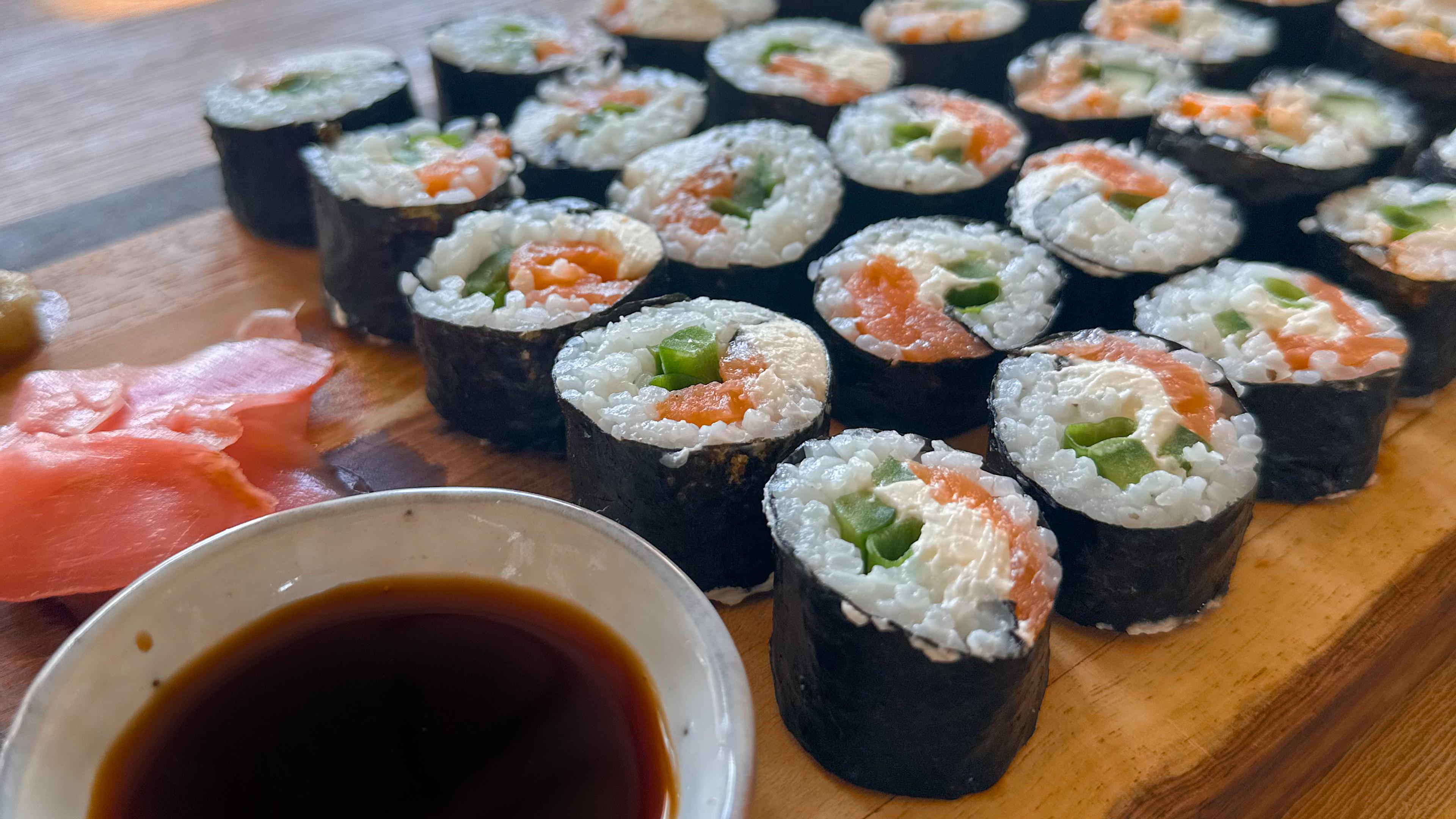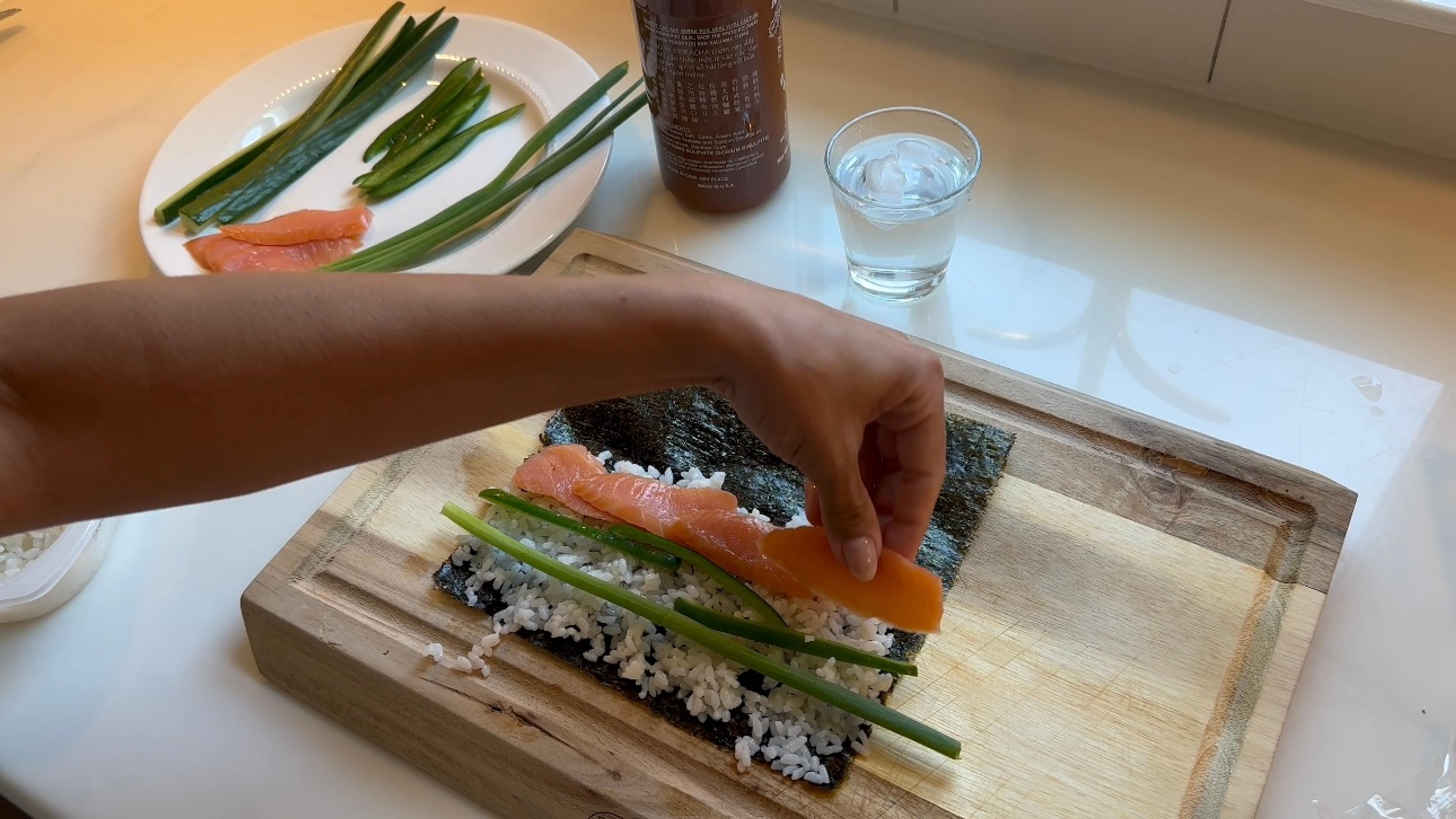 Line slices of smoked salmon, one green onion sprig, a line of cream cheese and a line of jalapeño strips on top of the rice.