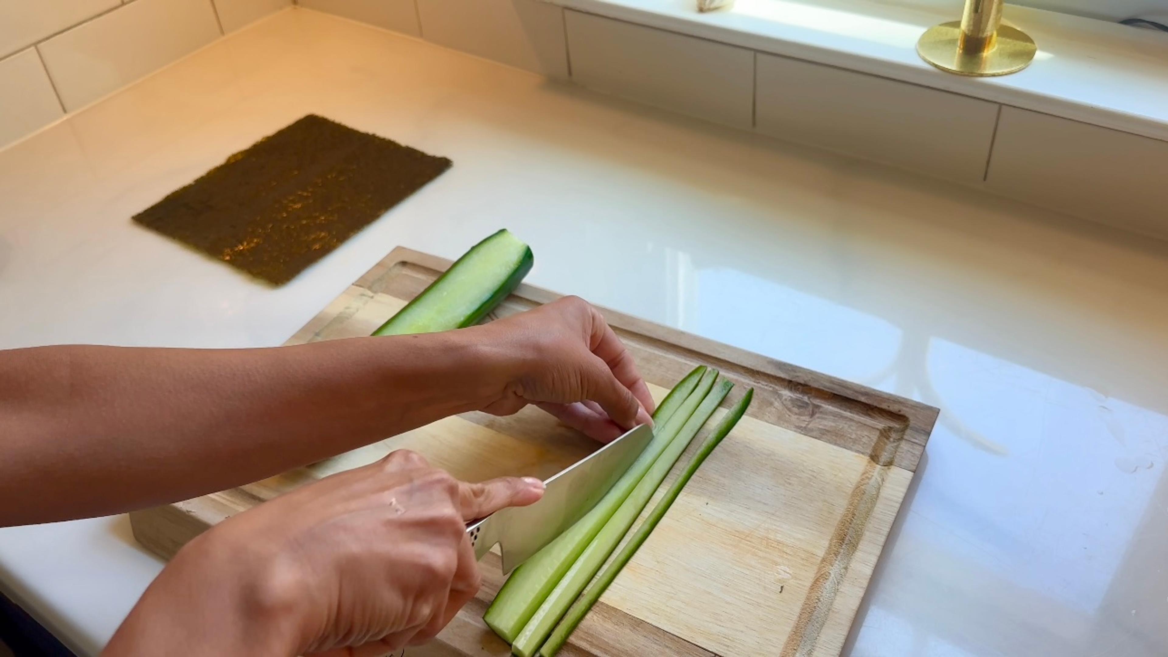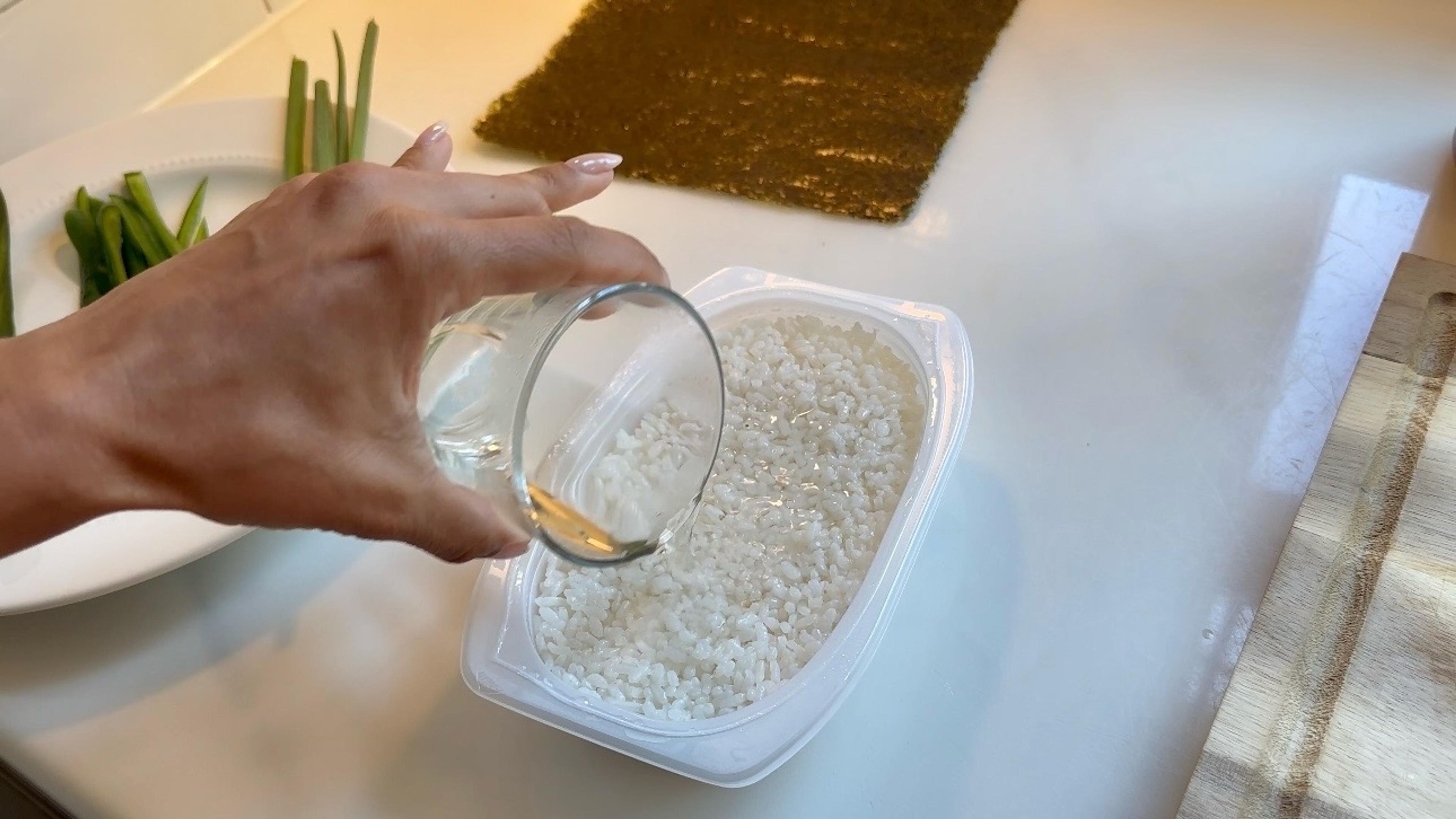 In a microwavable-safe dish, make the rice seasoning. Add rice vinegar, salt and sugar. Microwave for 30 seconds to allow ingredients to dissolve.