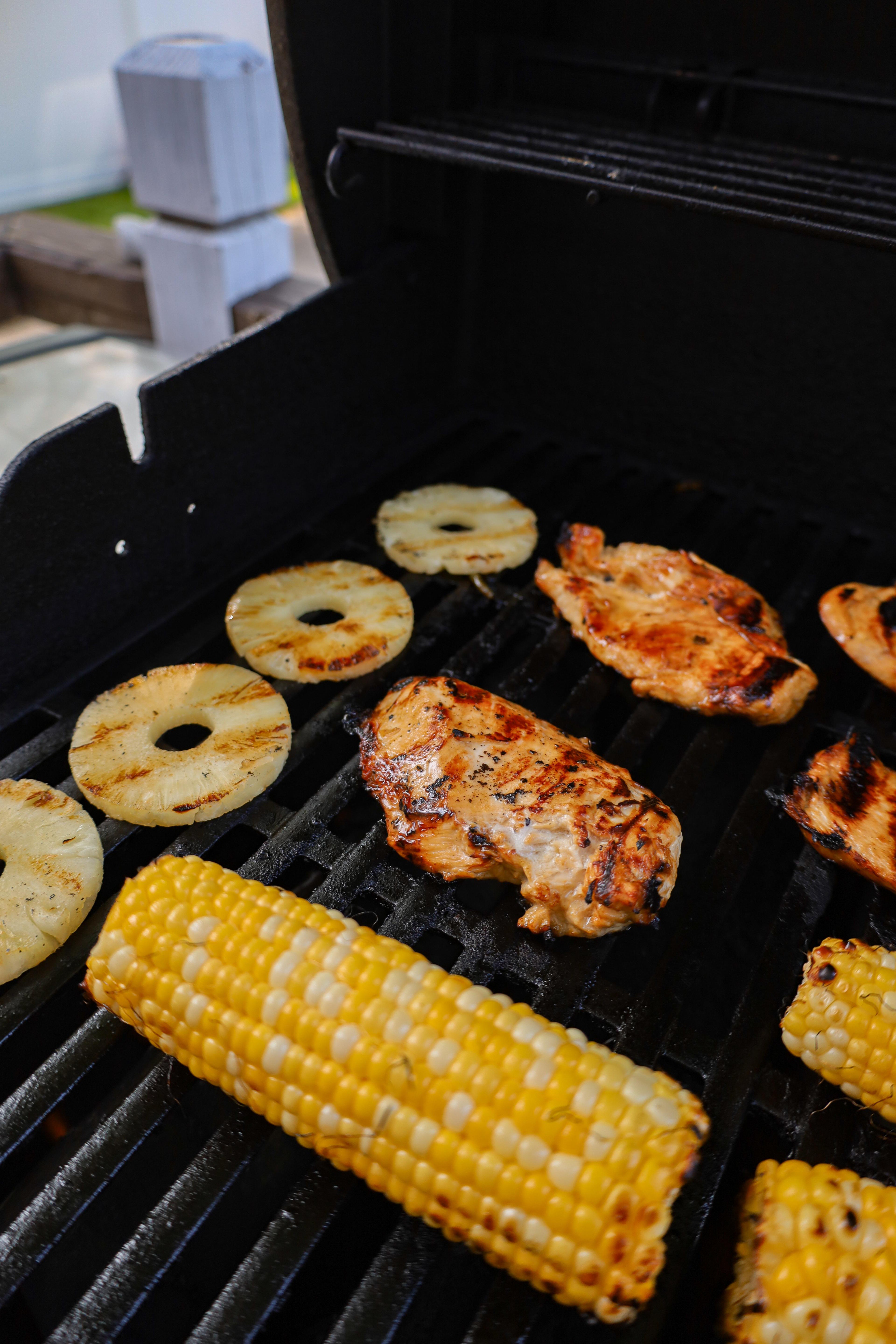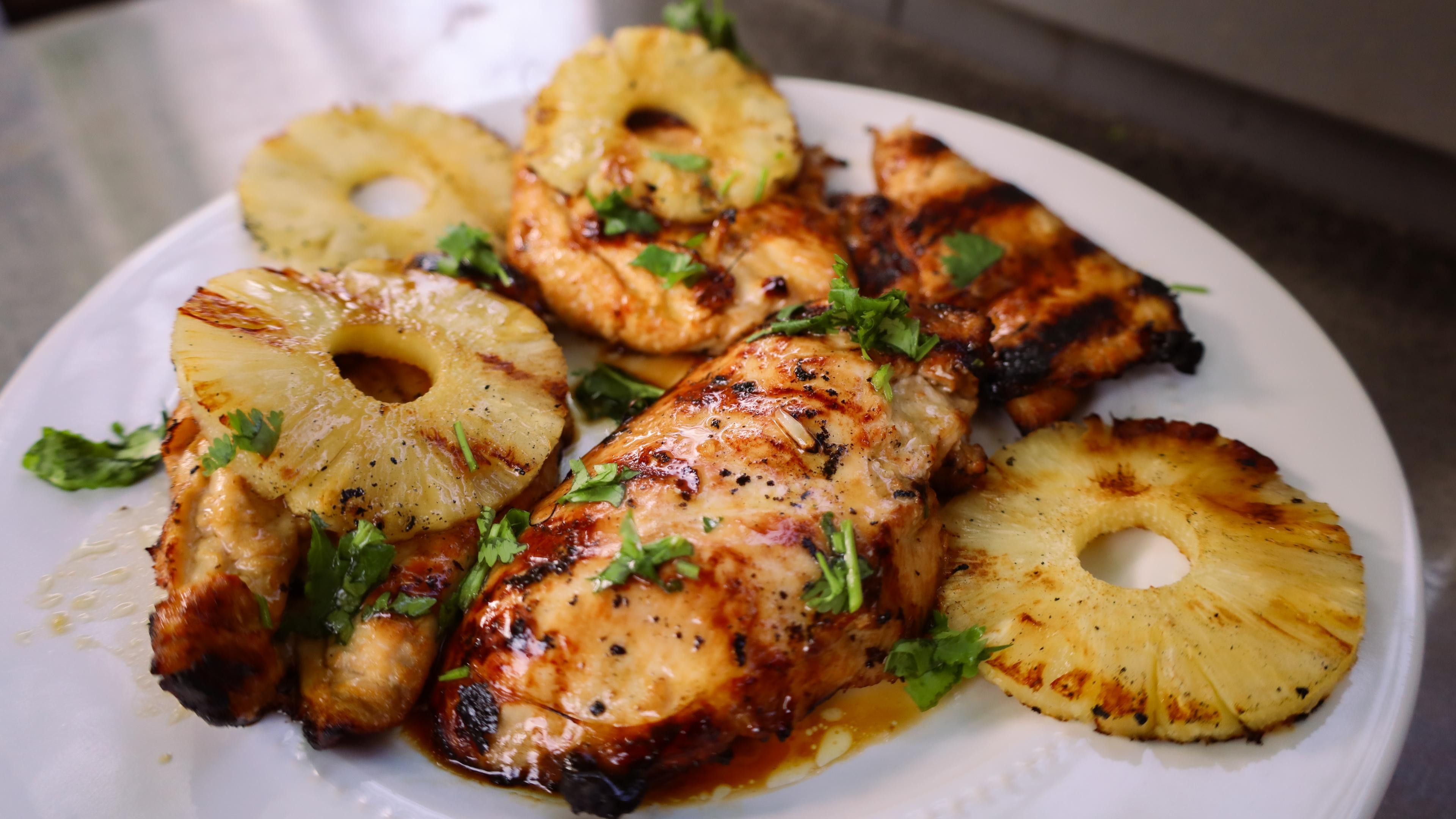 Oil grates. Once grill is hot, add chicken. Grill on each side until internal temperature reaches 165 degrees F. When chicken has about 10 degrees left to go, brush over reserved marinade and add sliced pineapple to grates and grill on each side until golden grill marks appear.