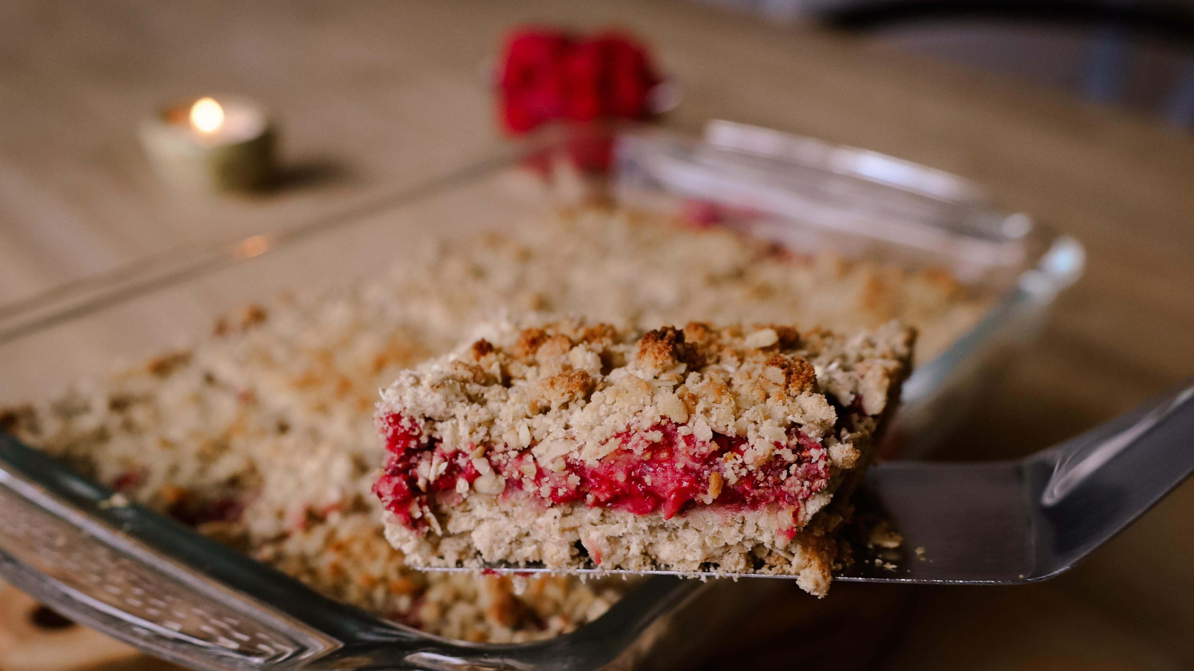 Crumble the remainder of dough evenly over top of filling. Bake for 40-45 minutes or until golden brown.