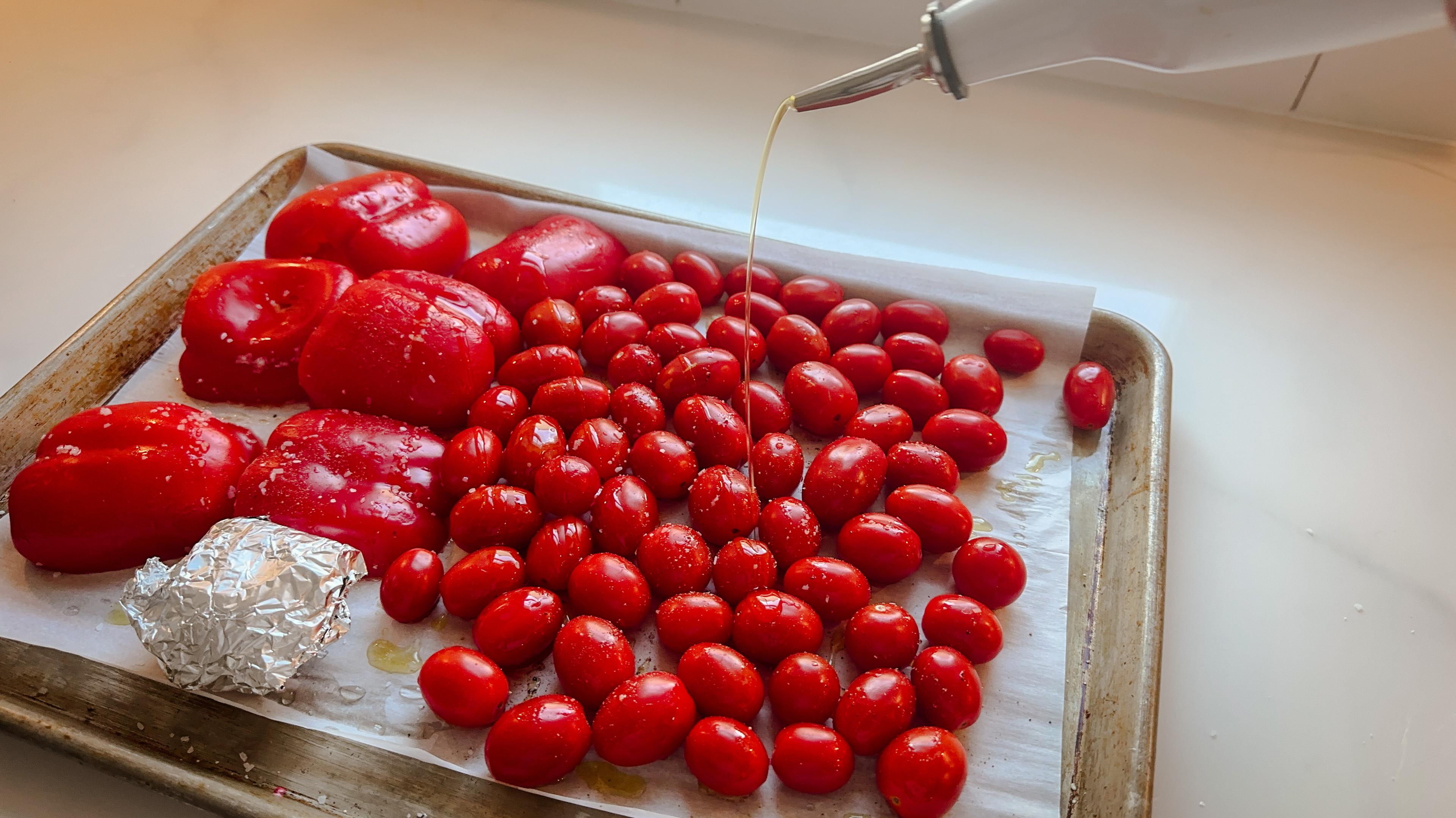 Add tomatoes to baking sheet. Season the vegetables with a drizzle of 2 Tbsp. of olive oil and salt and pepper.