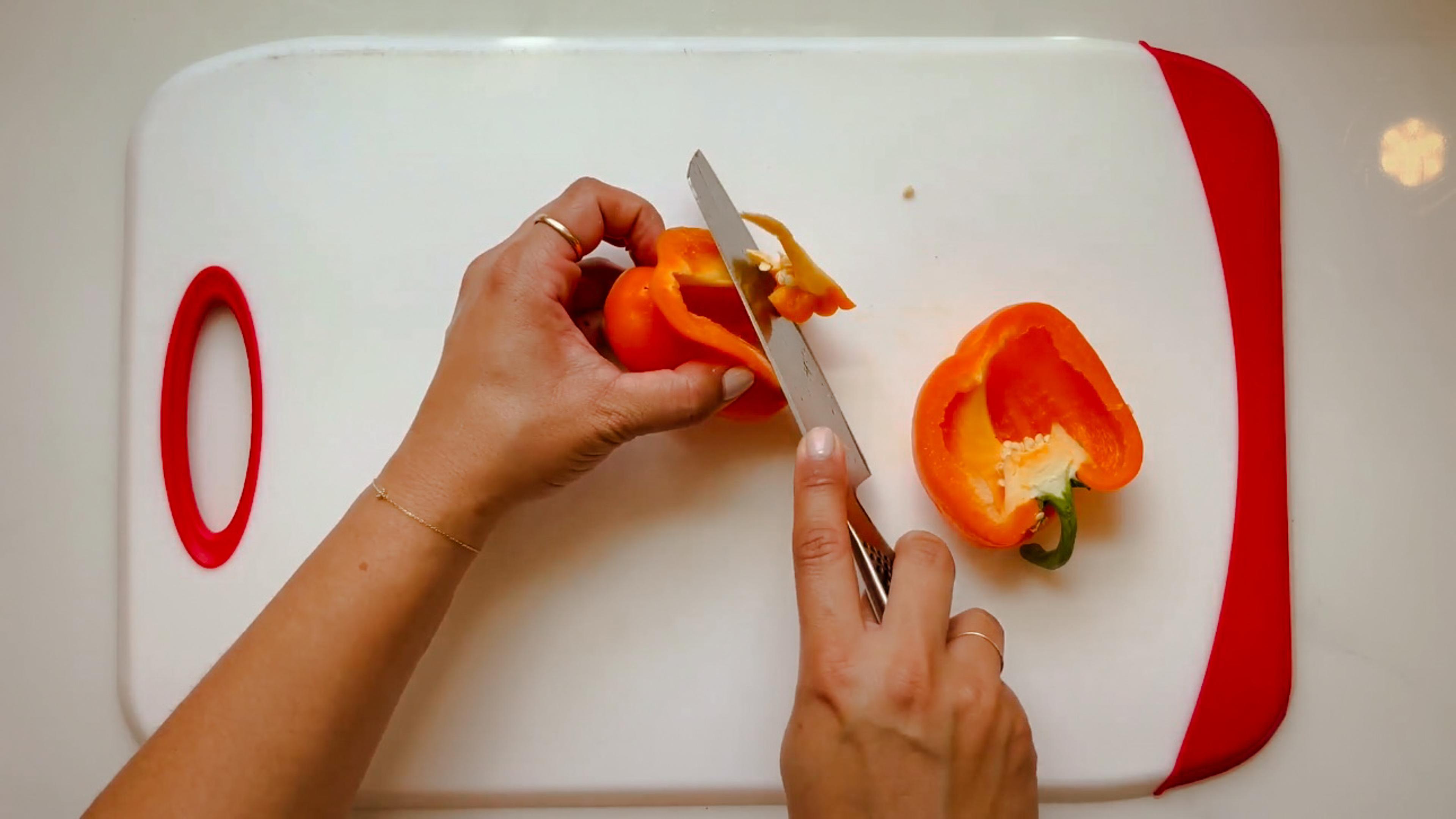 Cut bell peppers in half, removing seeds, core and membrane. Add to prepared baking sheet face down.
