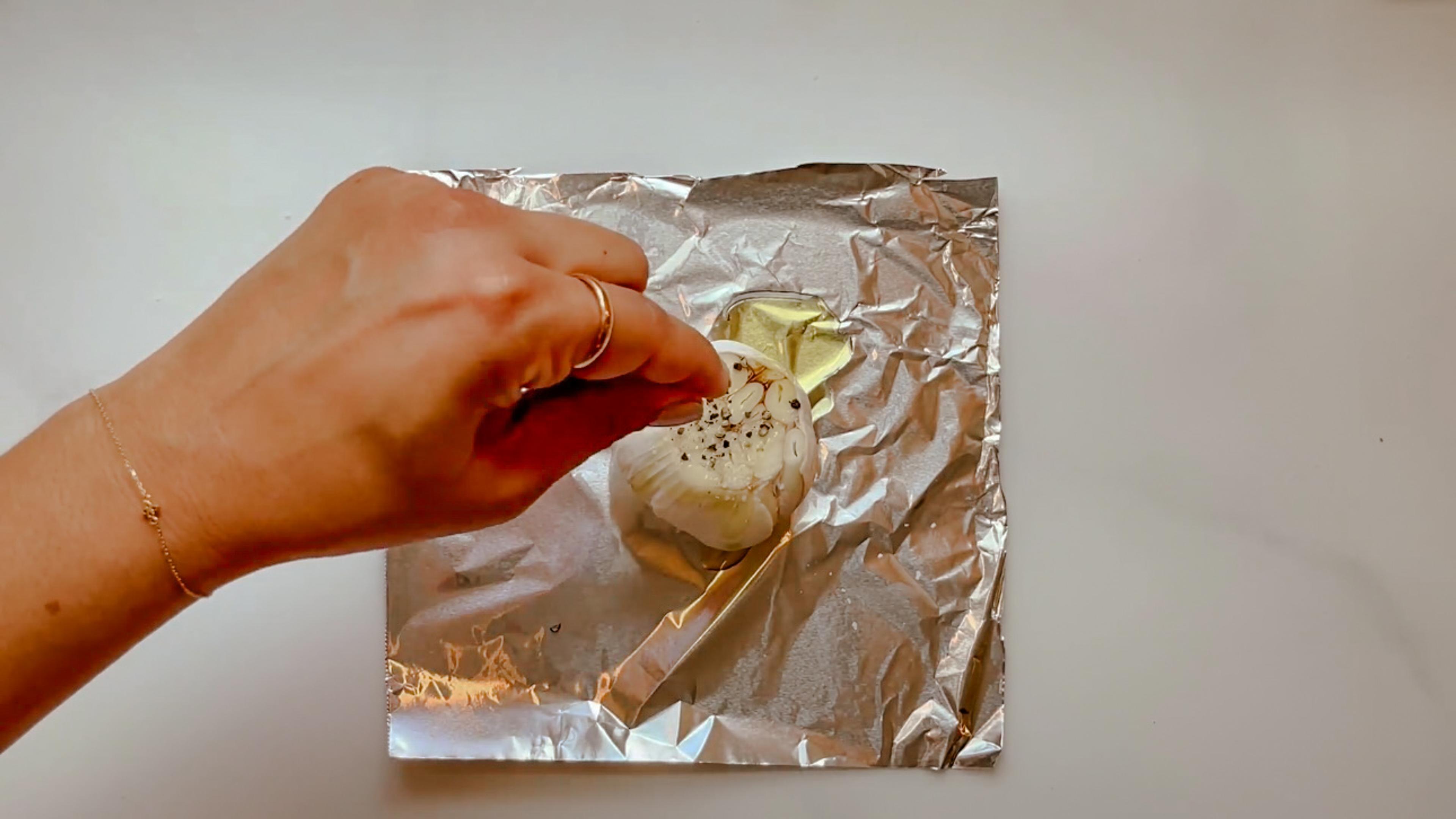 Cut the top of the garlic head off to expose a small part of the garlic clove. Drizzle with olive oil and season with salt and pepper. Wrap garlic head in aluminum foil and place on baking sheet.
