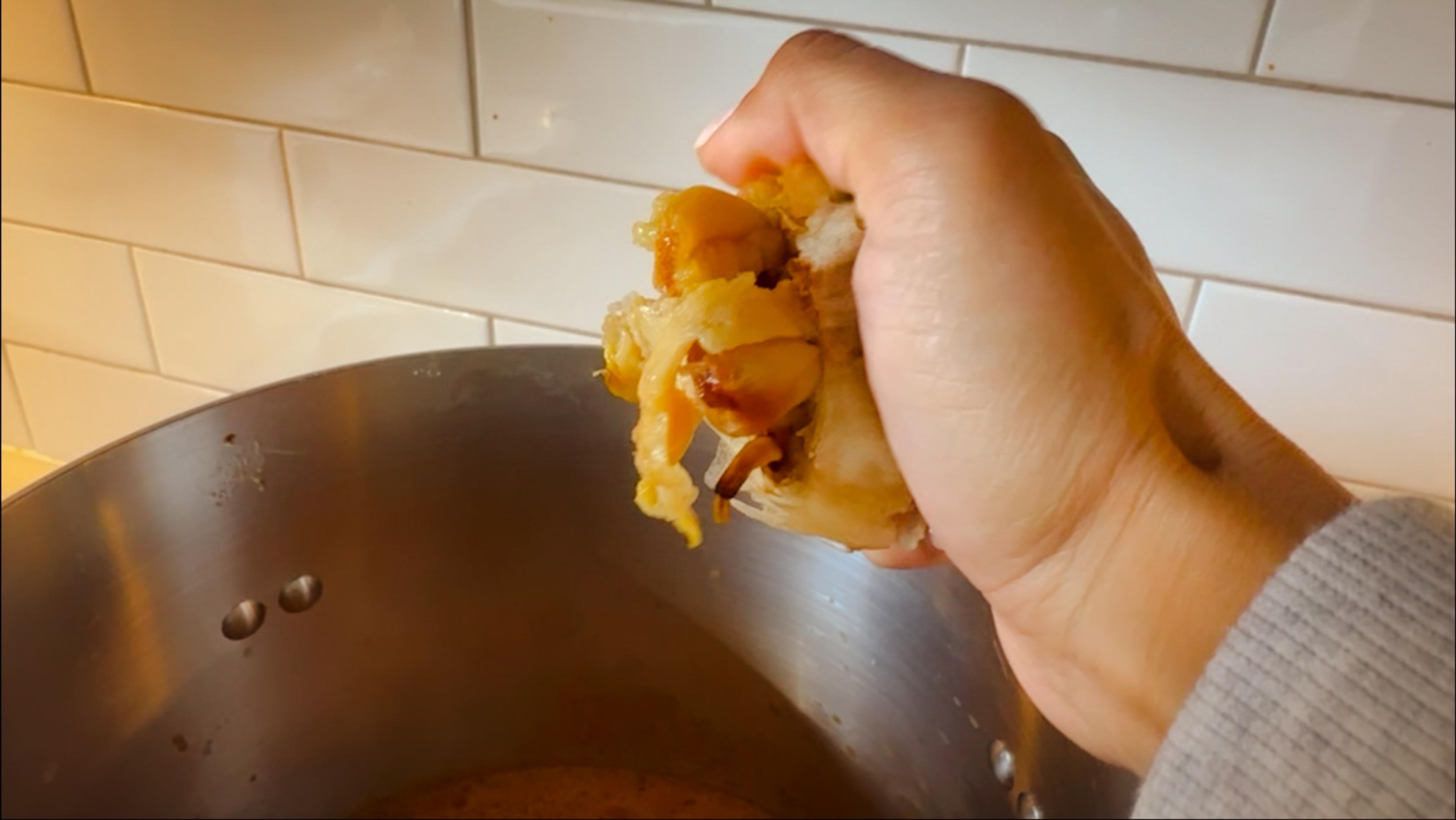 Once garlic is cooled, squeeze garlic cloves into the pot and add coconut milk, reserving 2 Tbsp for drizzling.